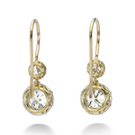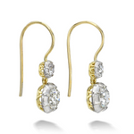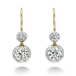 18K White and Yellow Gold Double Old Euro Drop Earrings A beautiful pair of double Old Euro Drops set in 18k Yellow and White Gold on a French wire. Old Euro Cut: Such rare and romantic diamonds were cut by hand between 1890-1930. Originally set by candlelight, the stone's facets were designed to reflect soft light. The facets also display intense dark and light shadow producing incredibly deep dimensions. Poetic, dreamy and difficult to procure. 18k WG and YG - 2.77tcw Bottom .61 Top - Natural Old Euro Diamonds |
