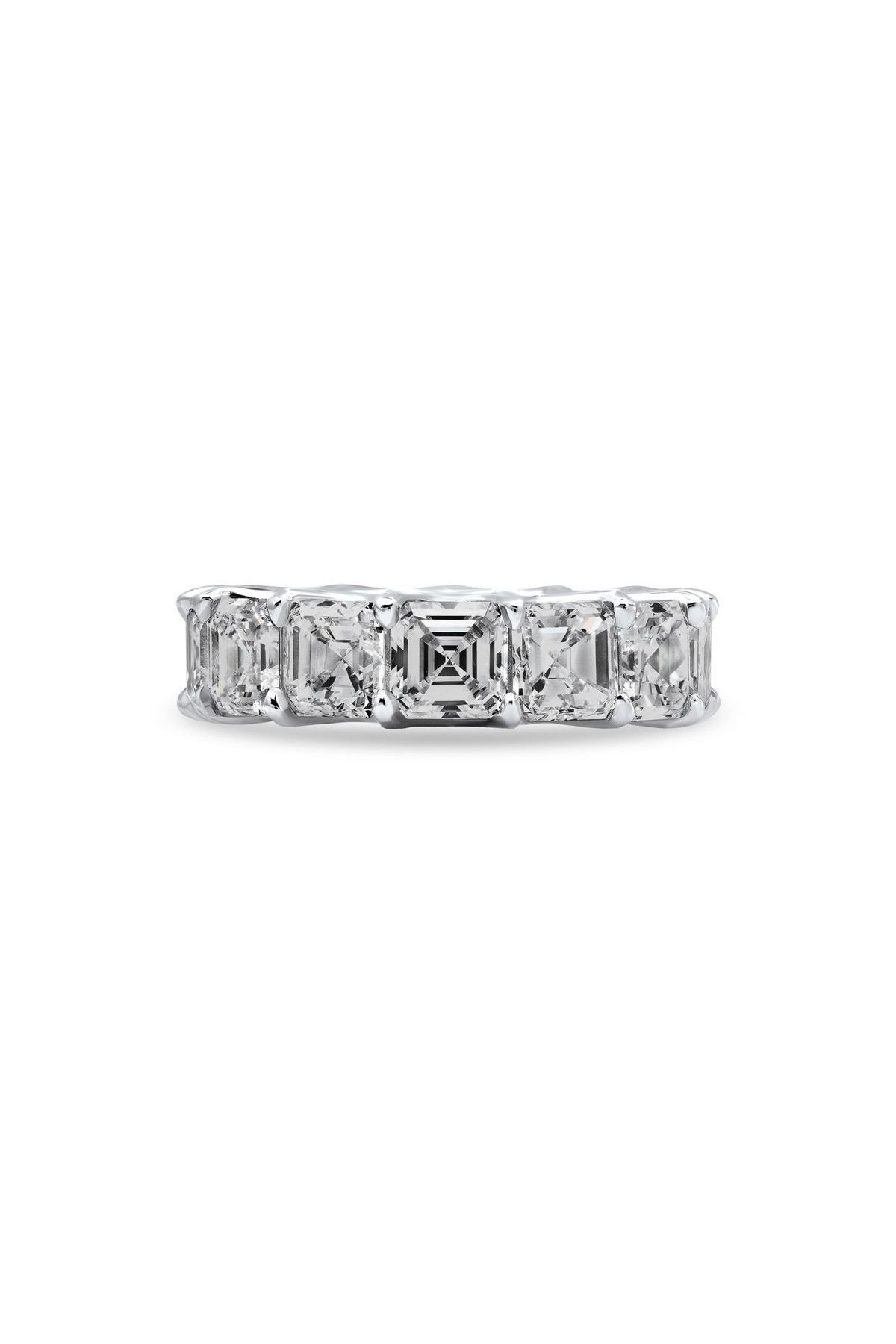 Coady Culha "Demi" Asscher Cut Diamond Eternity Band set in our U-Shape Eternity Band Asscher Cut: The Asscher cut is the sister to the Emerald; both feature a large open table with long step facets, but where the Emerald is rectangular in shape the Asscher is square. Its corners are also cropped, defining the shape as an octagonal. A stone of many sides. As Shown: 10.4 Total Carat Weight 13 Stones, G Color, VS+ Clarity. |