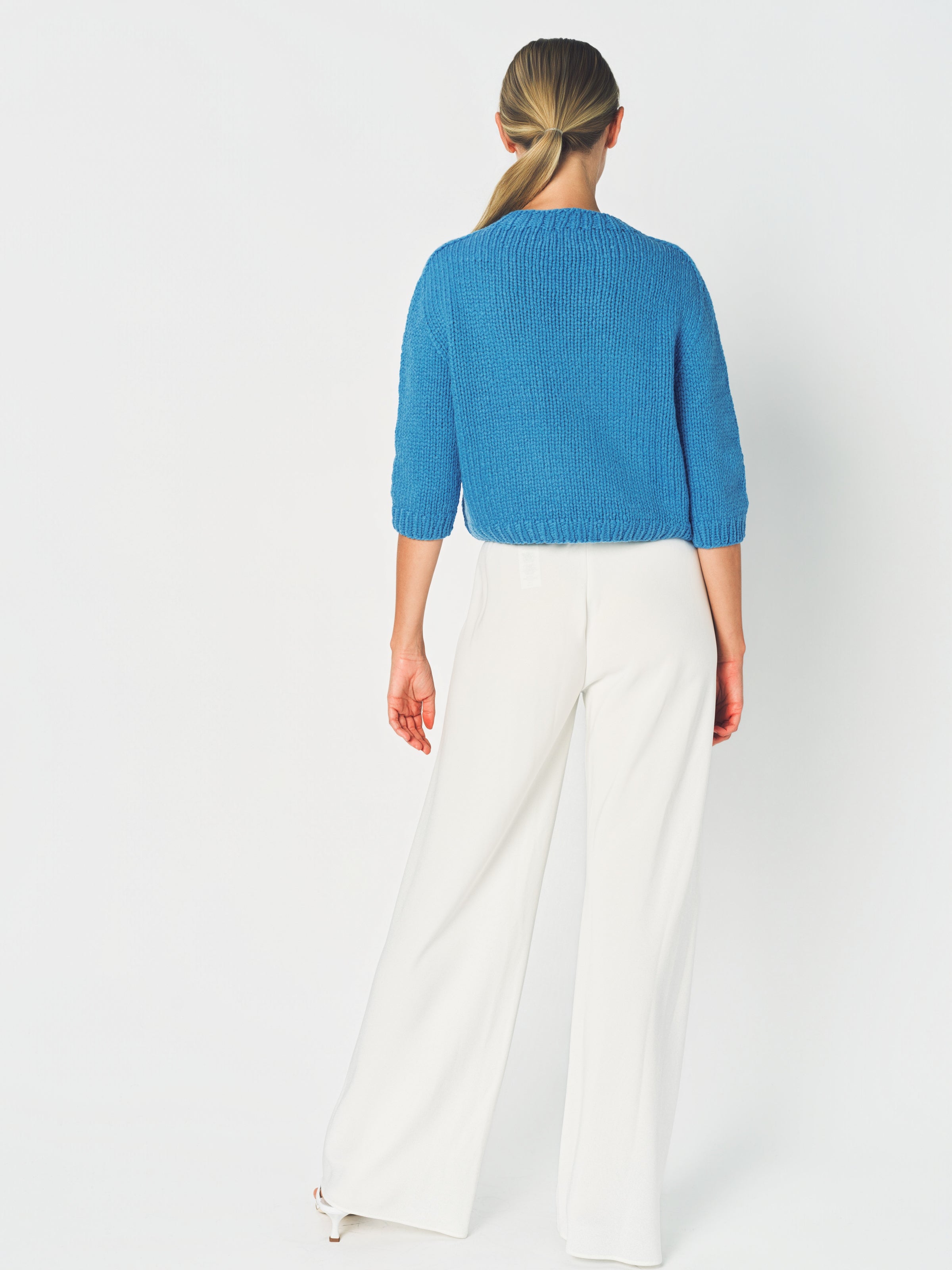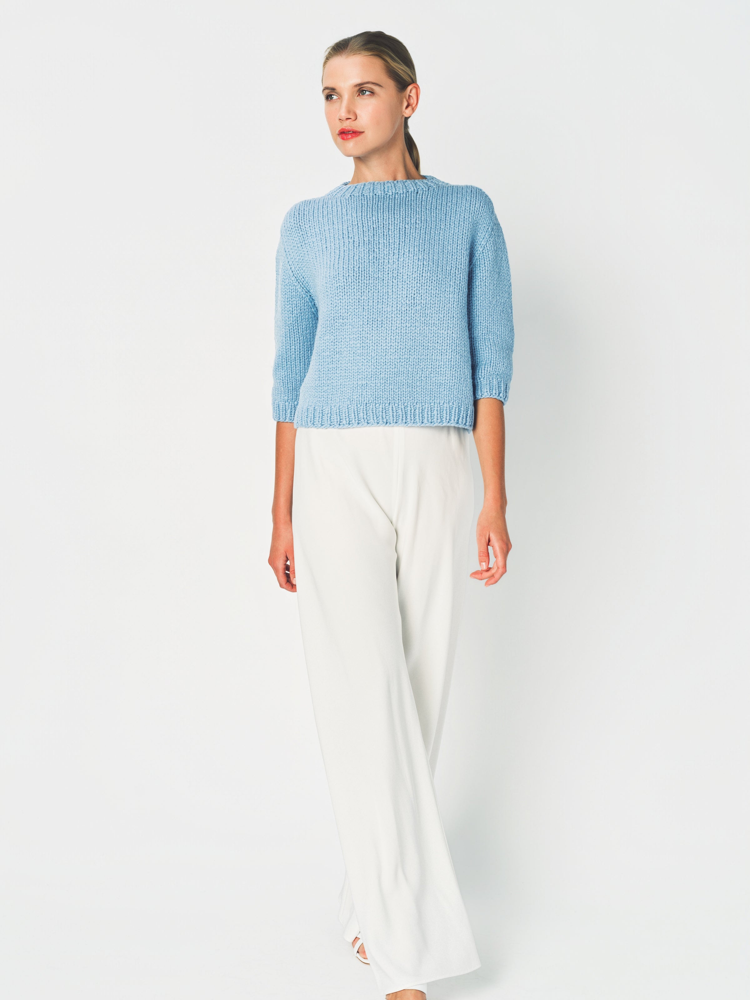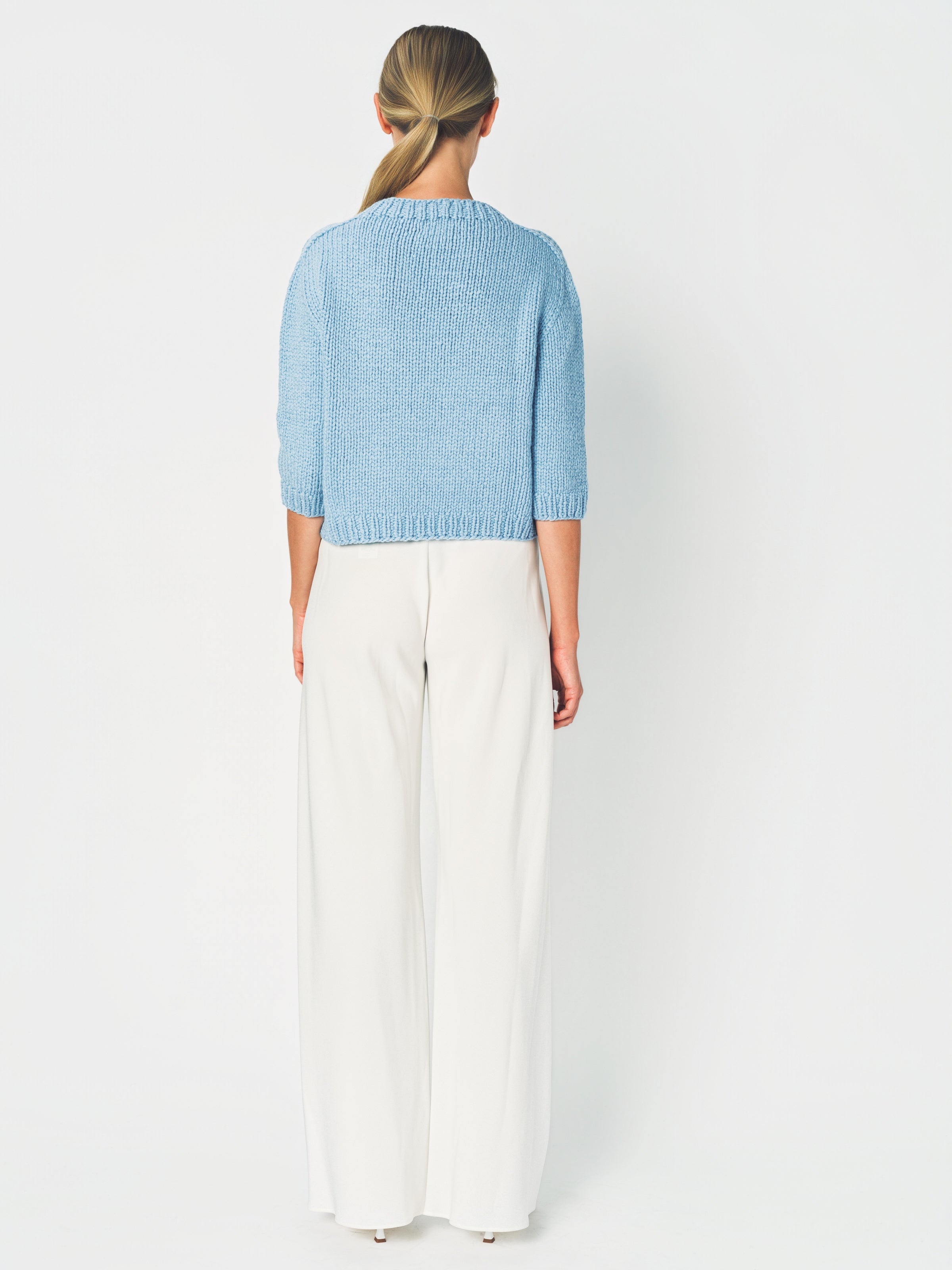The Wommelsdorff Maggy Sweater is a shorter sleeve crew neck piece meticulously hand-knitted in Berlin using premium cashmere yarns. It features ribbed trim details at the neckline, cuffs, and hem, with a relaxed boxy fit for a modern silhouette.