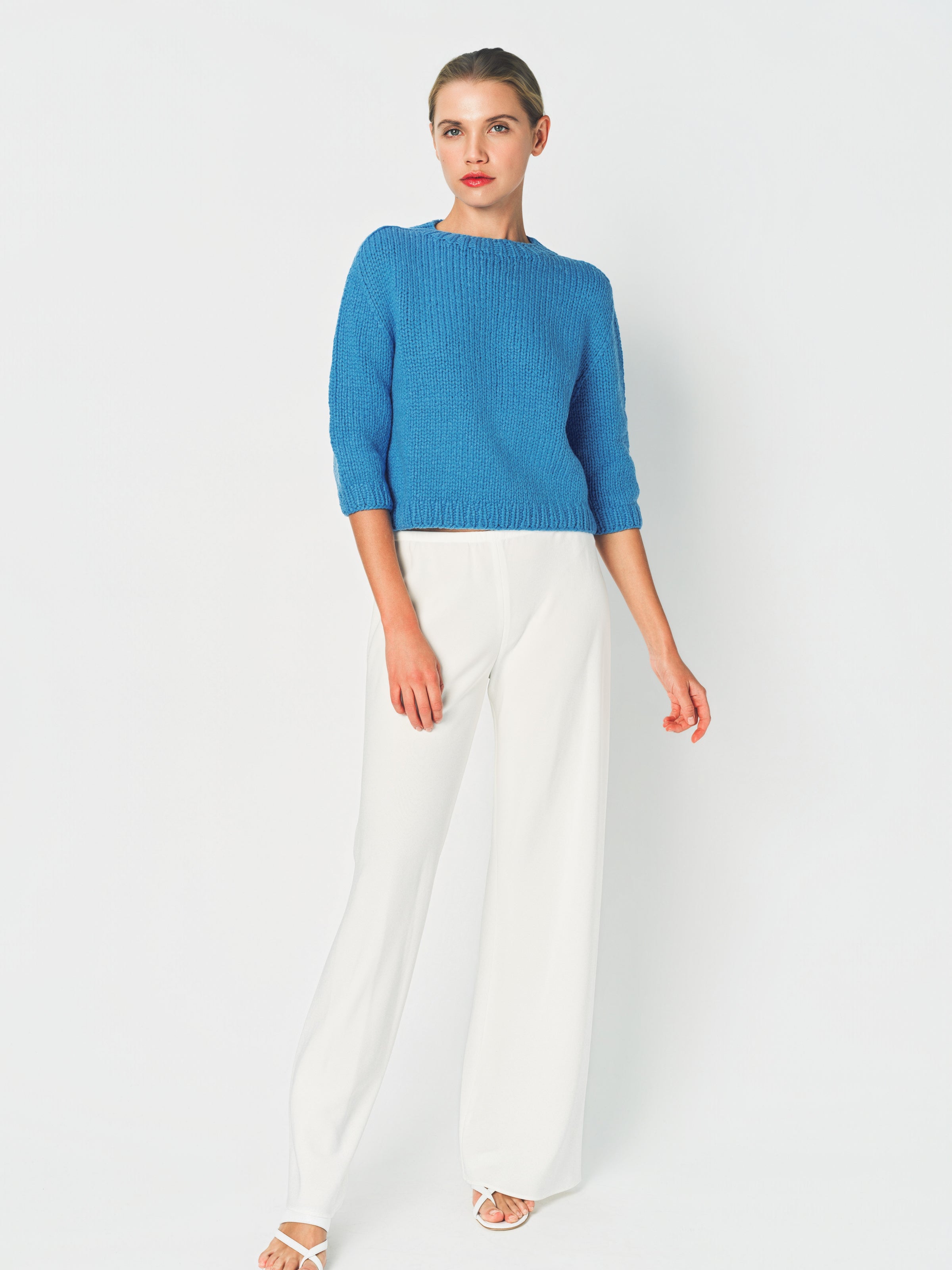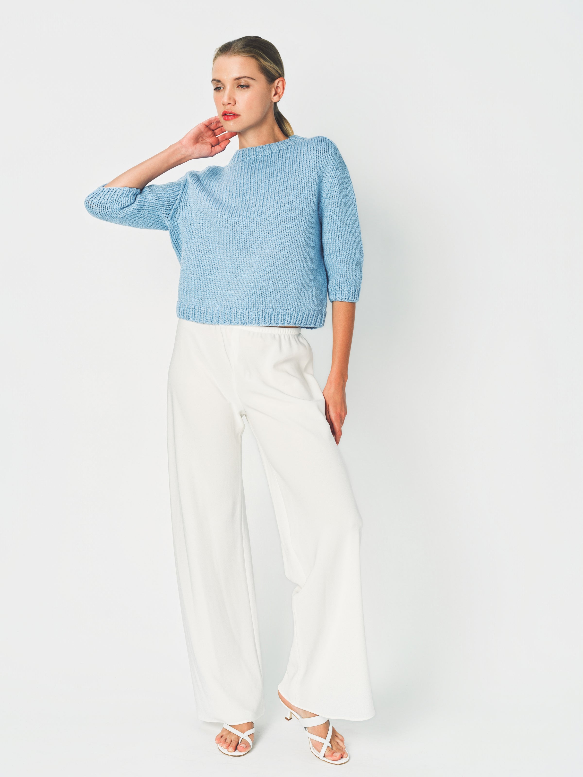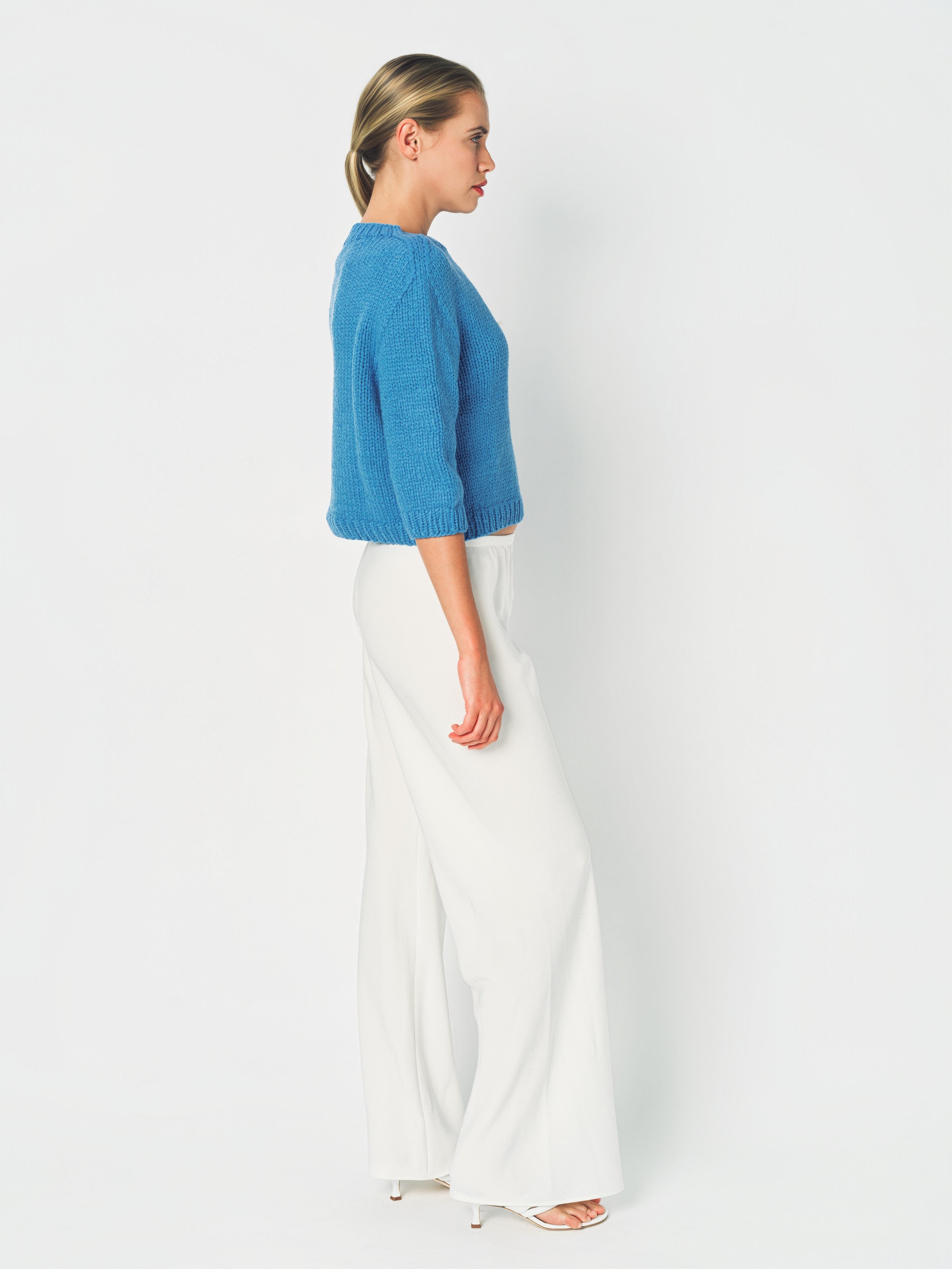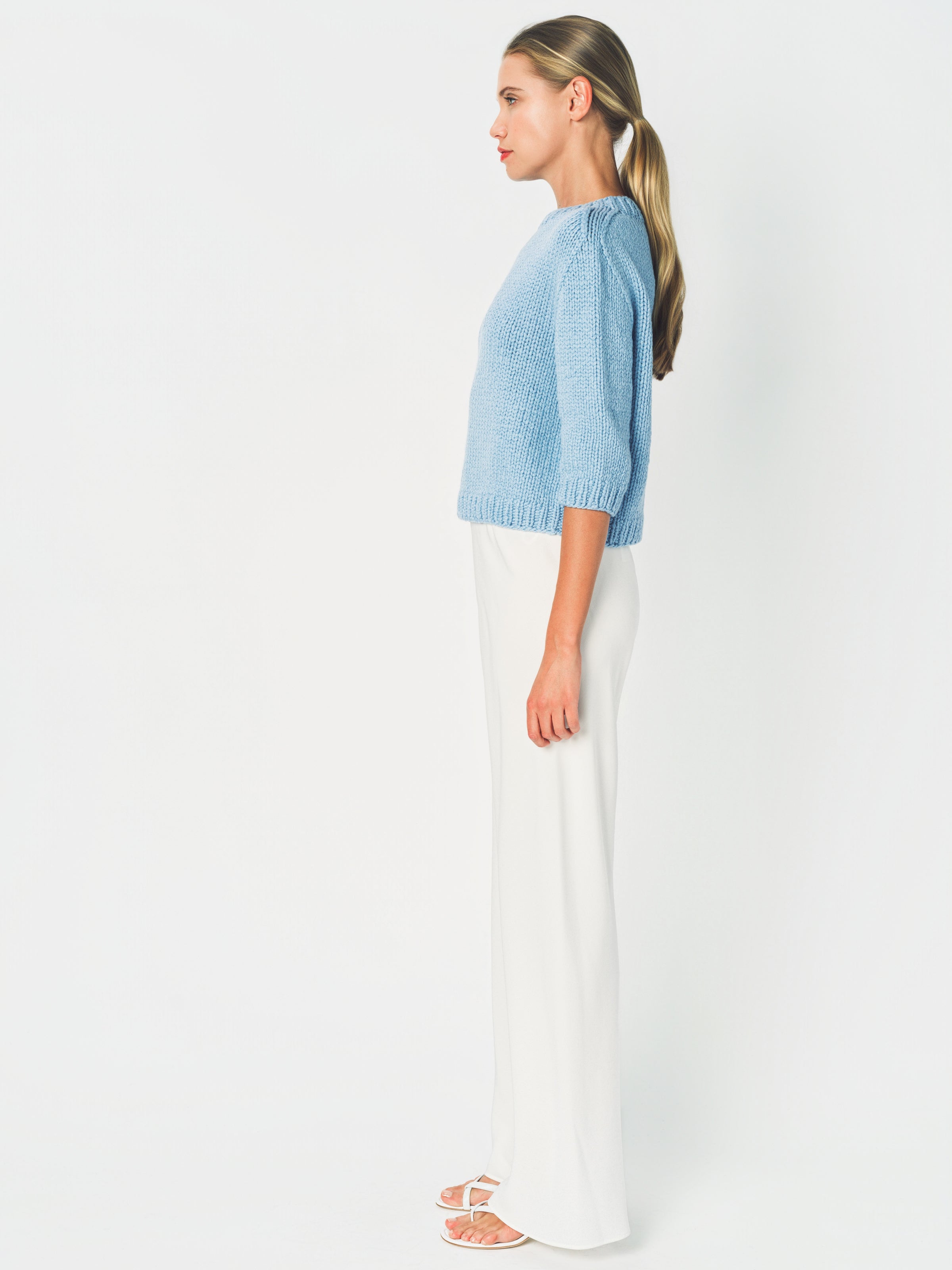 The Wommelsdorff Maggy Sweater is a shorter sleeve crew neck piece meticulously hand-knitted in Berlin using premium cashmere yarns. It features ribbed trim details at the neckline, cuffs, and hem, with a relaxed boxy fit for a modern silhouette.