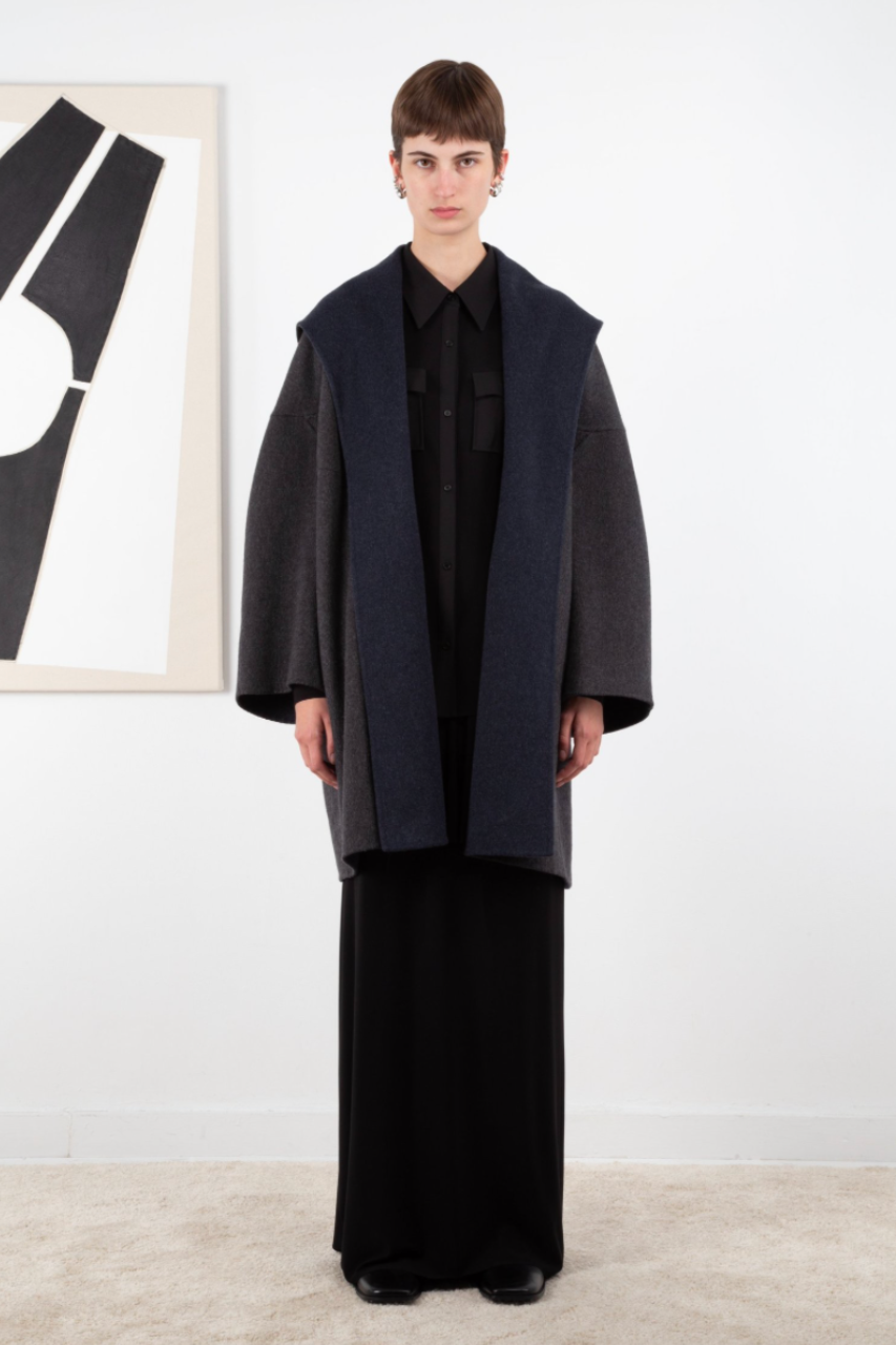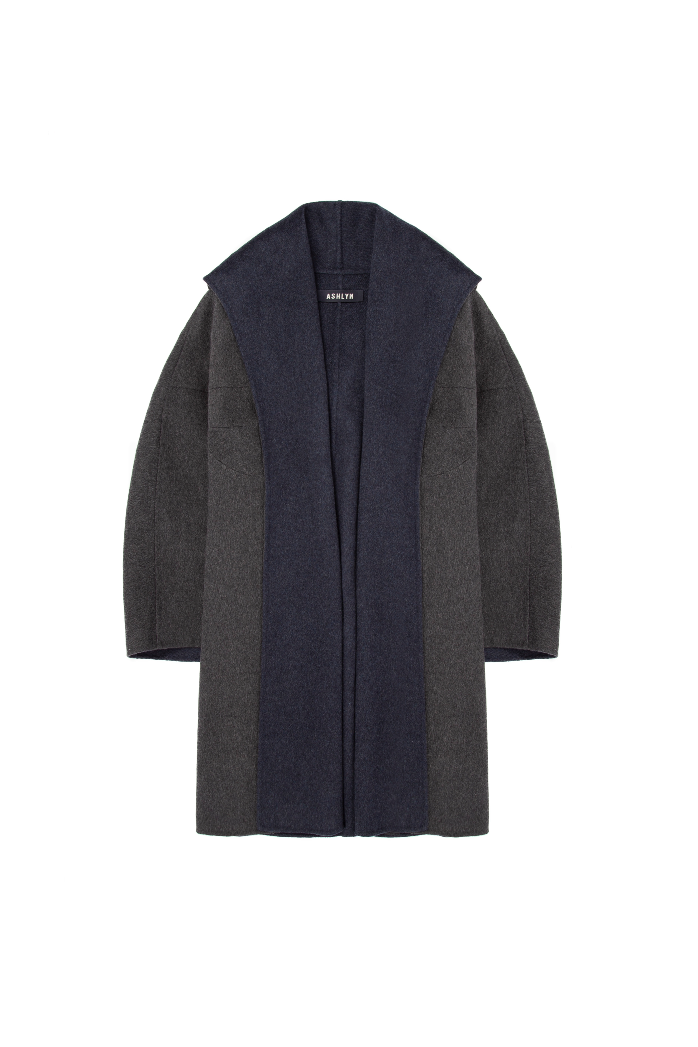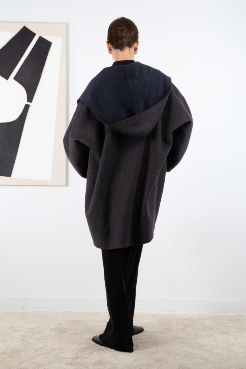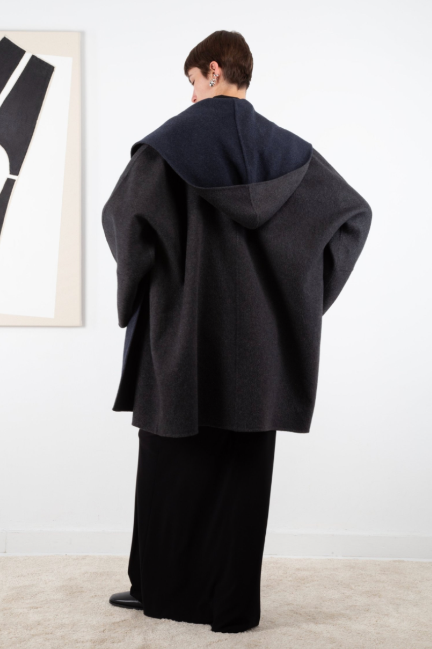 Crafted in Italian double faced cashmere, the Alvin Hood Coat gracefully envelopes the body with its oversized shape and wrap closure. A softly-draped shawl collar transforms into a large hood in the back.
