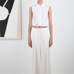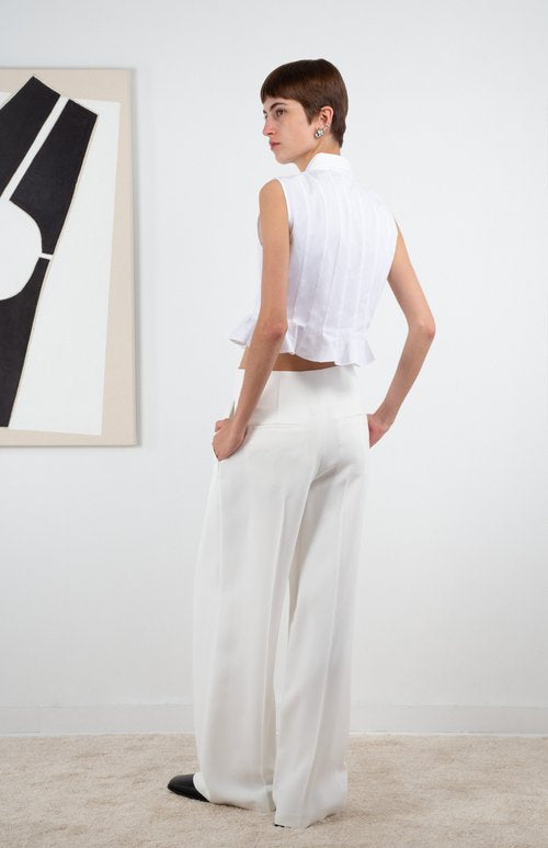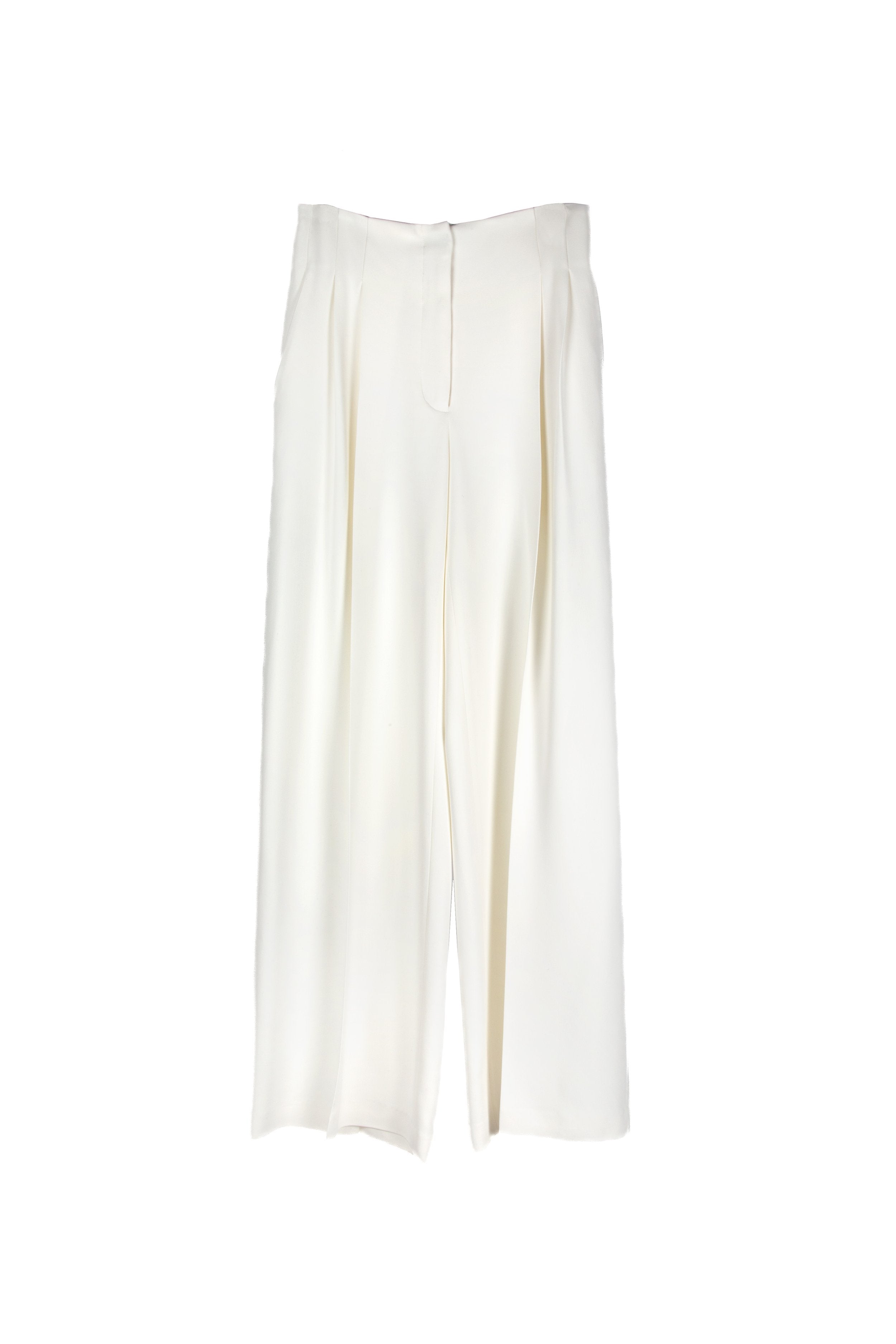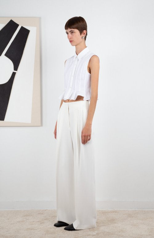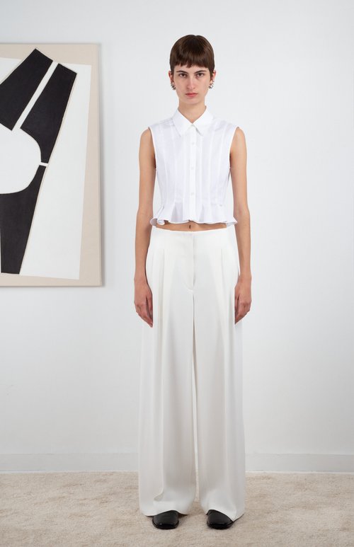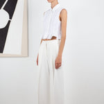 The Bastienne Pant, crafted in heavy viscose cady, features a wide, full-length silhouette with double front pleats.