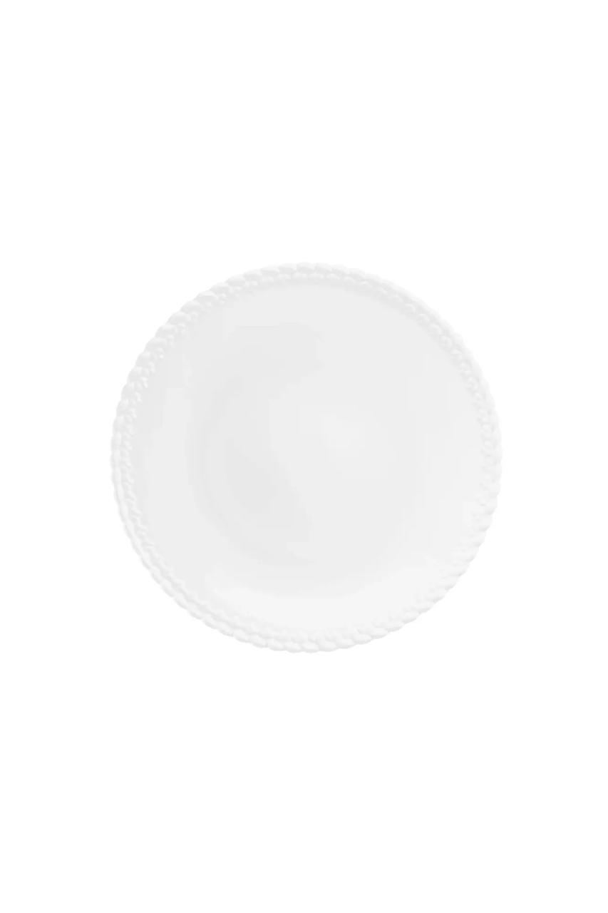 White porcelain dinner plate delicately surrounded by the Babylone braided pattern in matte porcelain for a soft play of contrast. Completely hand-crafted in France, its finesse, density and transparency are the hallmarks of exceptional porcelain.