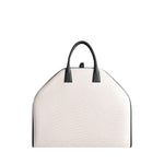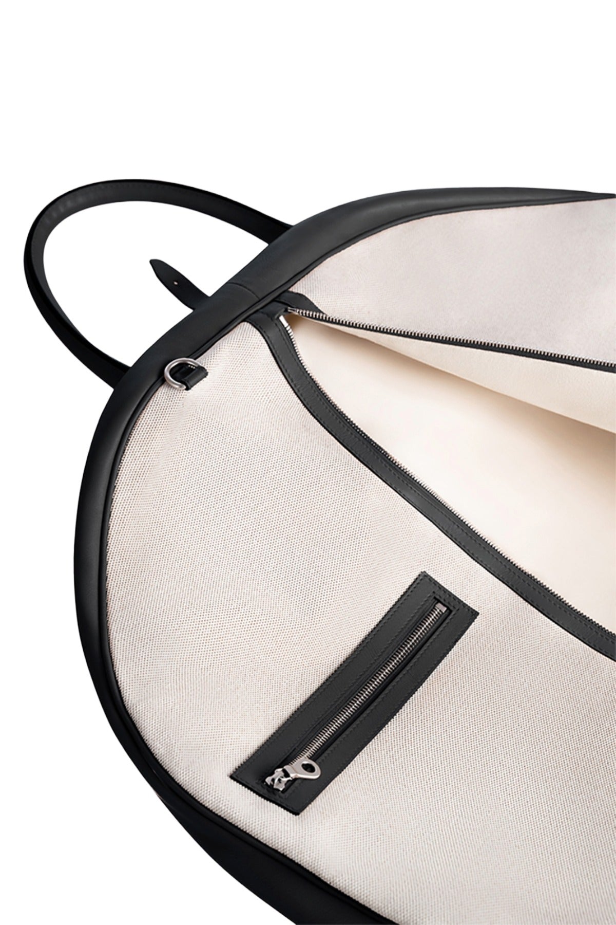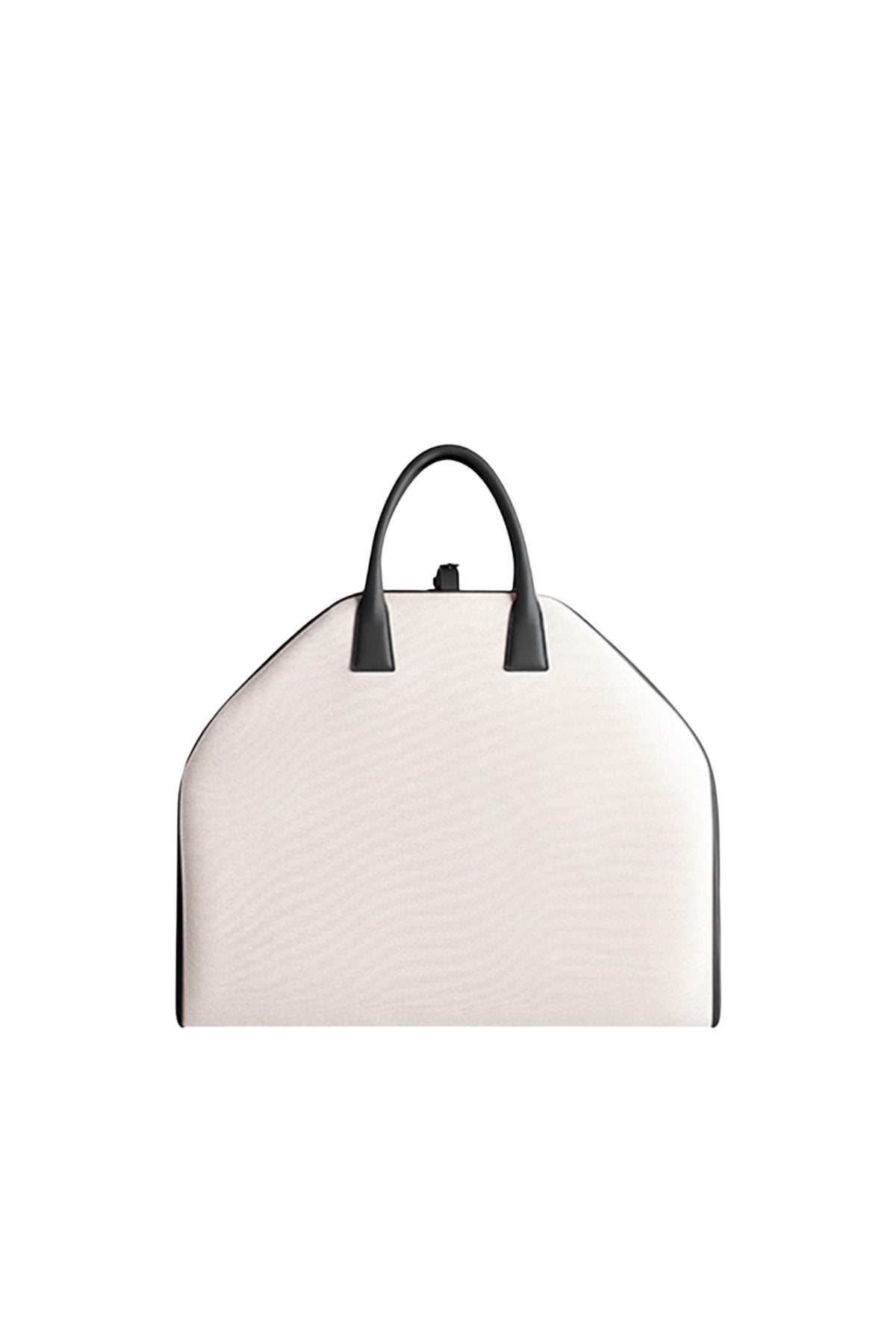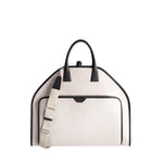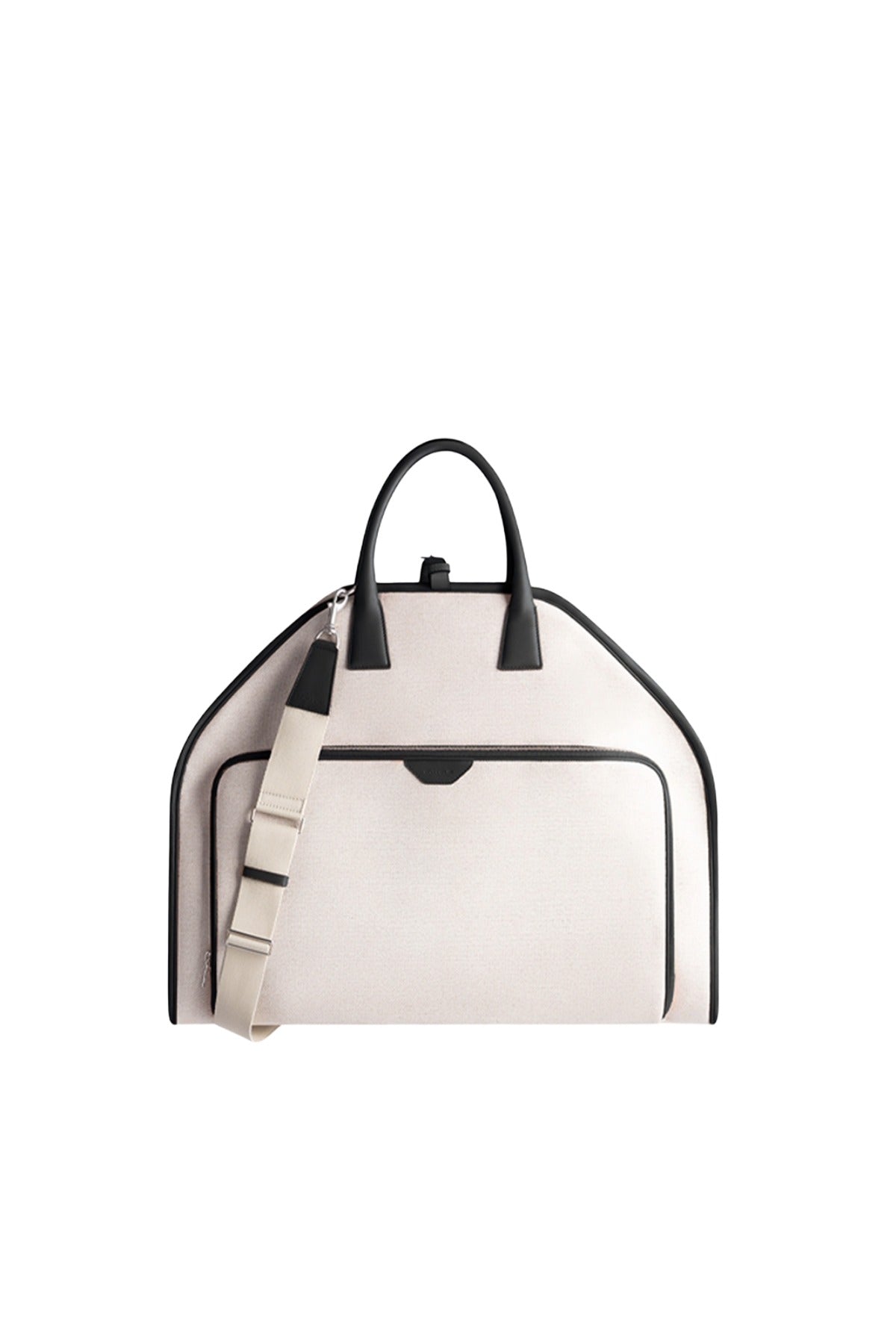 Canvas garment bag with leather trim, external compartment, and adjustable shoulder strap.