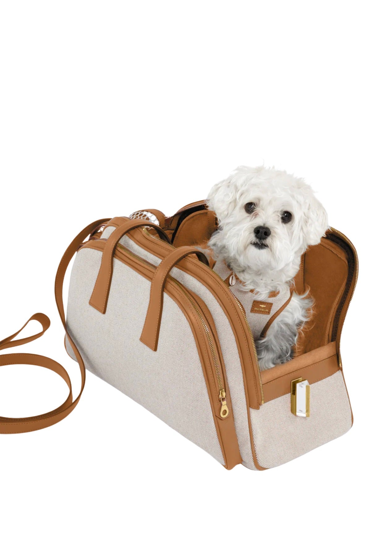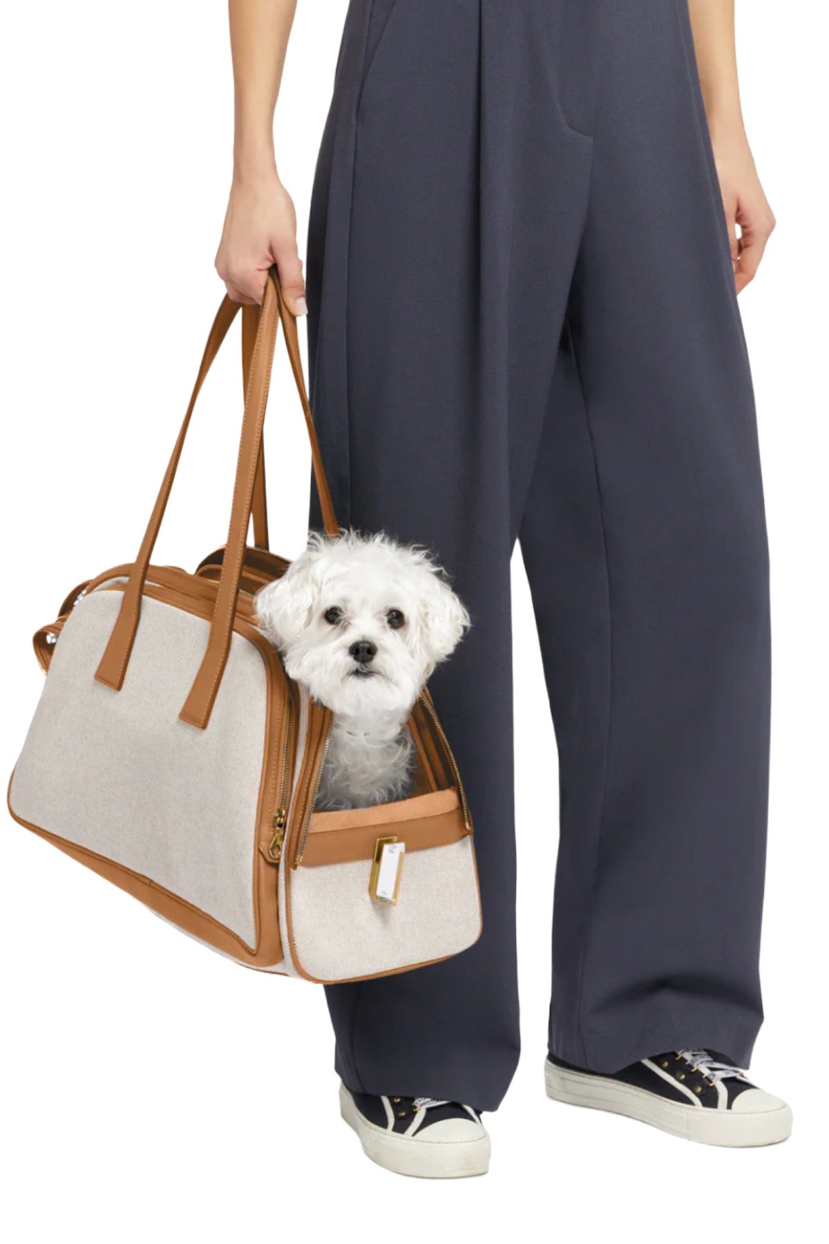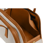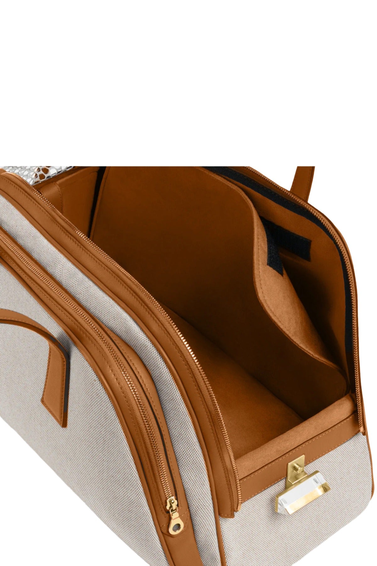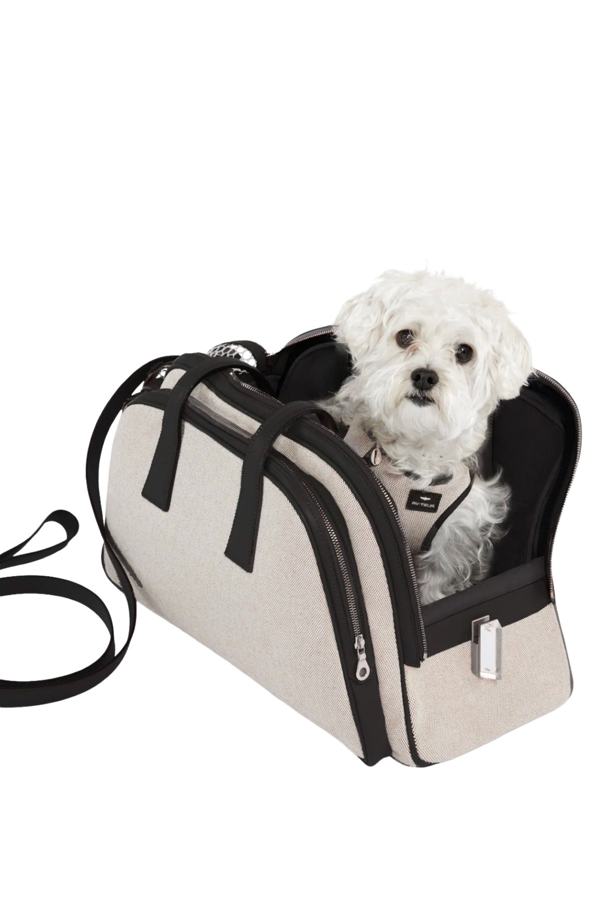 Aviteur's Pet Carrier in canvas with leather trim has a removable interior lining in washable microfibre, external pocket large enough for your laptop and Aviteur prism clasp.