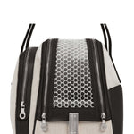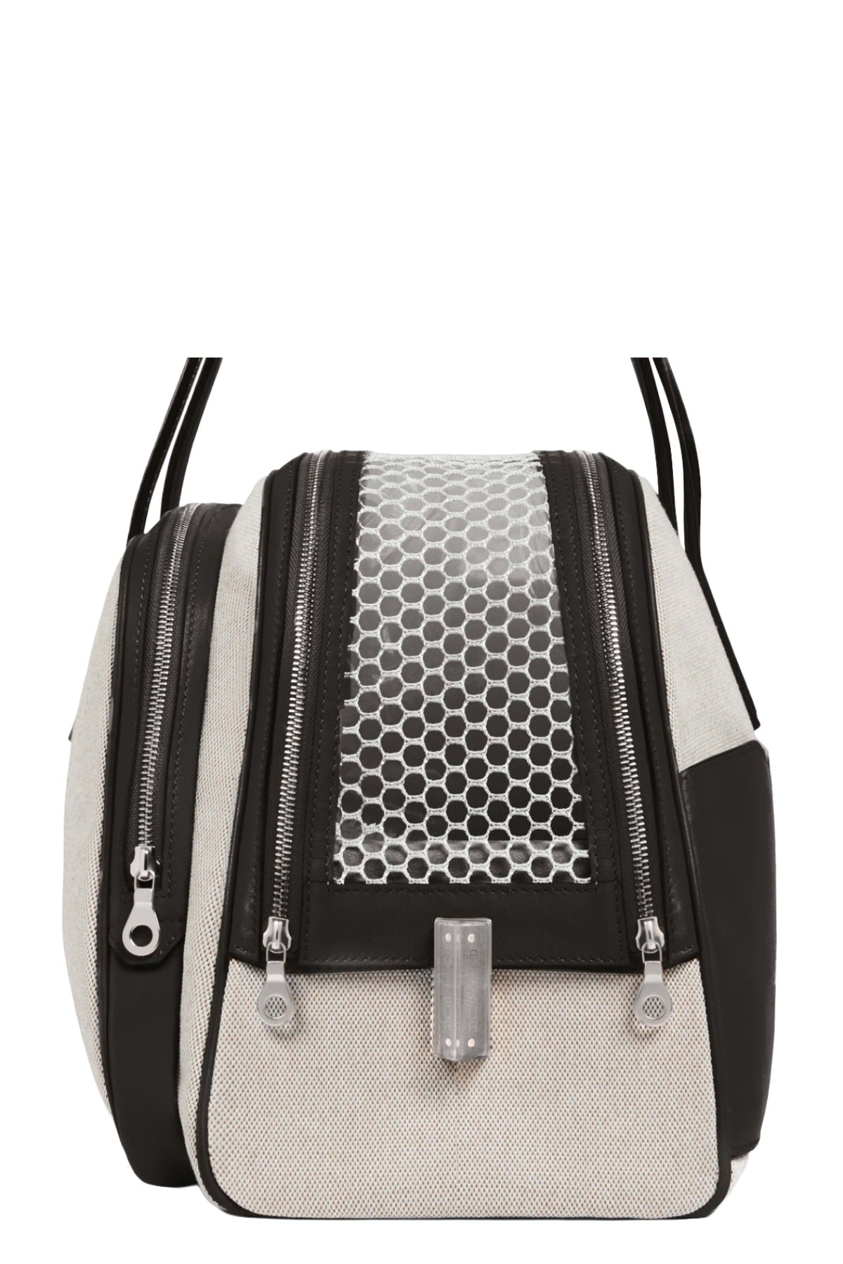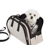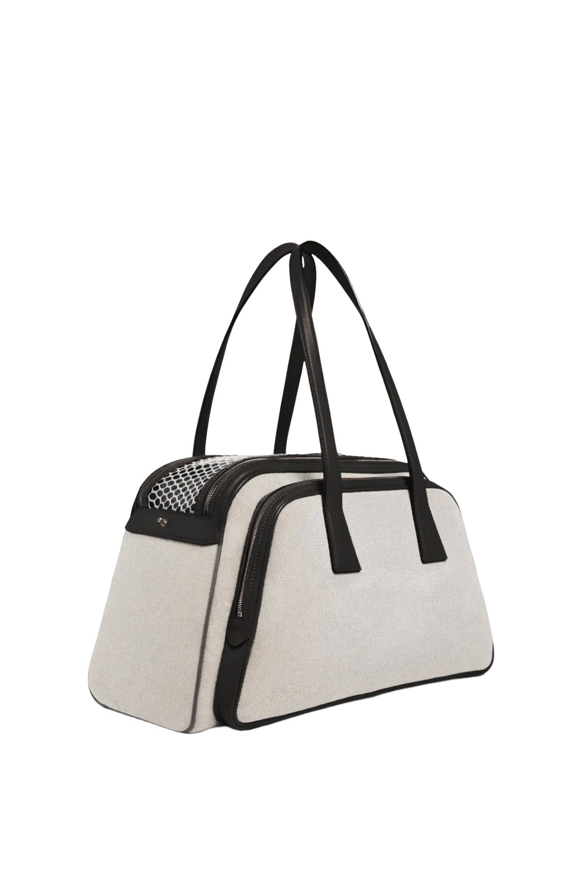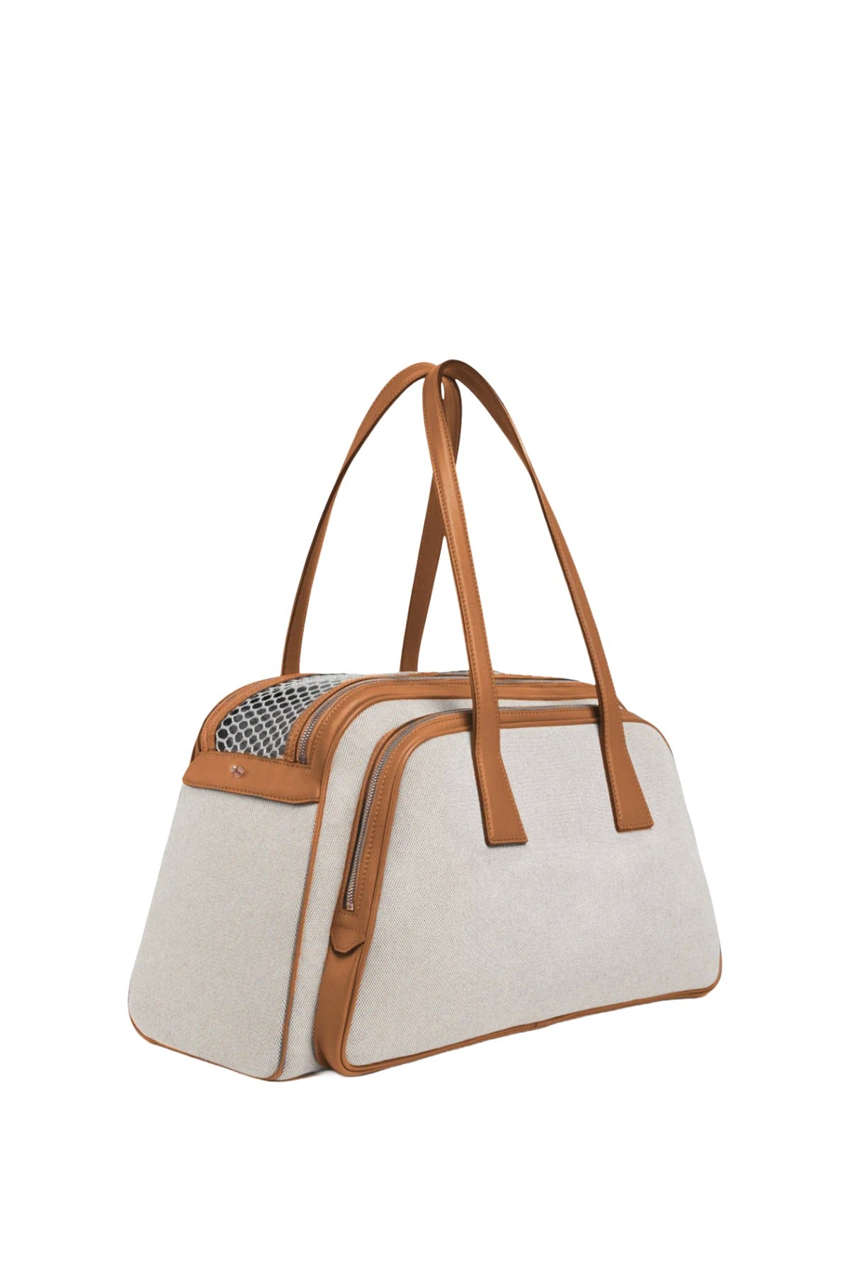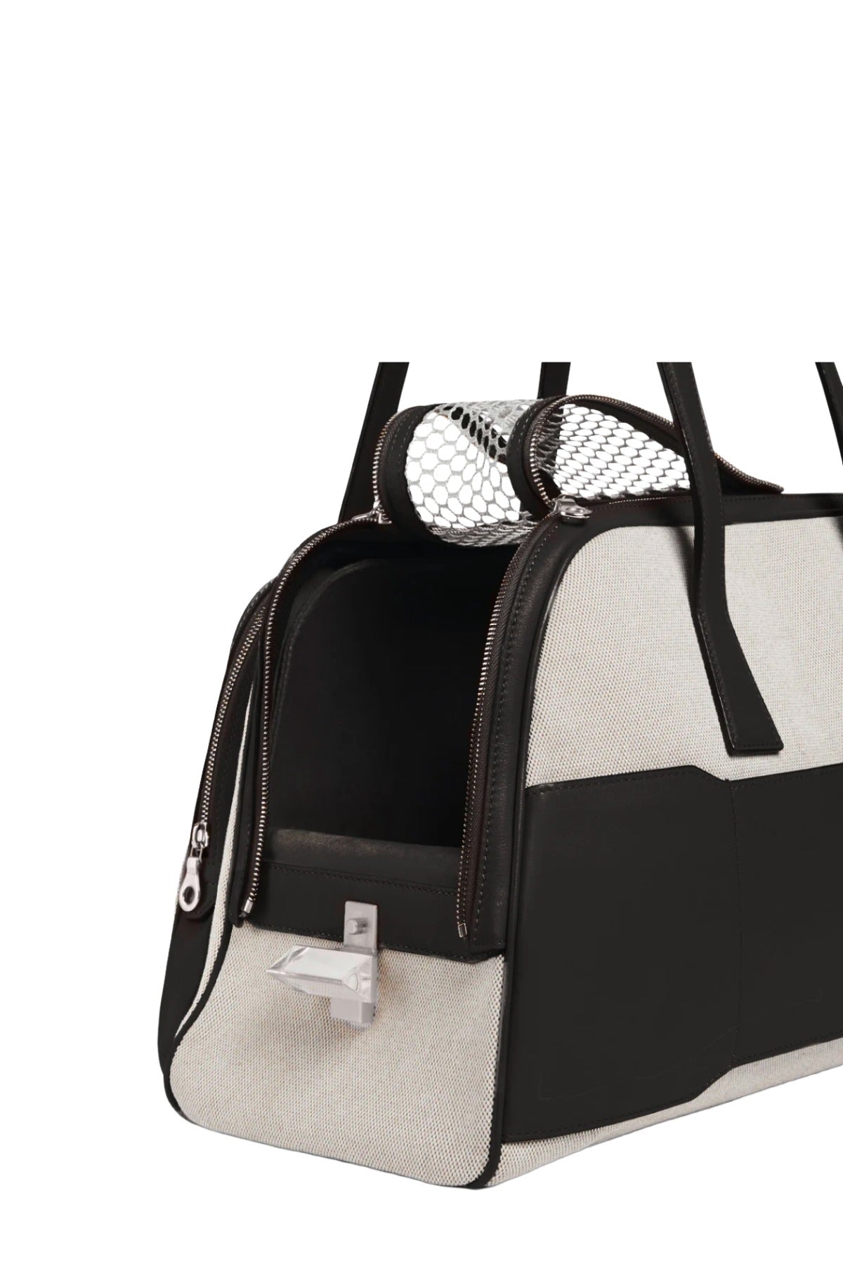 Aviteur's Pet Carrier in canvas with leather trim has a removable interior lining in washable microfibre, external pocket large enough for your laptop and Aviteur prism clasp.