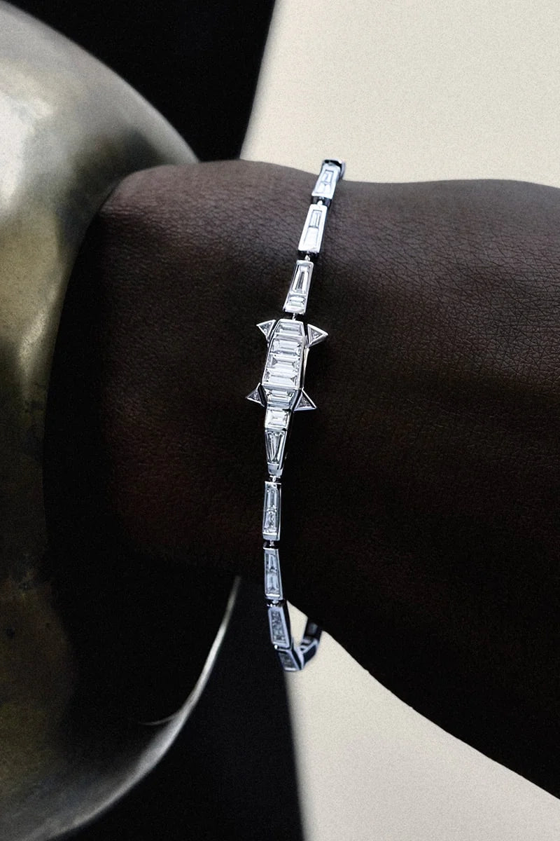 Ingeniously crafted in 18K white gold, the Diamond Alligator Bracelet by Bibi Van der Velden blends playful imagination with refined luxury. Sculpted from a series of baguette-cut diamonds, the articulated alligator forms a continuous loop around the wrist—its tail seamlessly meeting its jaw. A hidden mechanism brings the creature to life: press the feet, and the mouth opens to release the tail, transforming the bracelet into a remarkable piece of kinetic jewelry. Elegant, sculptural, and irresistibly clever, this bracelet is both a statement of artistry and a celebration of meticulous craftsmanship. A modern heirloom that invites admiration from every angle.