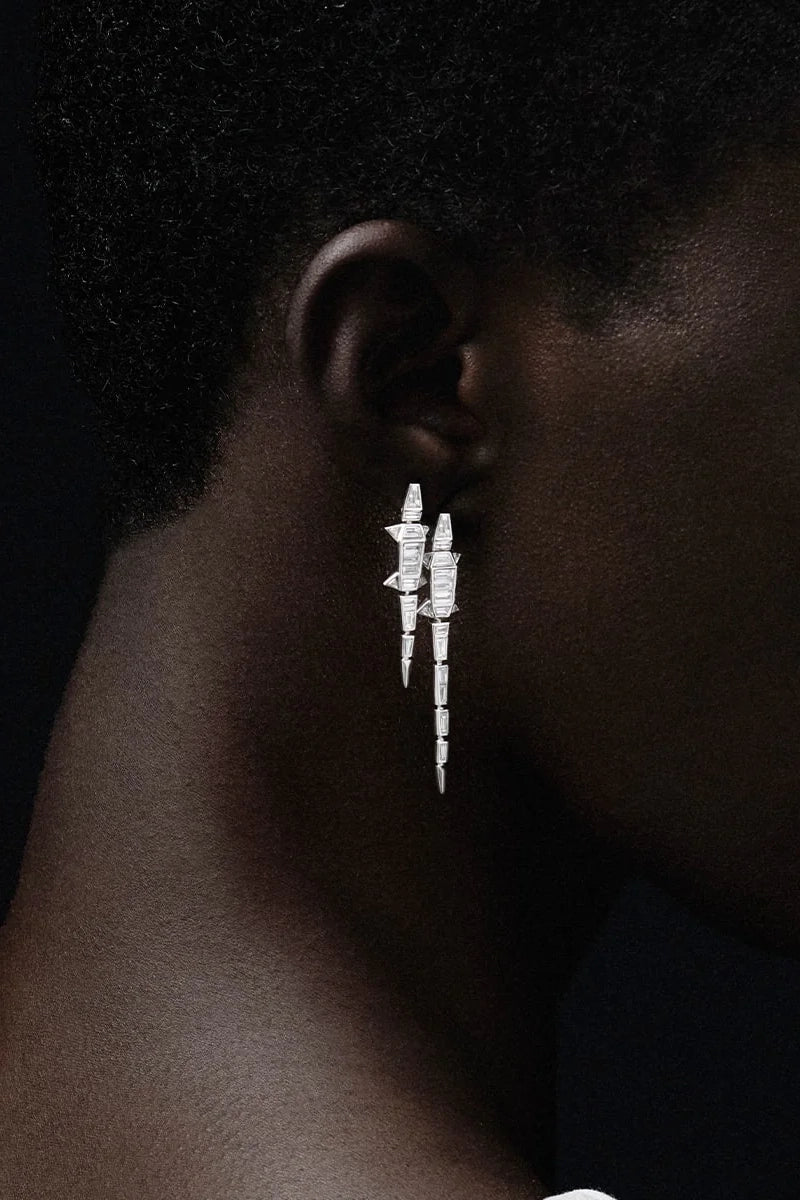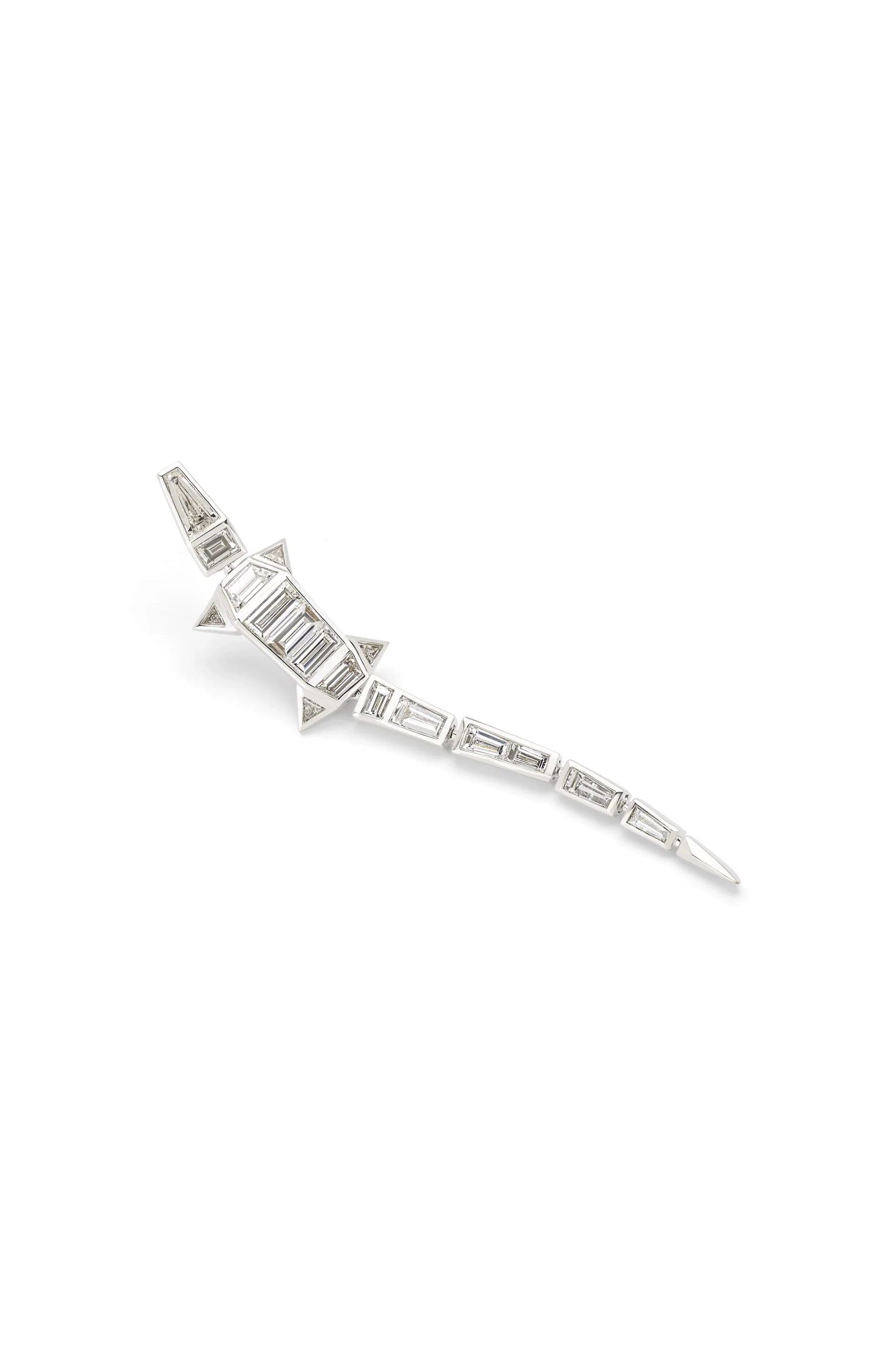 Sculptural and commanding, Bibi Van der Velden’s Diamond Alligator Extra-Long Earring reimagines the iconic alligator motif in an elegant, elongated form. Crafted in 18K white gold, the design features a striking arrangement of tapered and baguette-cut white diamonds that create a sense of movement and sleek, reptilian geometry. A true statement piece, it embodies strength, fluidity, and refined artistry.