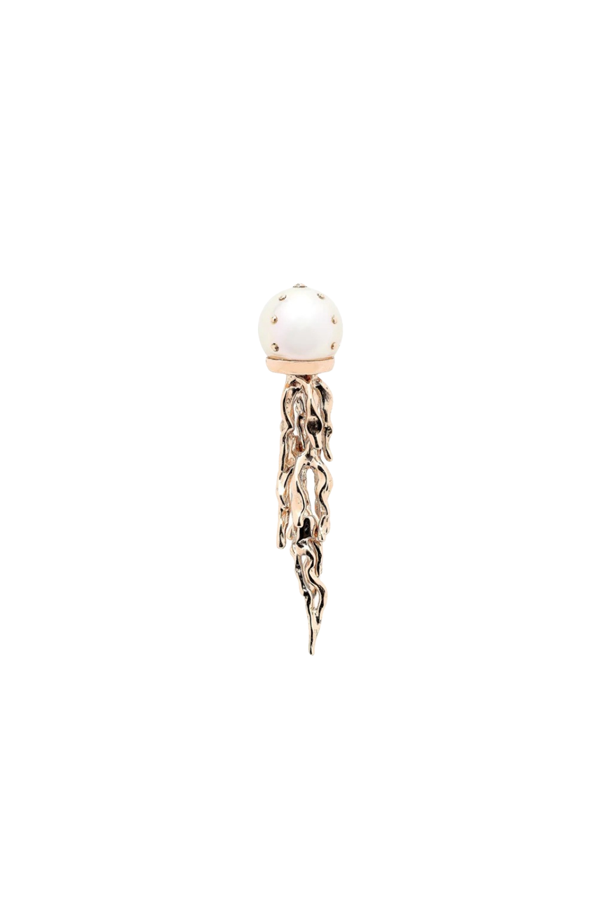 The Jellyfish White Pearl Stud captures the delicate beauty of the ocean’s most ethereal creature. Crafted in 18k rose gold, this unique piece features a lustrous white pearl as the jellyfish’s bell, adorned with subtle detailing. The graceful tentacles extend below, embodying fluid movement and organic elegance.