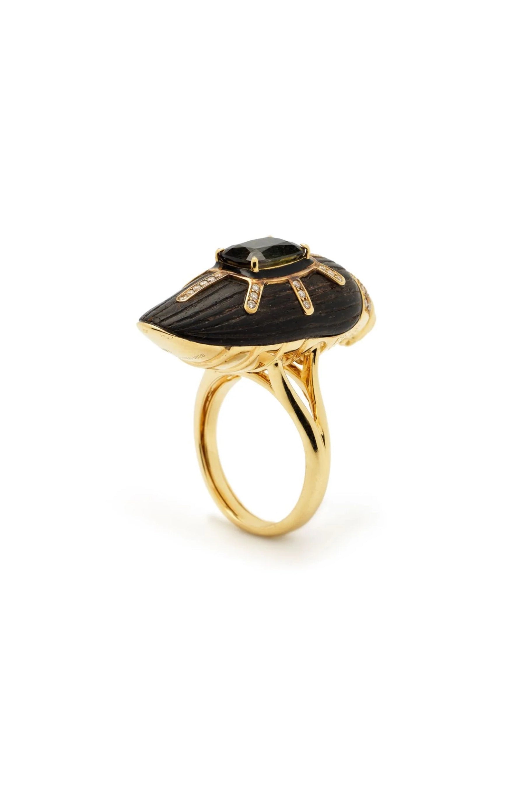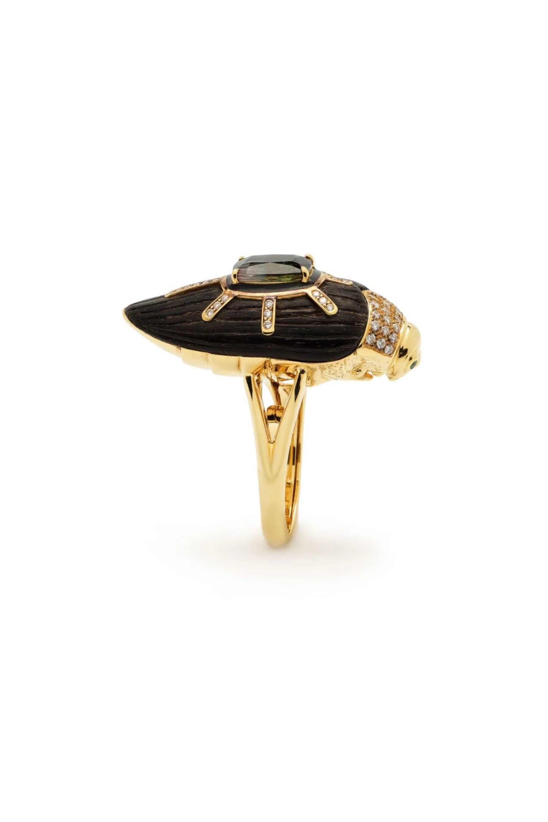 The Scarab Ebony Ring is a striking fusion of natural beauty and fine craftsmanship. Hand-carved from rich ebony wood and set in 18K yellow gold, this sculptural scarab captivates with its deep, organic texture. At its centre lies a vivid watermelon tourmaline, showcasing a mesmerising gradient of green to pink that echoes the scarab’s symbolism of renewal and transformation.