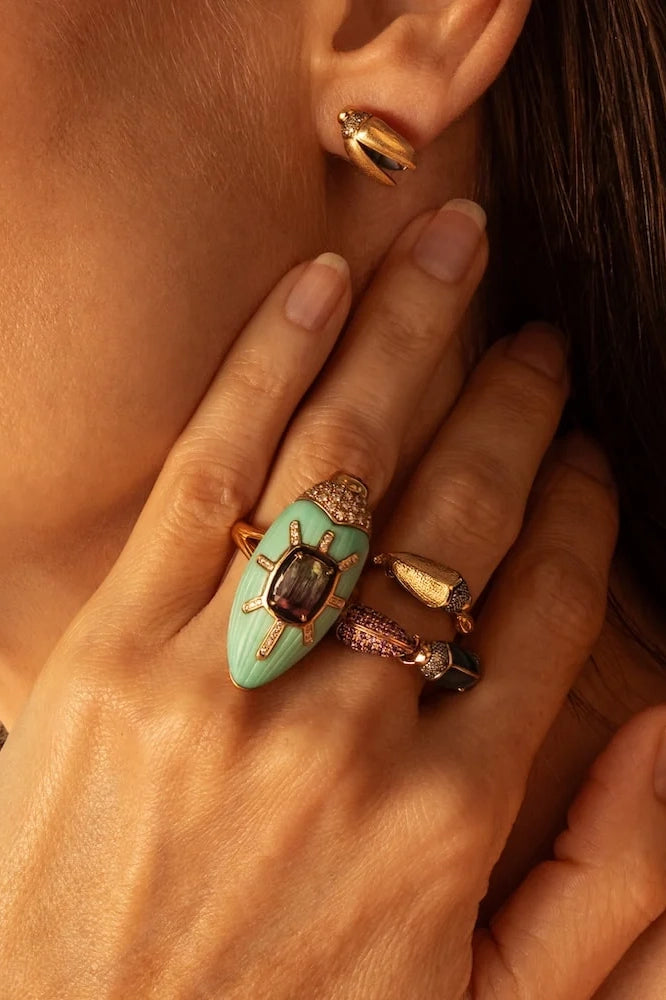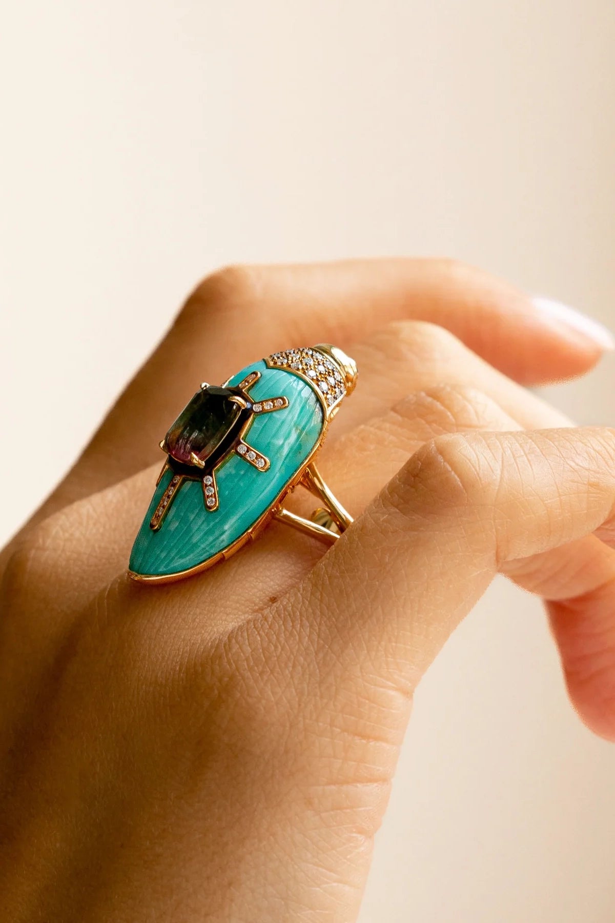 A vibrant blend of color and symbolism, the Scarab Turquoise Ring with Watermelon Tourmaline is crafted in 18K yellow gold and accented with white diamonds and tsavorites. A smooth turquoise shell frames the striking watermelon tourmaline center stone, showcasing its natural gradient from pink to green. Inspired by the scarab’s ancient meaning of protection and transformation, this ring brings both beauty and significance to any collection.