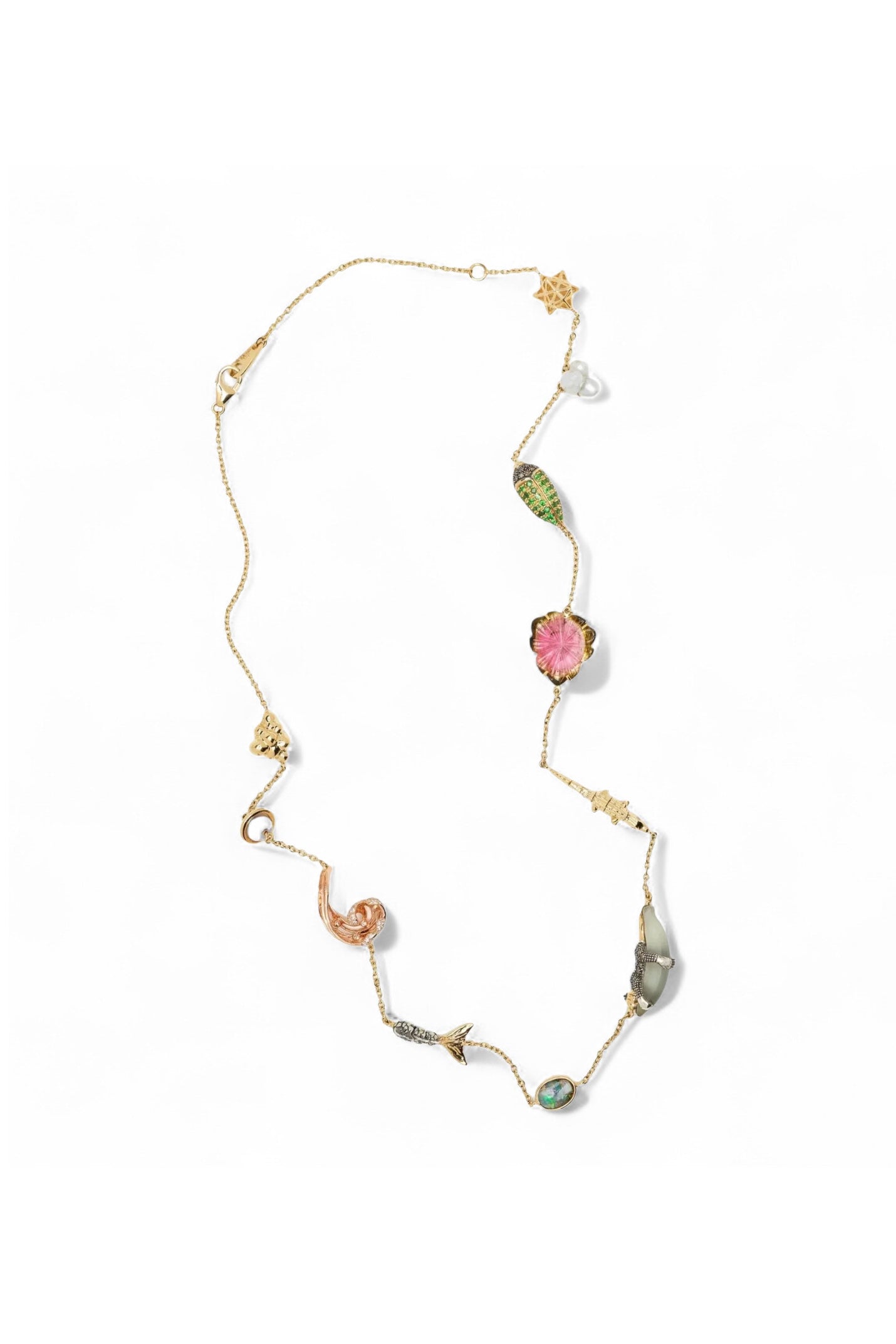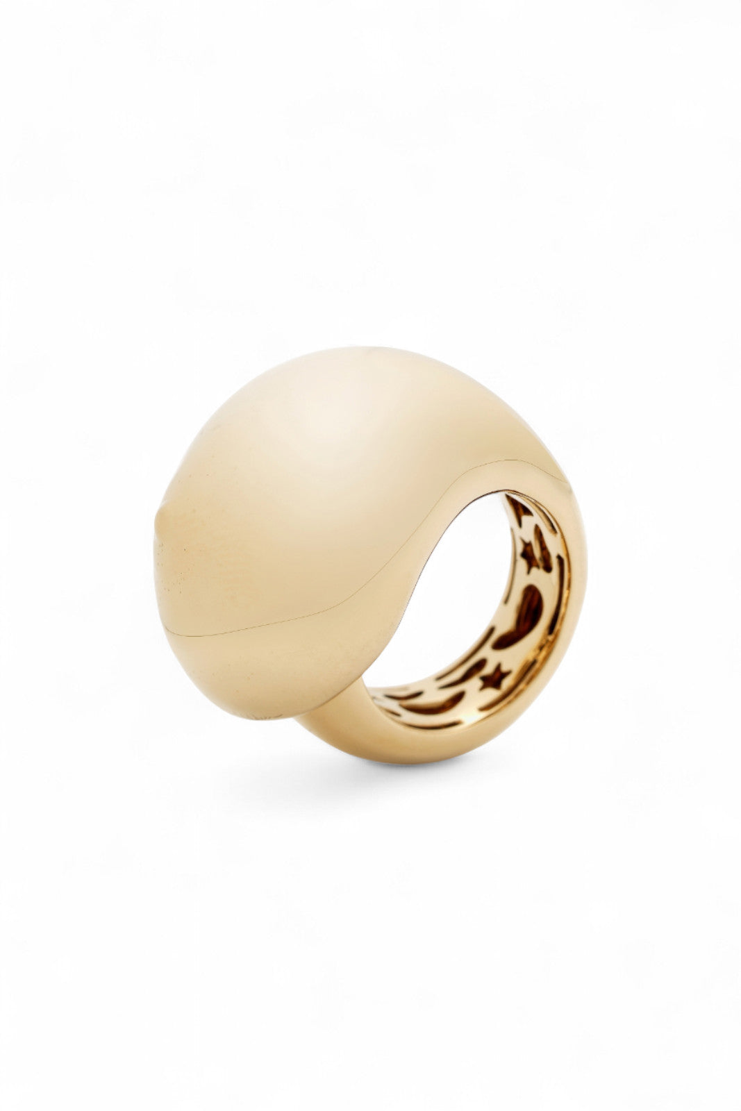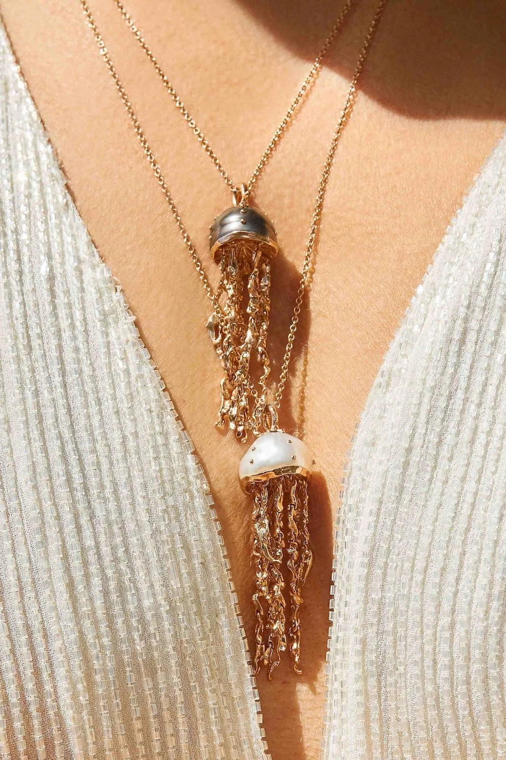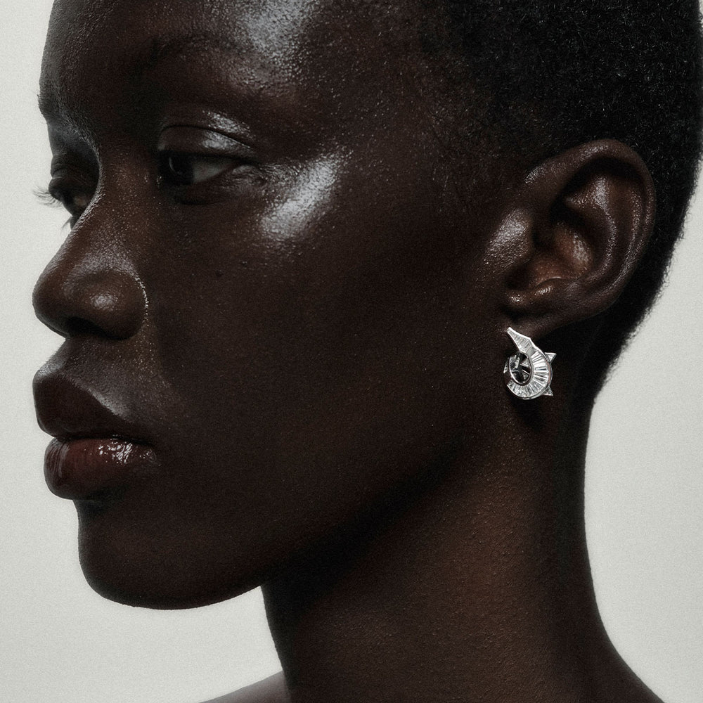 Bibi van der Velden's jewellery is crafted with 18k fairtrade gold, diamonds and baroque pearls, but also has an emotive quality. To her, jewellery should energize its wearer. Thus, her designs are artistic, personalized and playful. Bibi uses traditional jewellery-making and sustainable, rare materials like mammoth tusk, ostrich eggs and scarab wings. Each piece is hand-sketched and hand-crafted in wax, resembling "miniature sculptures".
