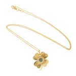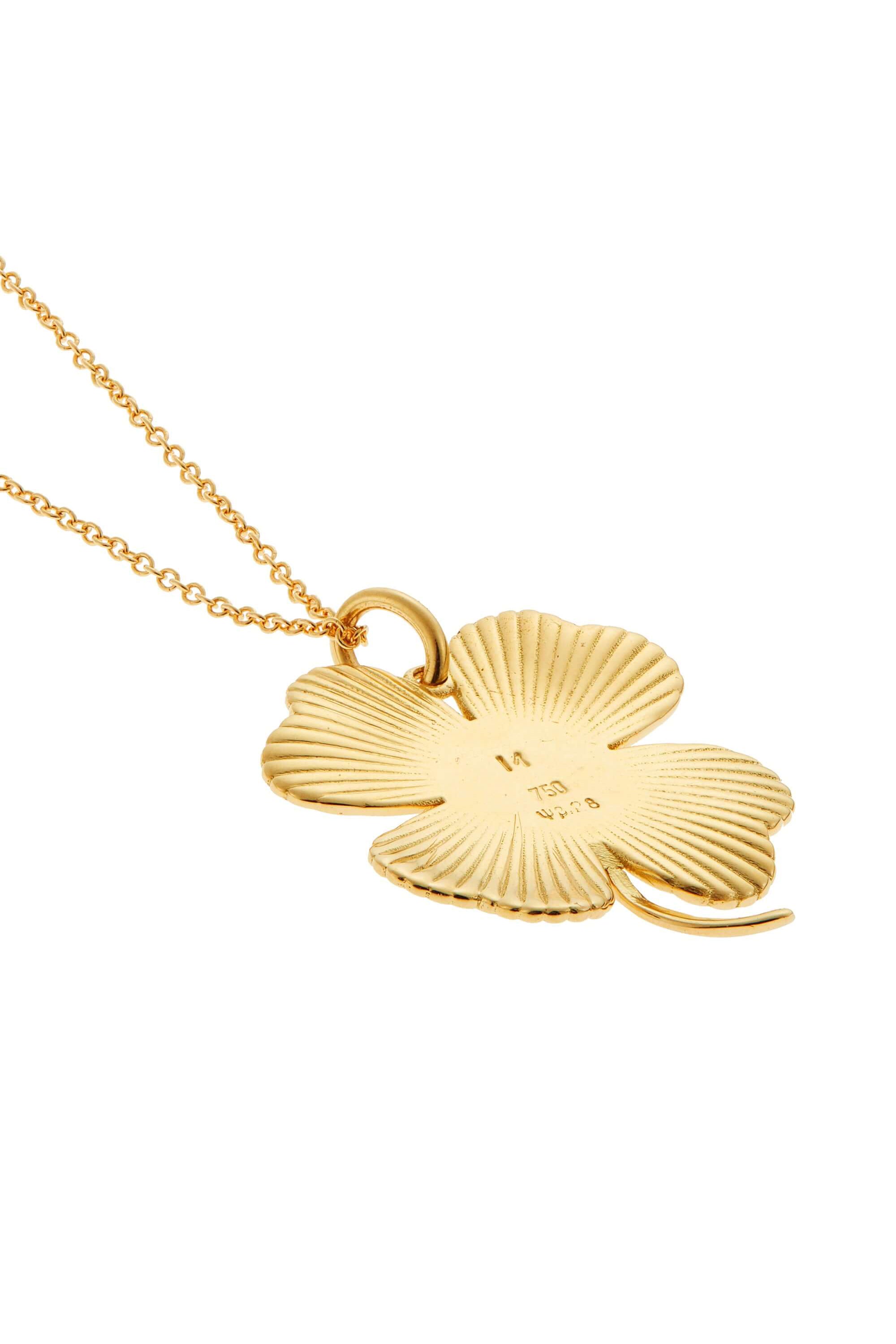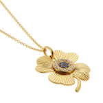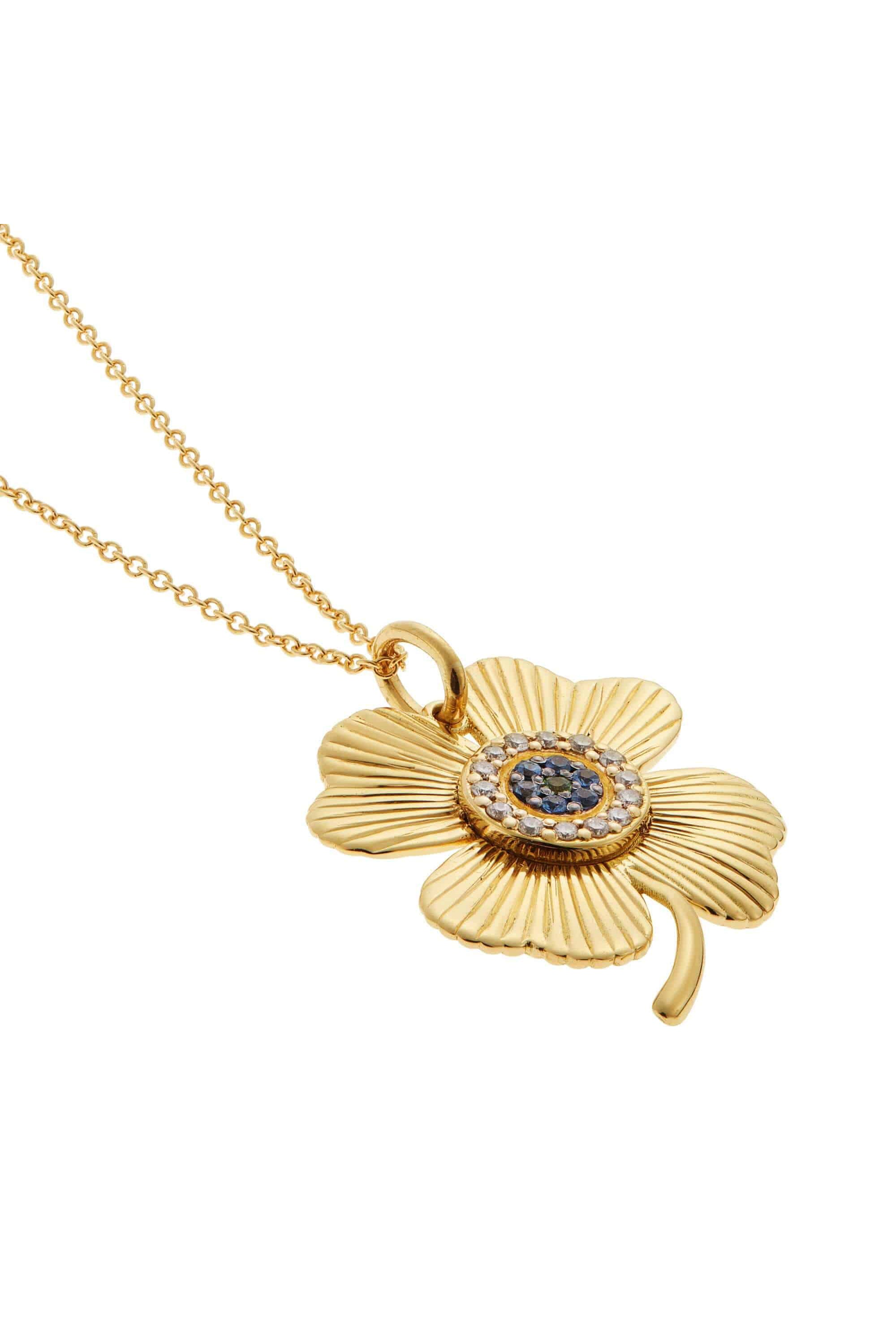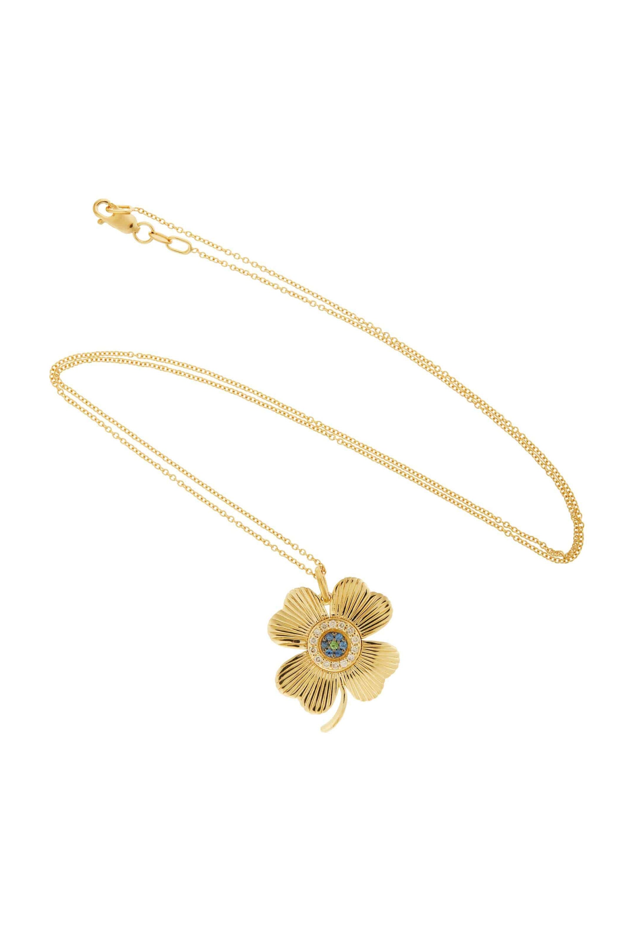 A charm of luck and luminous color, Ileana Makri’s Lucky Clover Eye Pendant brings a playful elegance to the everyday. Hand-carved in 18k polished yellow gold, the clover motif glows with pavé champagne diamonds, blue sapphires, and a touch of tsavorite at its center. Suspended from a fine gold cable chain, it catches the light with every move—an eye-catching talisman with effortless appeal.