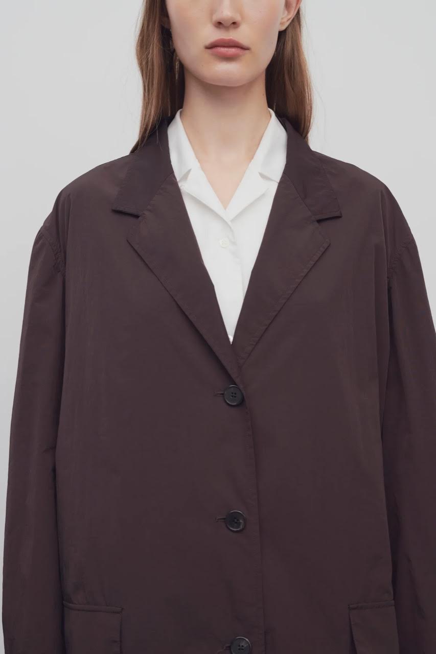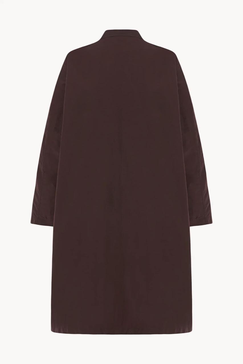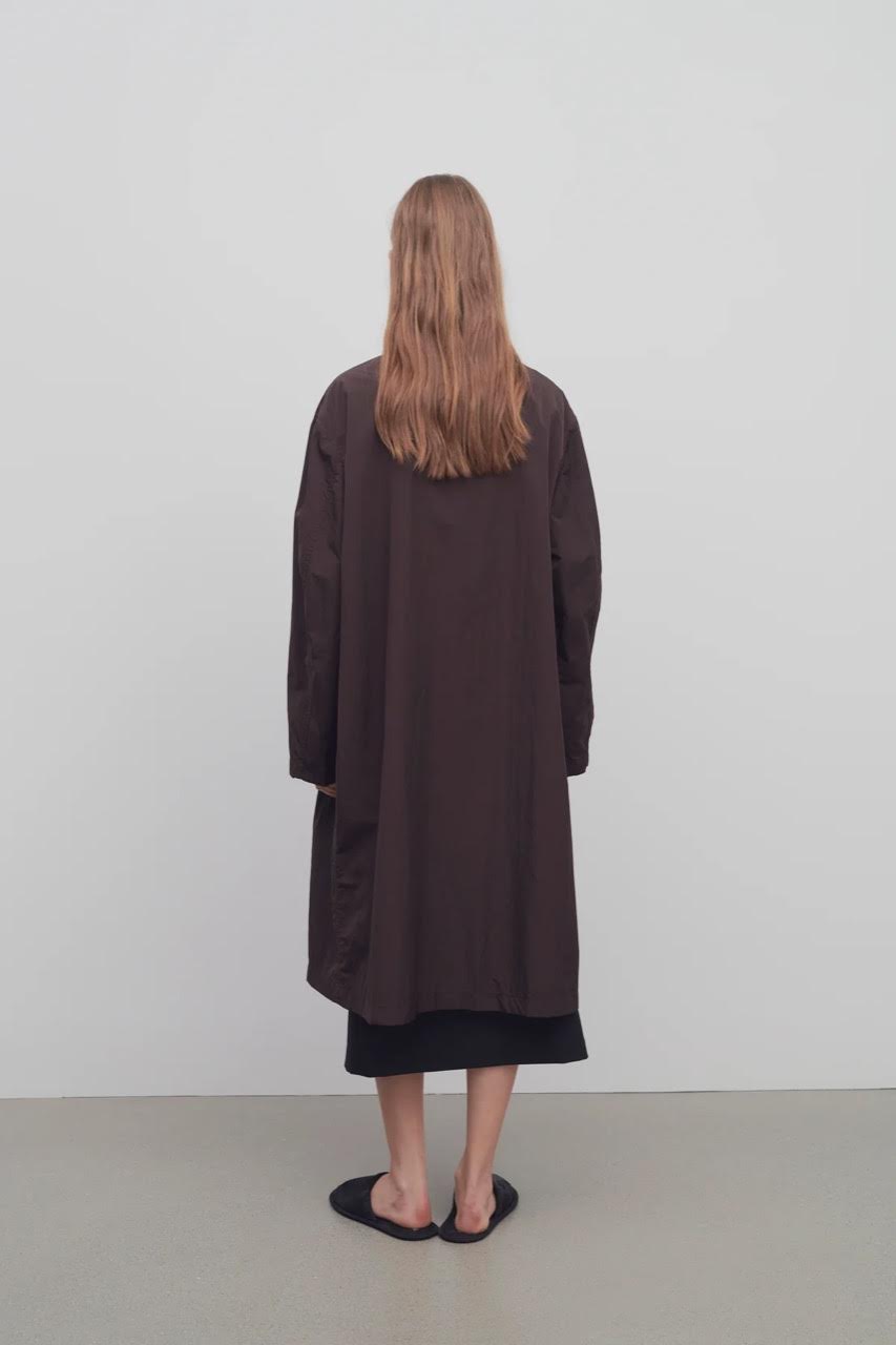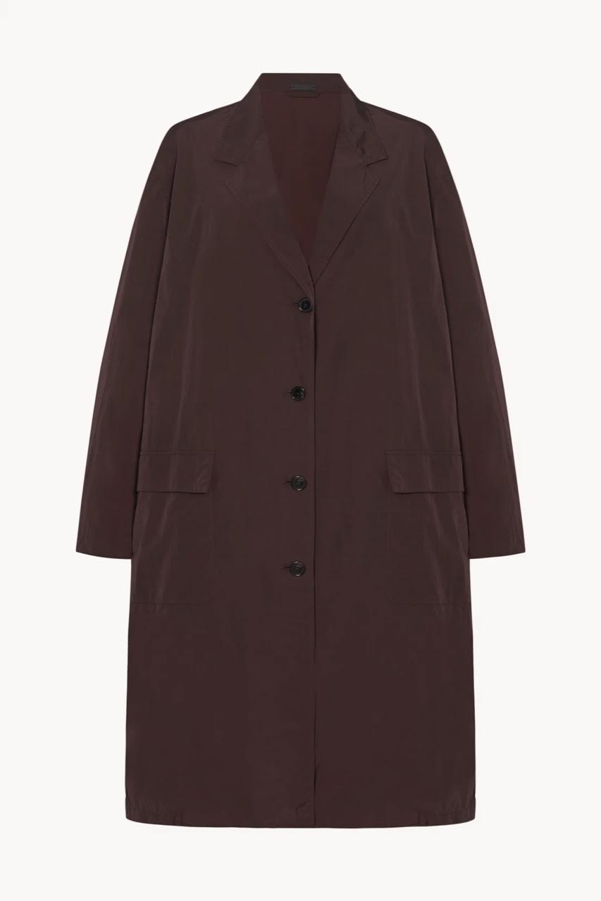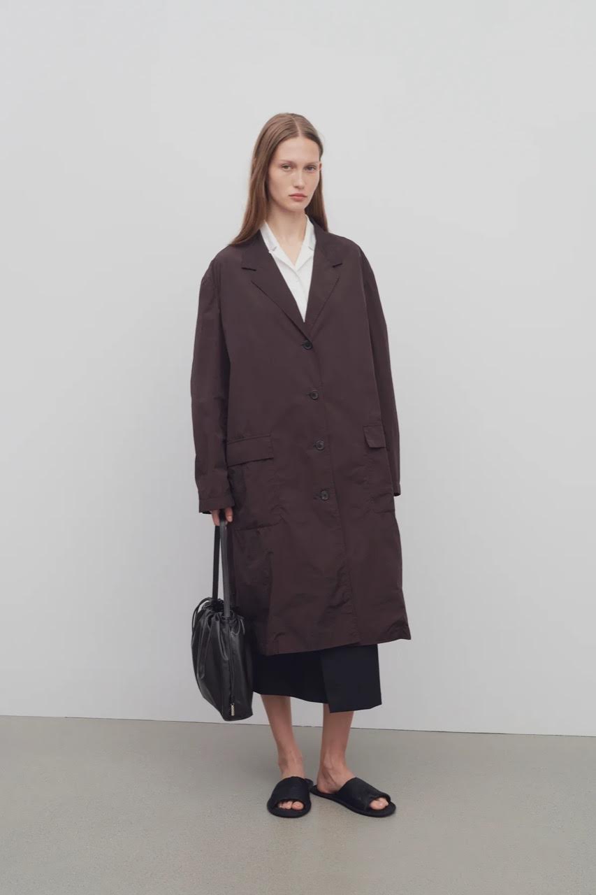 INFO Knee-length, single-breasted coat in washed nylon with dropped shoulders, side patch pockets, and removable belt. More information |