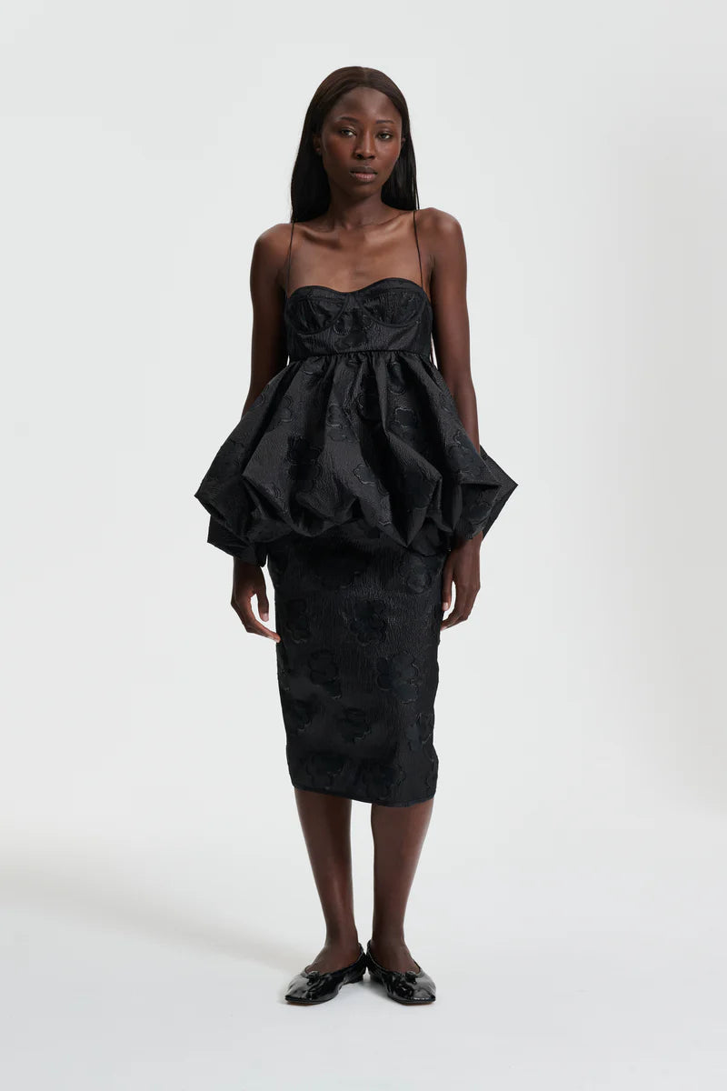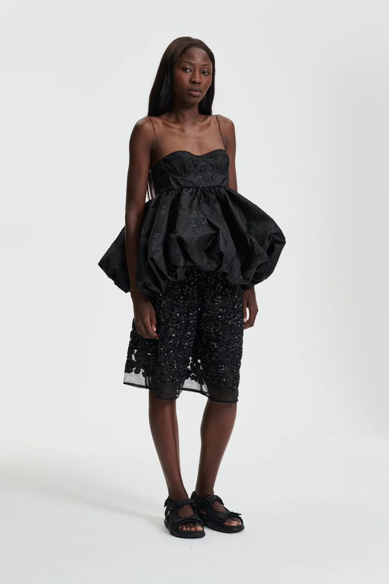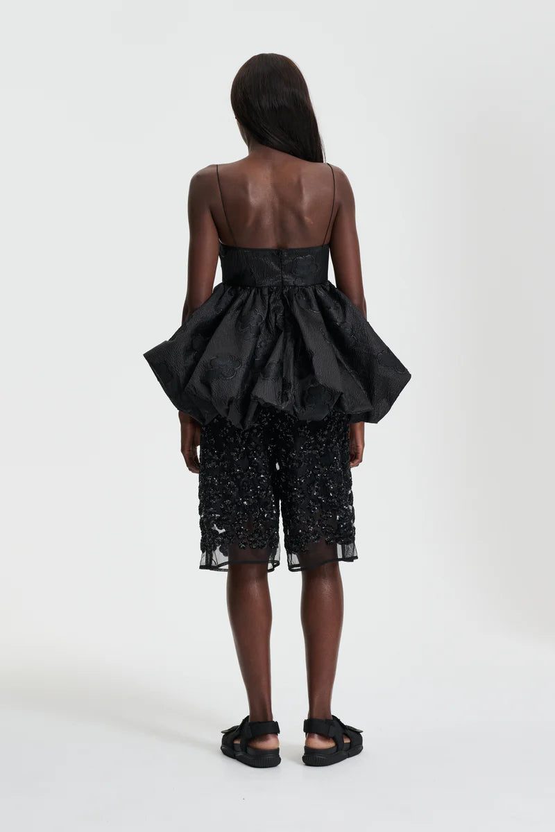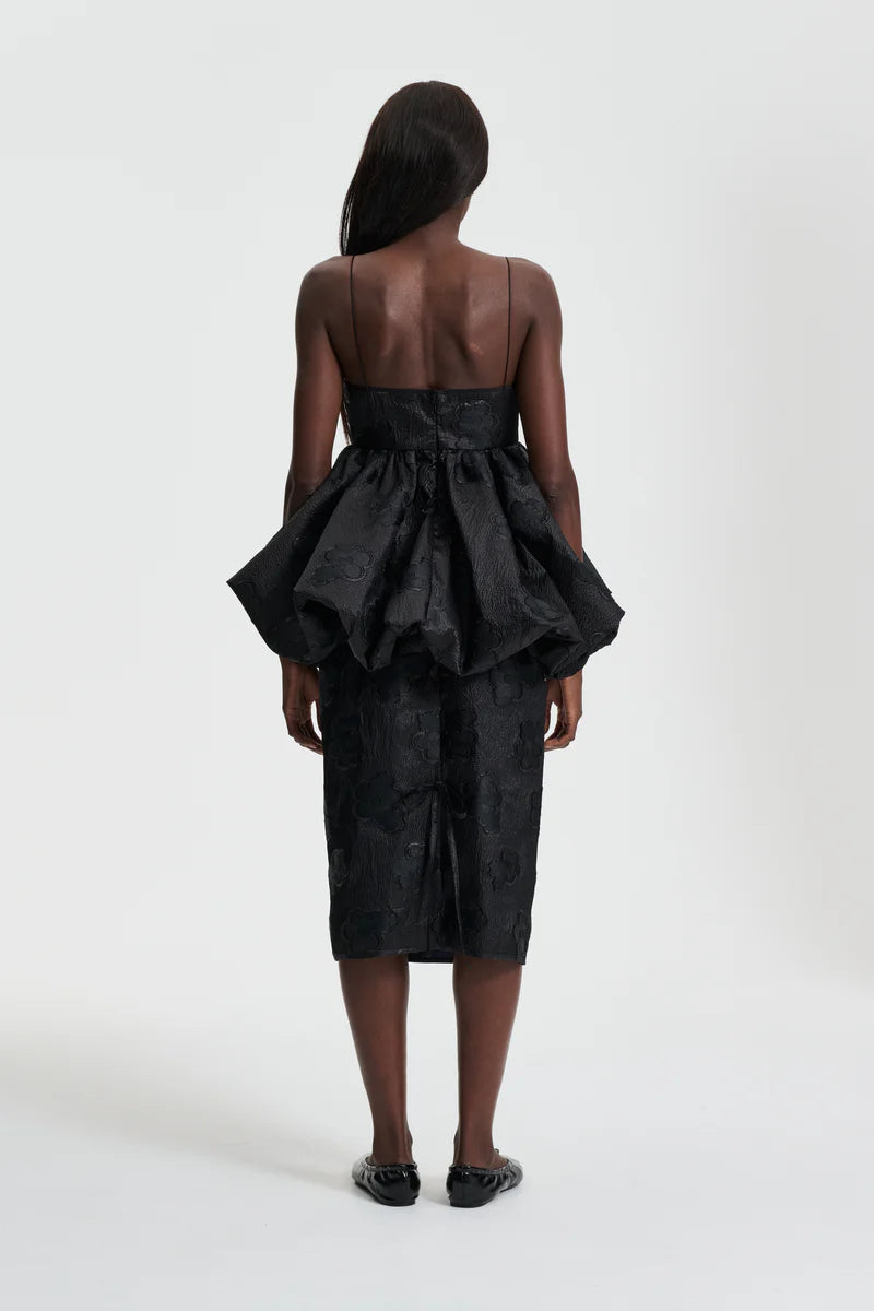 INFO A new expression of Cecilie Bahnsenís vision comes to life in the Anette top. Crafted from a white kumo fil-coupé, the elegant bustier bodice balloons out into a fully gathered peplum for new volumes. Fully lined and pulled together by an invisible zipper at the left side seam. |