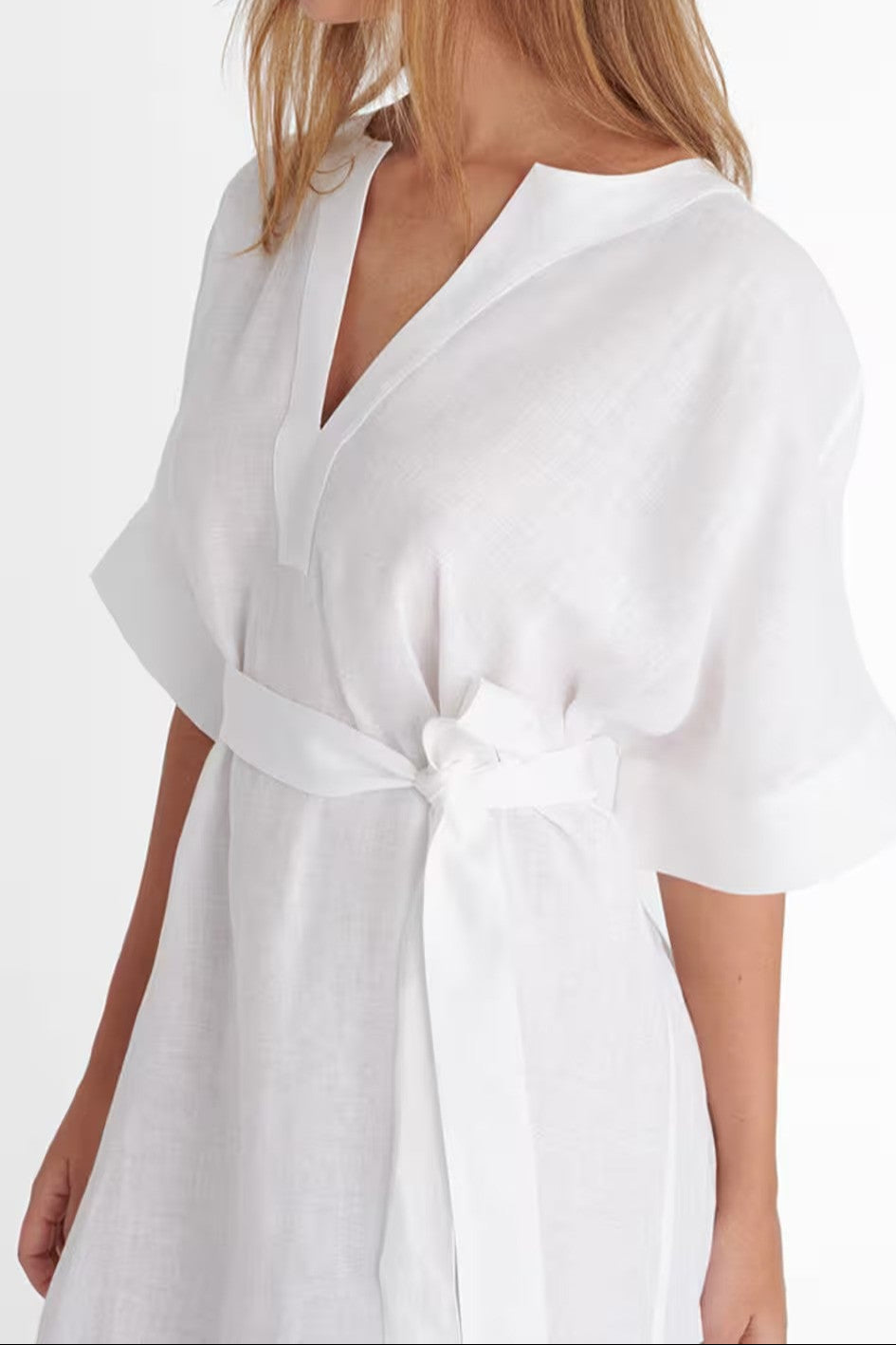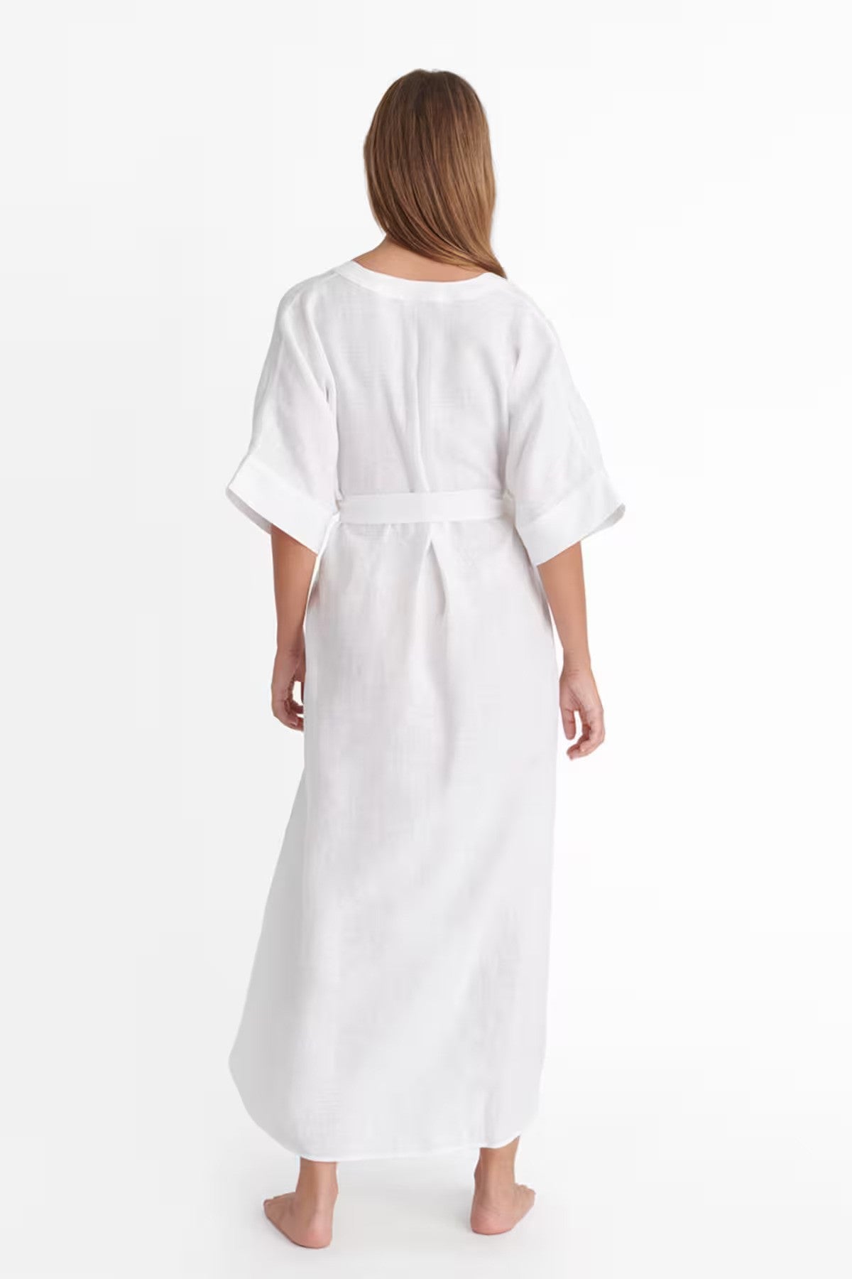 The linen Bibi kaftan is practical yet elegant. Worn with or without its belt, it offers incomparable comfort thanks to its light and airy linen material and flared shape. Facing on the neckline and sleeve hems bring structure to the silhouette.