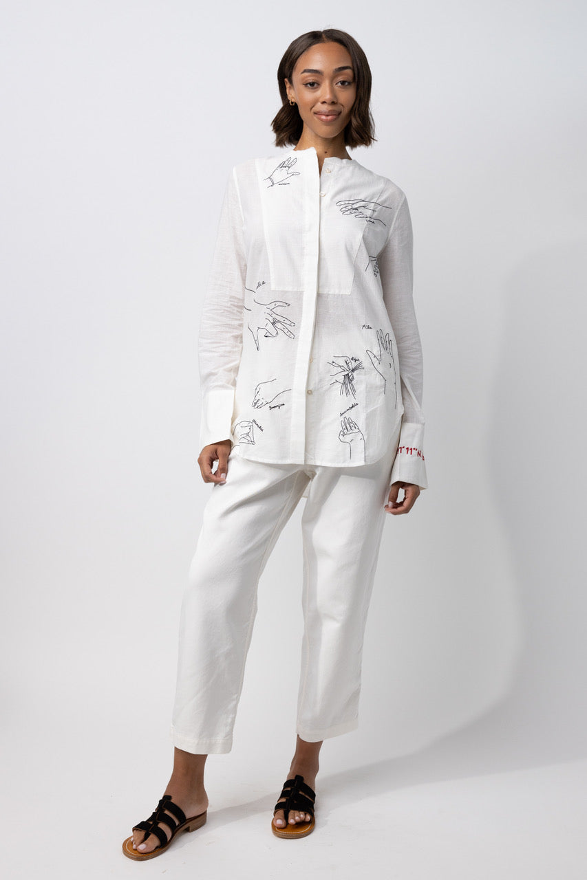 INFO Kilometre Paris' white Luiza shirt dress celebrates Lapa Vermelha, a limestone massif on the banks of a small lagoon on the outskirts of Belo Horizonte. It's handcrafted by artisans in India with multicoloured embroidery displaying Brazil's natural rocks. |