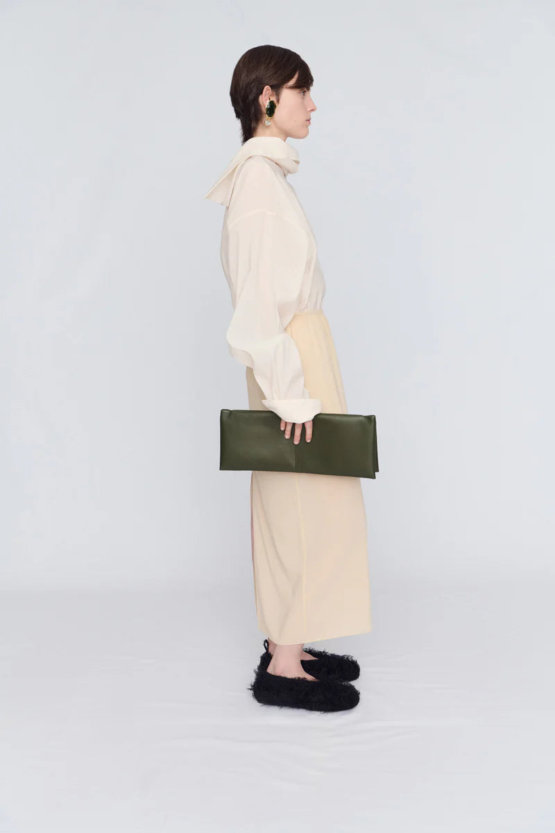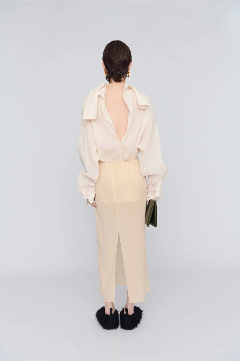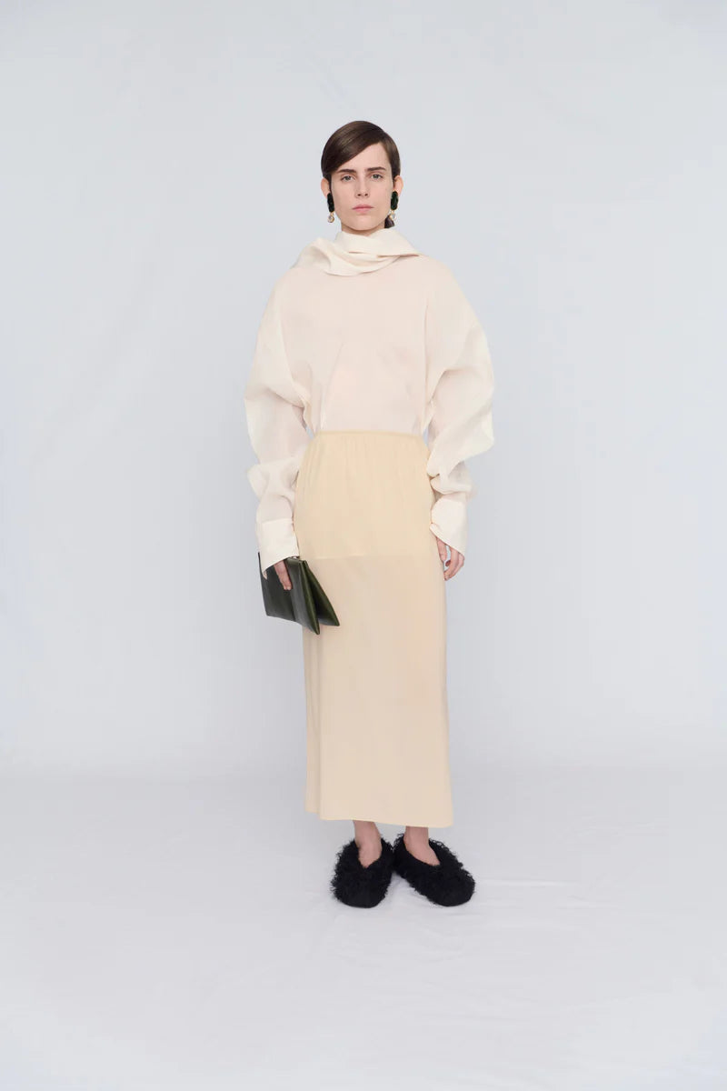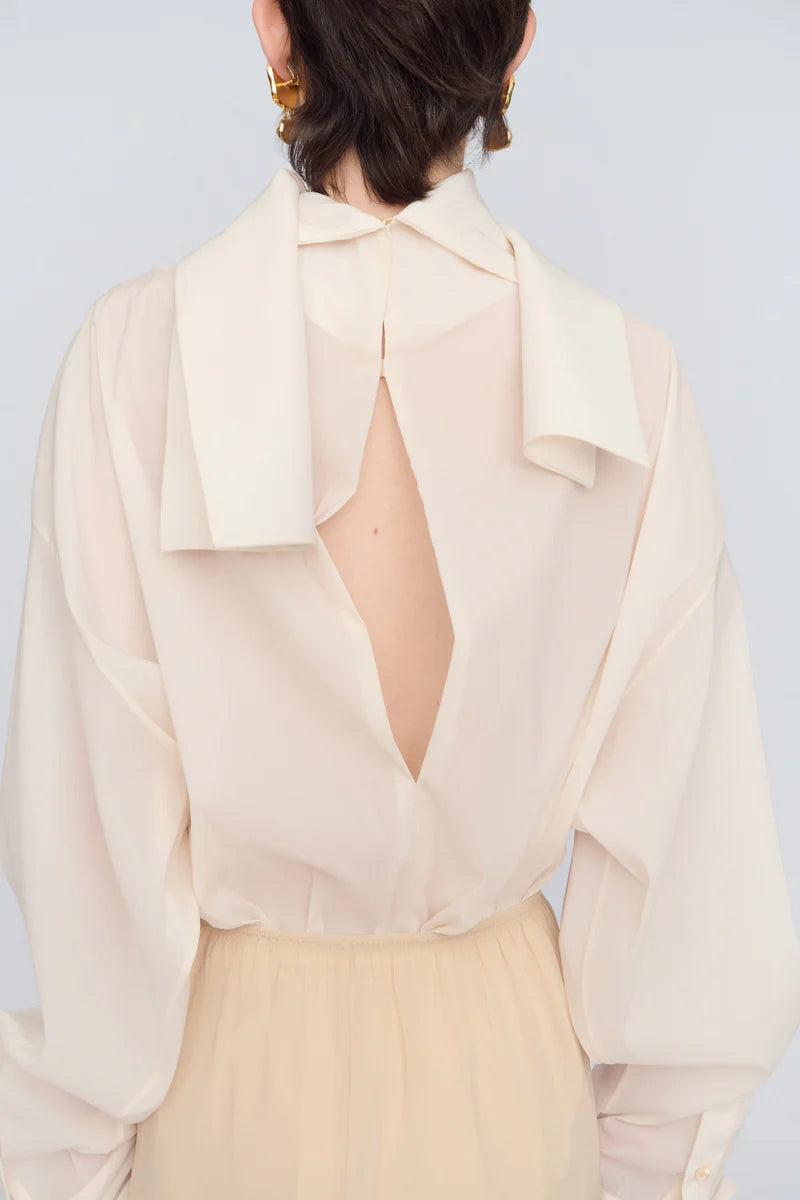 INFO Opera blouse in écru stretch toile with a foulard neck-tie. The blouse is cut for a generous fit with a curved dropped shoulder. |