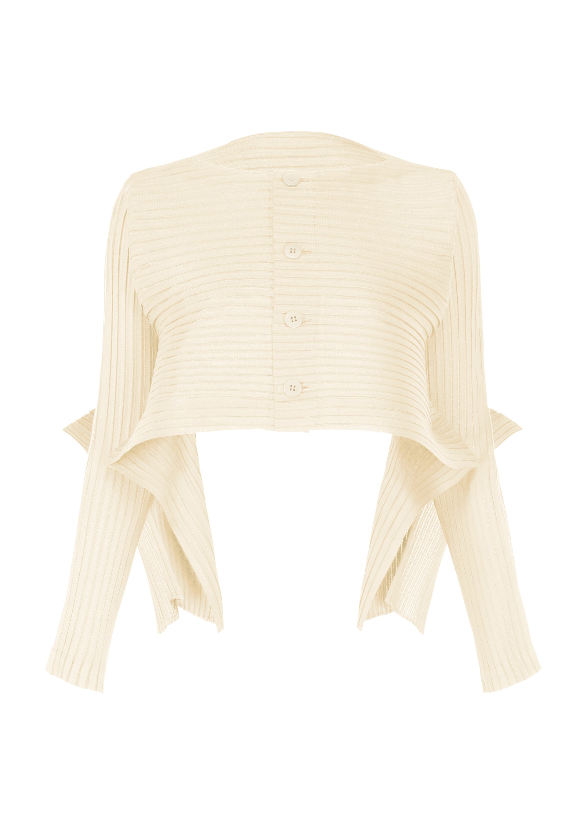 Paneled Pleats Cardigan This pleated series features bouncy horizontal pleating with an elegant shine. The lightweight material has a subtle sheerness and a dynamic, bouncy movement during wear. This cardigan has a wide, cropped silhouette and a button down closure. Material: 100% Polyester Made in Japan |