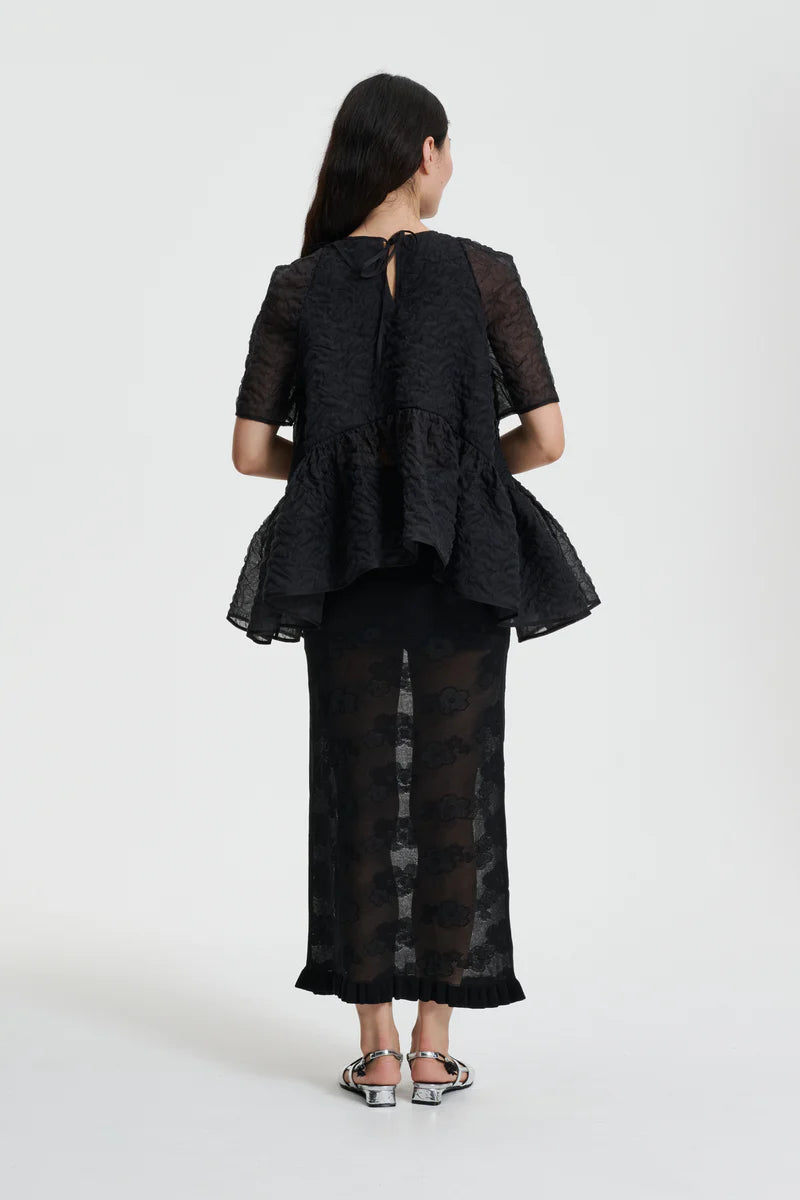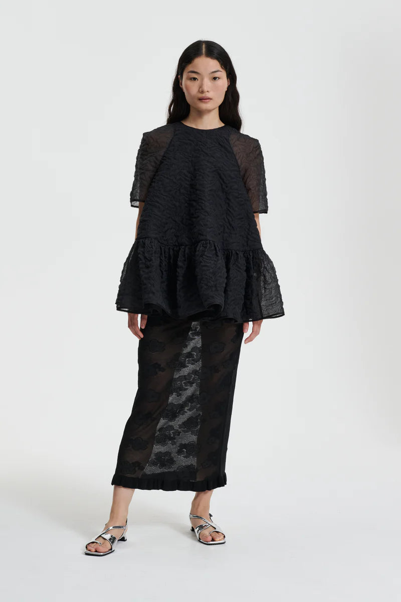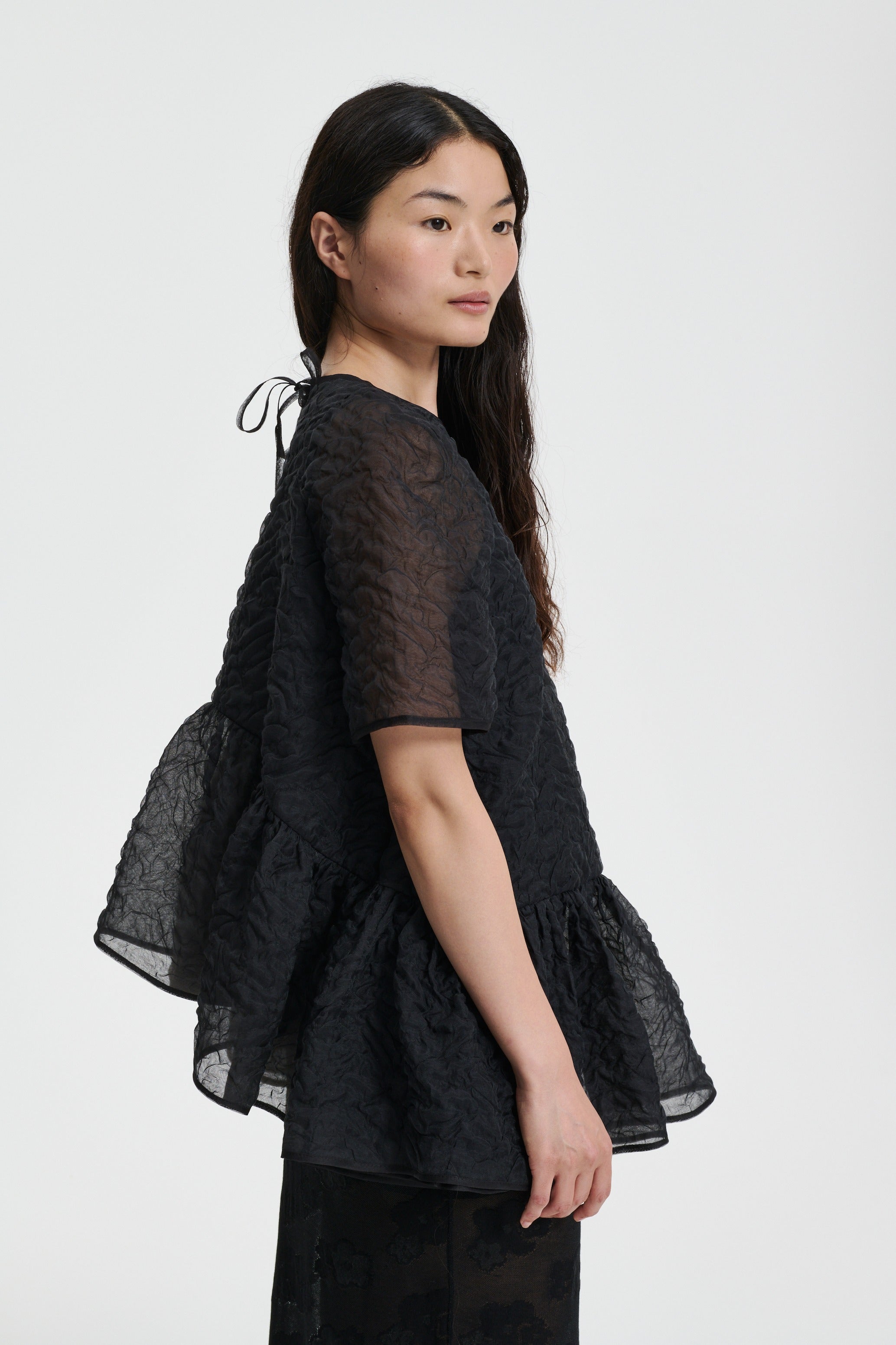 INFO Sculptural yet lightweight, the Susi top. Cut from an airy nimbus matelassé, the shift t-shirt drops into a signature peplum. Lined at the bodice, narrow shoulders and a rounded neckline make it an easy staple, finished with a delicate bow in the back. |