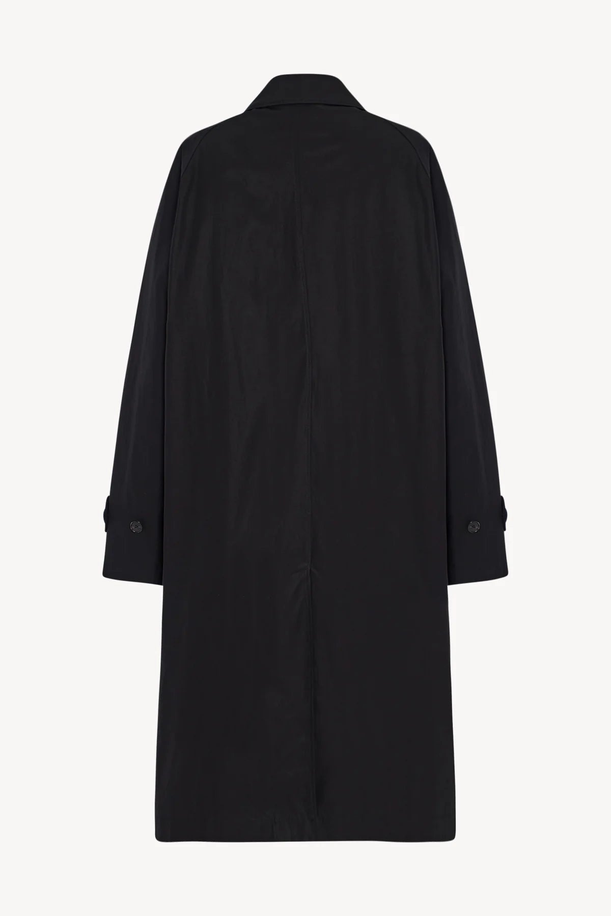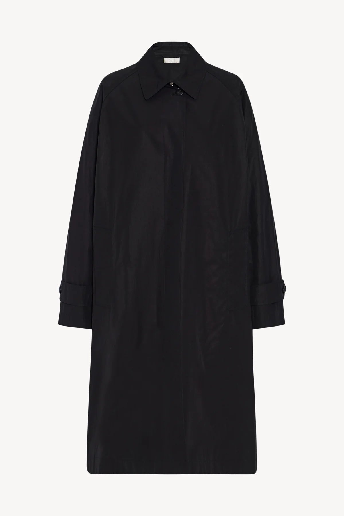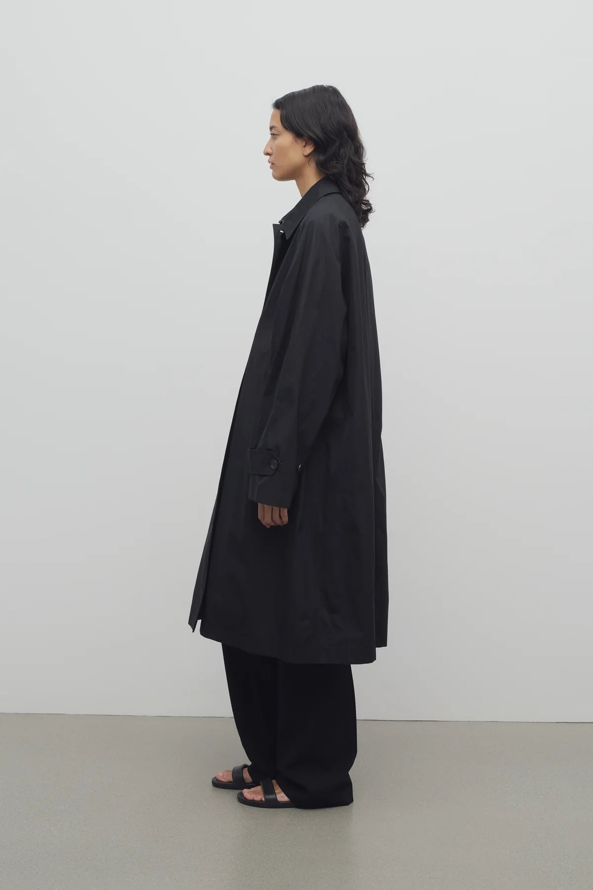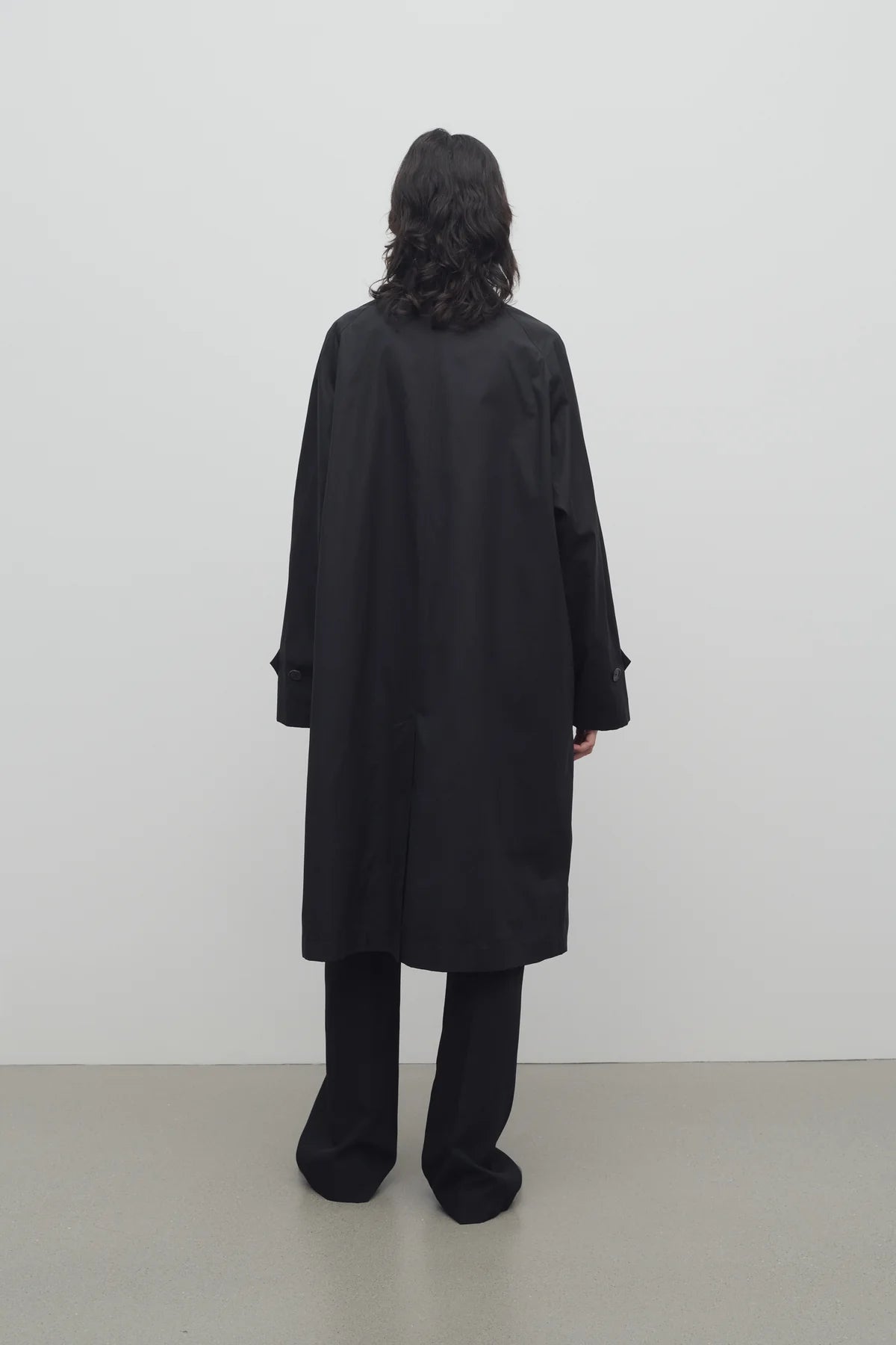 INFO Single-breasted car coat in Pima cotton poplin with raglan sleeves, front welt pockets, and concealed front placket with horn button closure. |