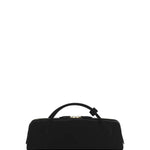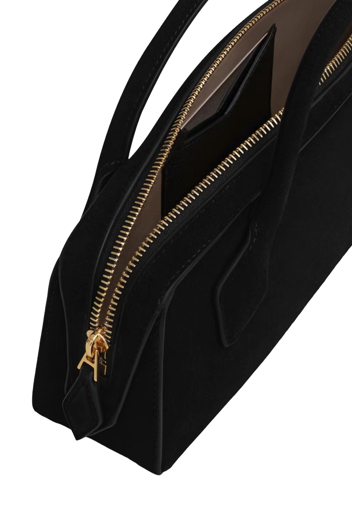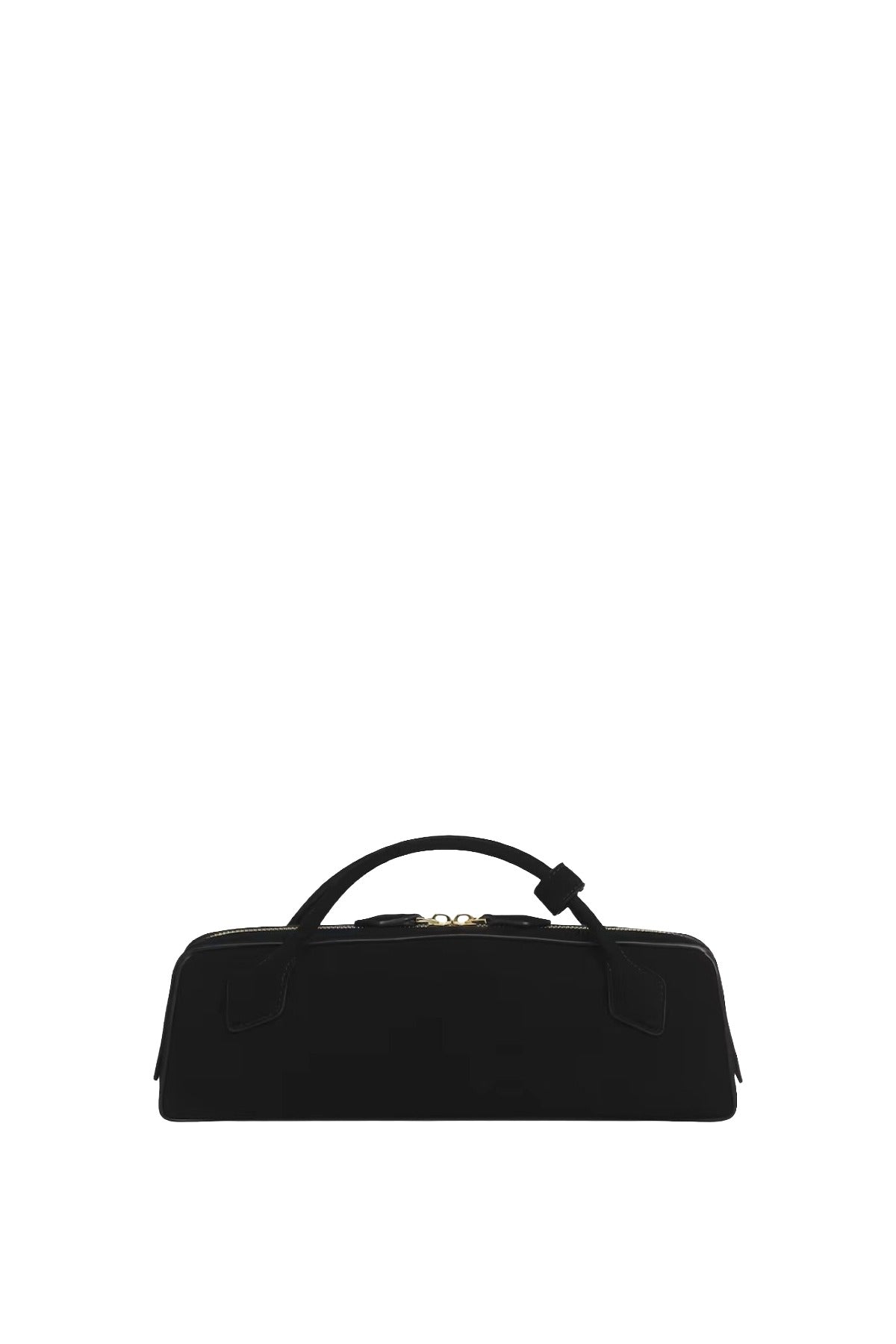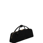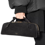 | The clutch version of the emblematic Le Teckel bag Elongated shape, tubular short handles with decorative ties, double zip closure, small removable mirror on the inside pocket Hand carry Suede goatskin leather Dimensions (cm) : L 31 X H 10 X D 7 |