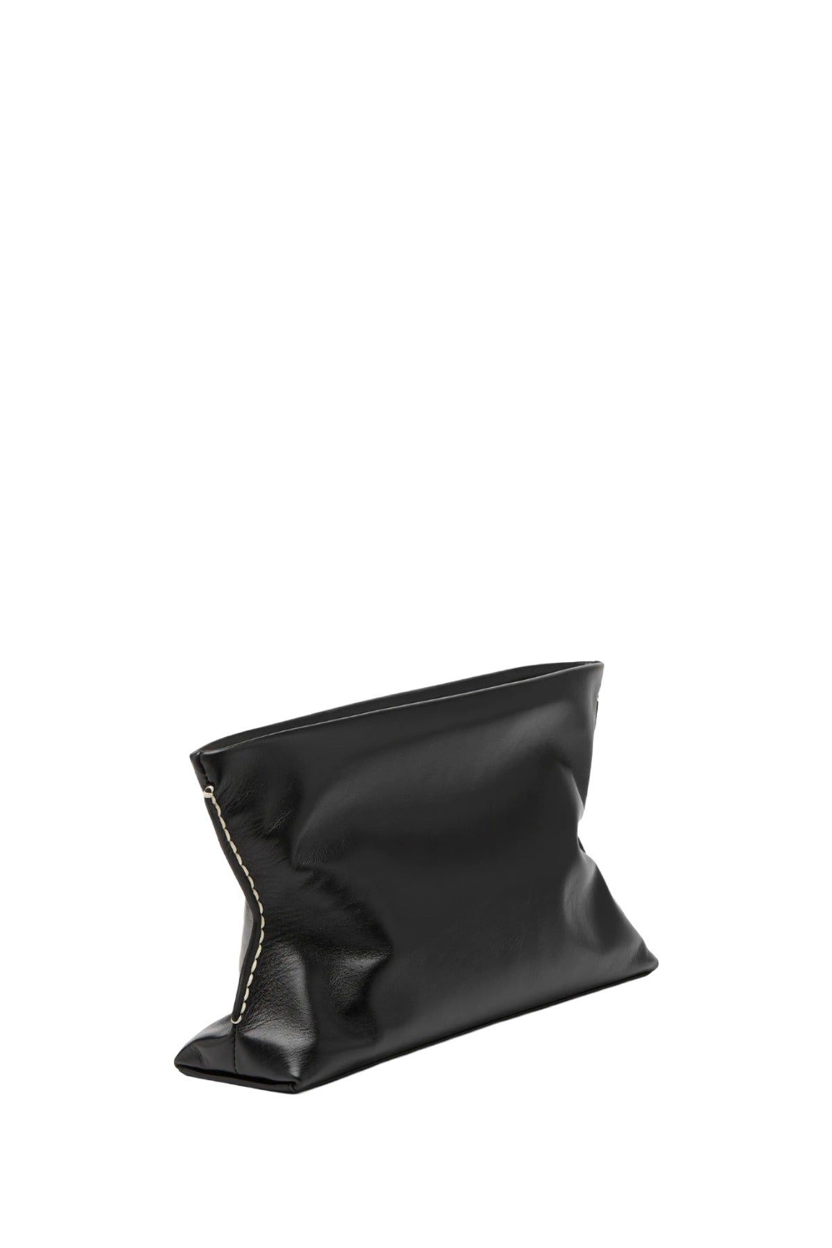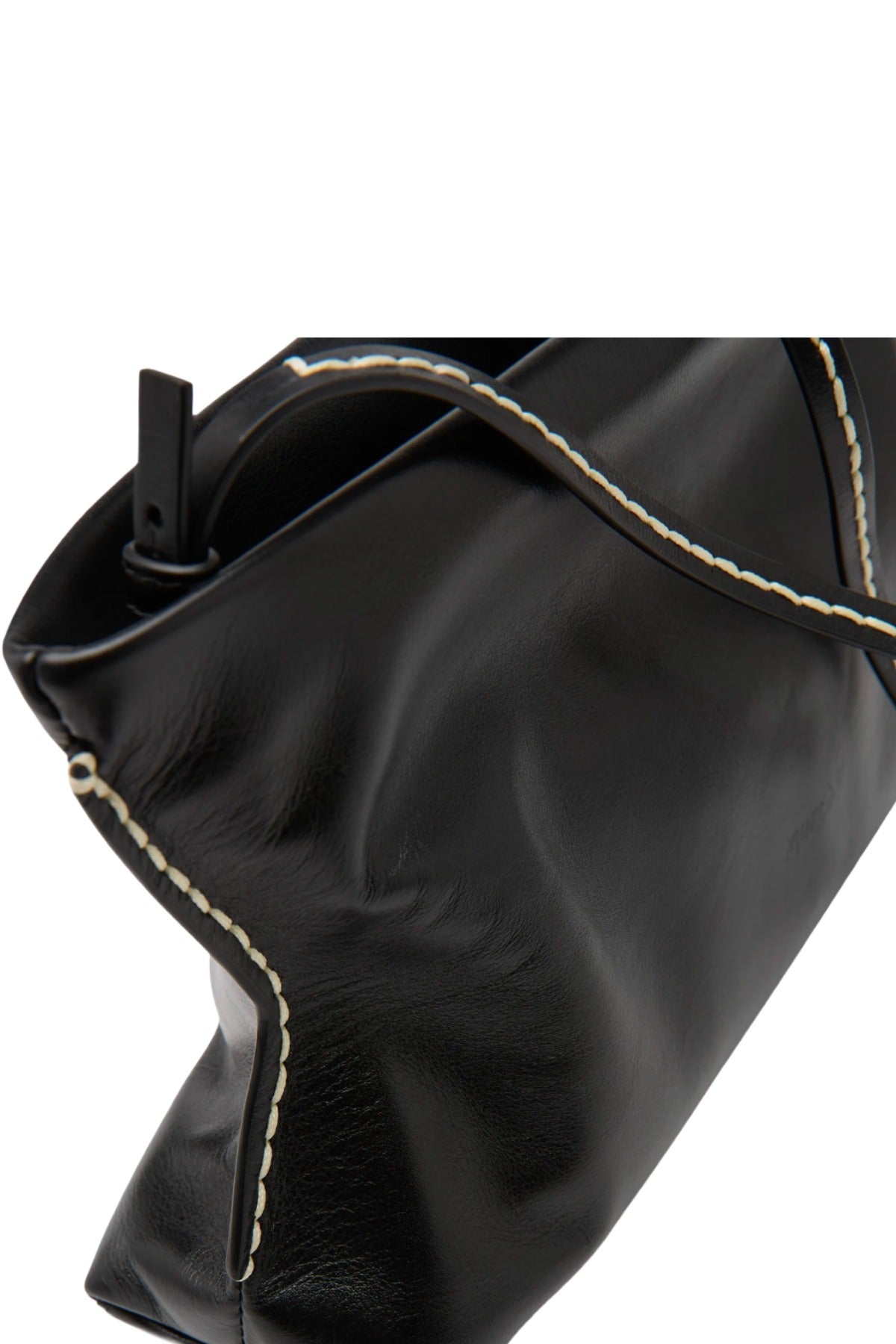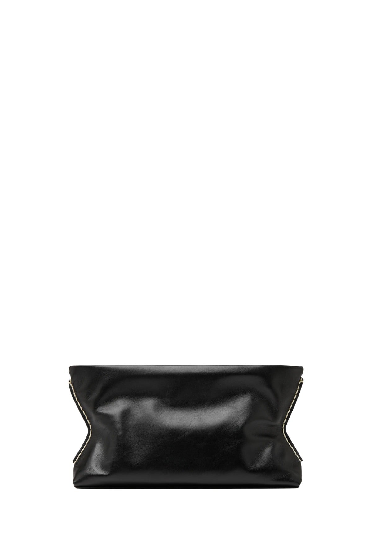 Marsell Leather Dipi Filo Handbag is part of the Spring 26 Collection. Dipi Filo Clutch in shiny smooth leather is an evolution of the Drome bag, the new Dipi reinterprets the Diessepi clutch in a more compact version. Its hourglass shape and removable shoulder strap are enhanced by the contrasting stitching, made entirely by hand. This craftsmanship requires time and precision, highlighting the sculpted sides and essential design of the bag.