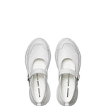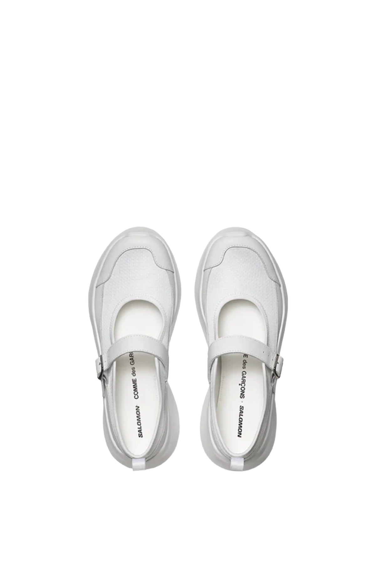 INFO Comme des Garçons in collaboration with Salomon white mary jane style sneaker with a rounded toe and platform sole in technical fabric. Features a branded silver-tone buckle fastening, pull tab at heel and a treaded rubber sole. Platform sole COMPOSITION Upper: Synthetic |