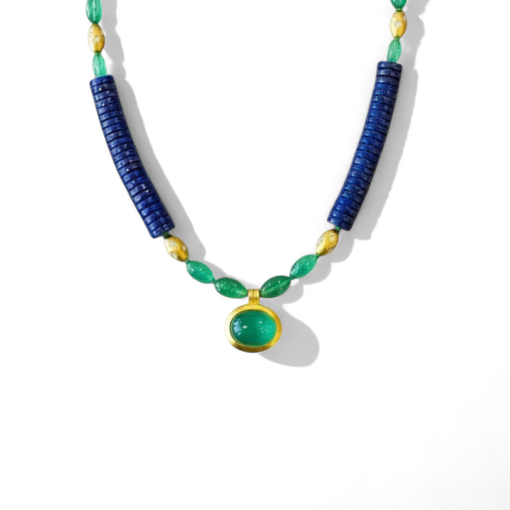 Darlene de Sedle 18" Lapis Heshi Necklace with Emerald Cabachon Pendant and Emerald, 22K Yellow Gold and Diamond Football Nuggets