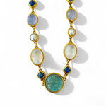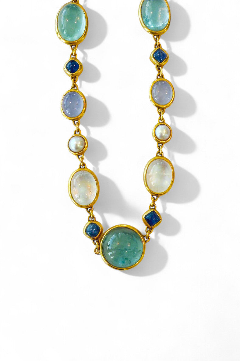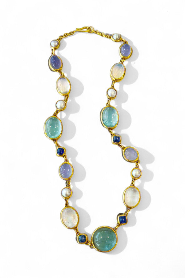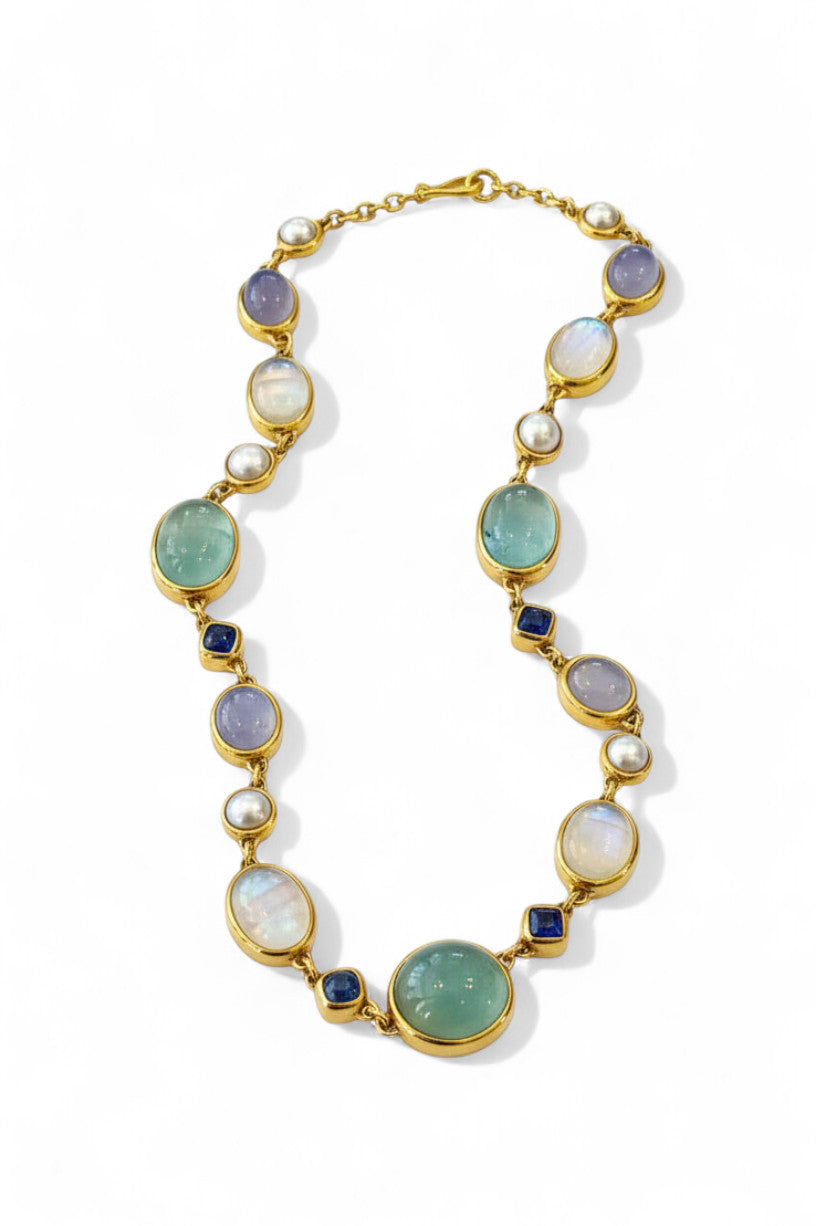 Darlene de Sedle 22K Yellow Gold Linked Necklace With Rainbow Moonstone, Sapphire, Chalcedony, and Pearls