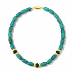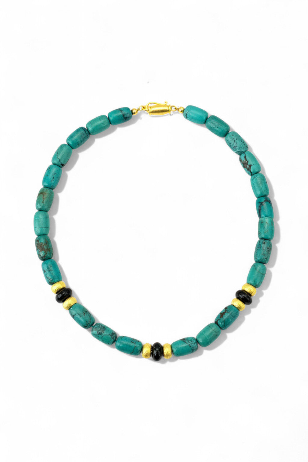 18" Turquoise Barrel Bead Necklace with Onyx and Yellow Gold Rondels