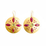22K Yellow Gold Sheet Discs with Marquis Shaped Cabochon Rubies, Faceted Rubies, and Cabochon Peridot