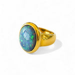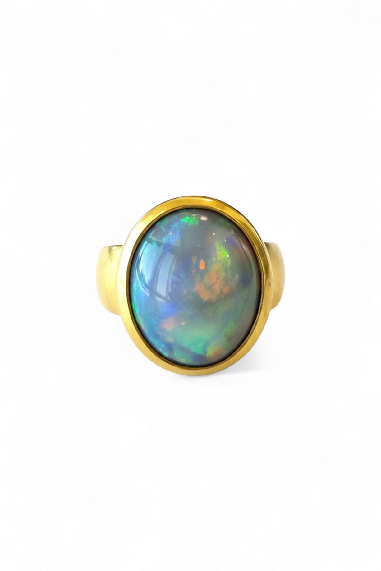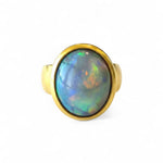 A mesmerizing statement of depth and color, this Darlene de Sedle ring features a vibrant 9.69-carat black opal set in rich 22K yellow gold. The opal’s shifting flashes of blue, green, and fire are beautifully intensified by the warmth of high-karat gold, creating a piece that feels both ancient and electric. Handcrafted in Darlene’s signature artisanal style, it’s a rare jewel meant to be treasured for generations.