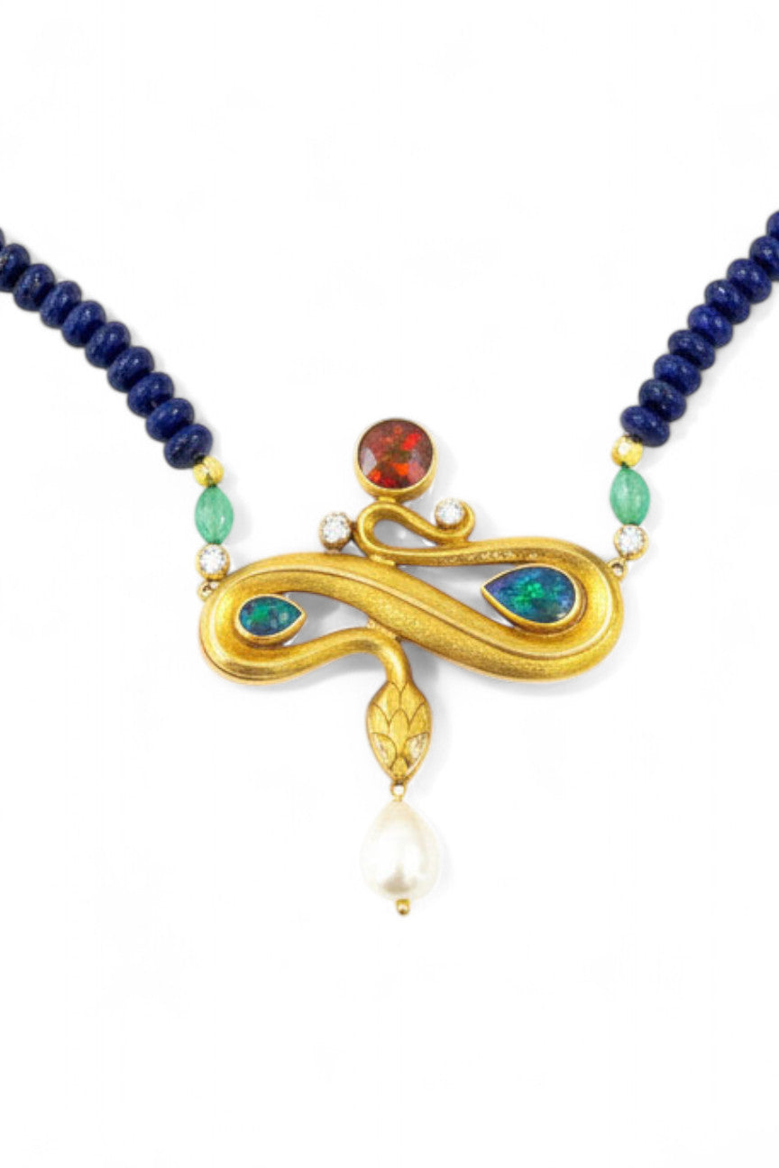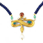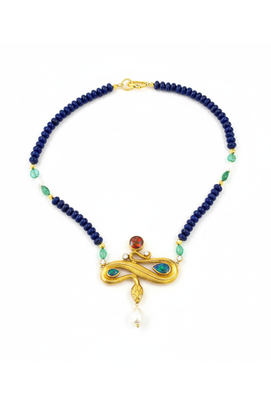 Darlene de Sedle Lapis Necklace with Gold Snake Pendant with Doublets, Pearls, and Diamonds