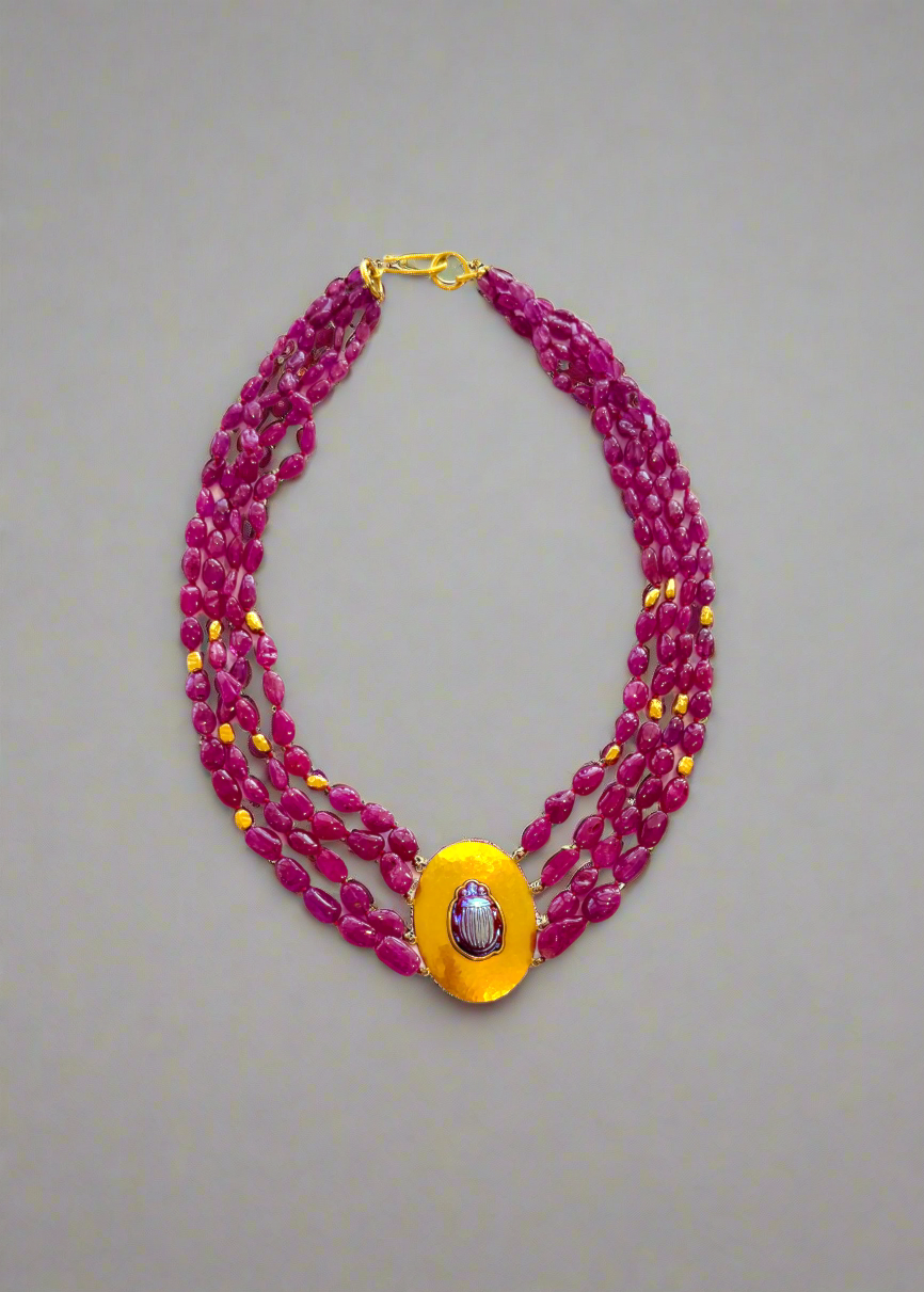 Darlene de Sedle 4 Strand Ruby Necklace with Large Gold Scarab