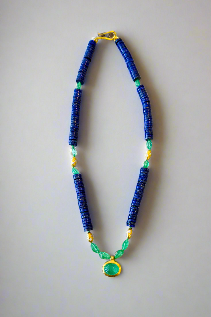 18" Lapis Heshi Necklace with Emerald Cabachon Pendant and Emerald, 22K Yellow Gold and Diamond Football Nuggets