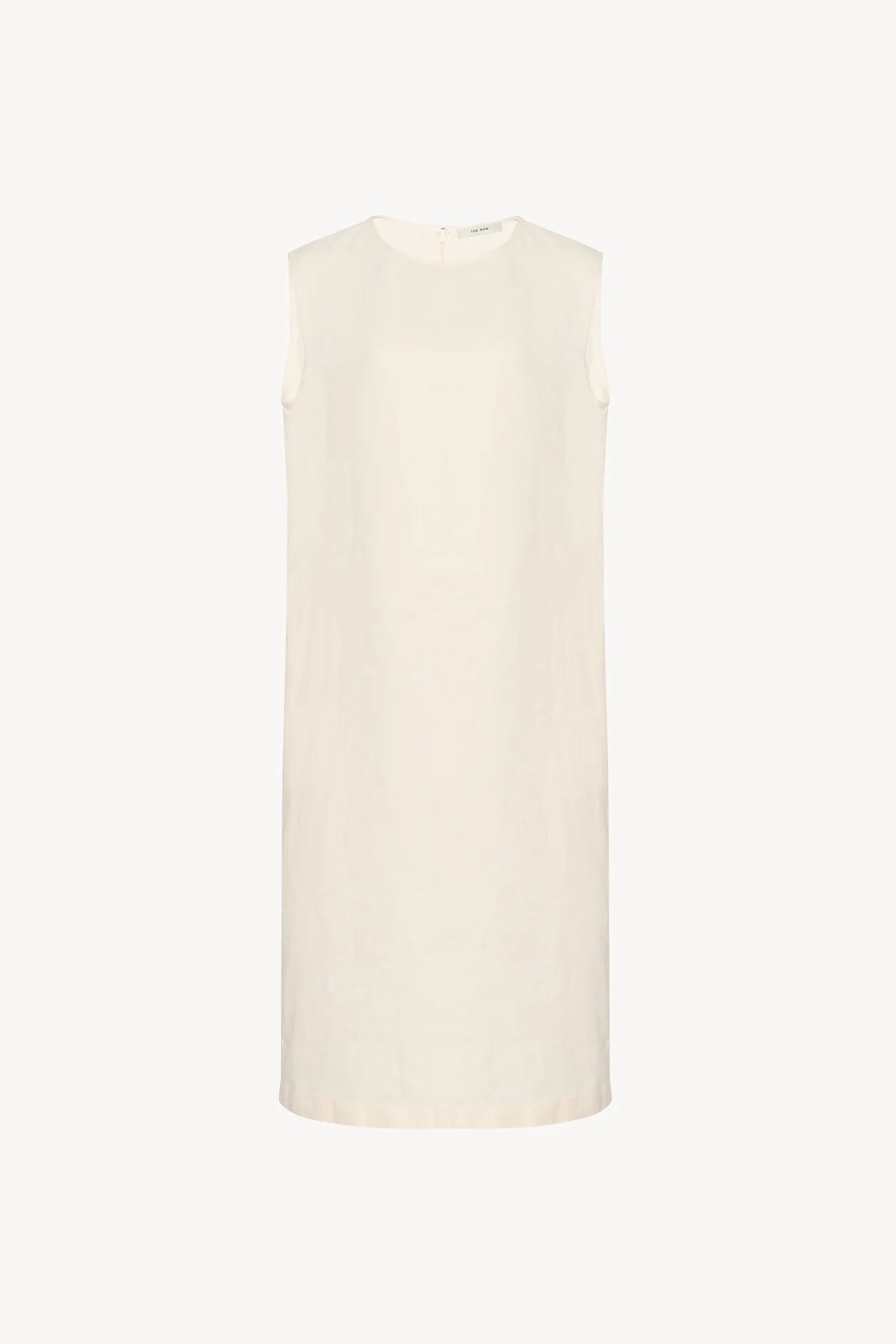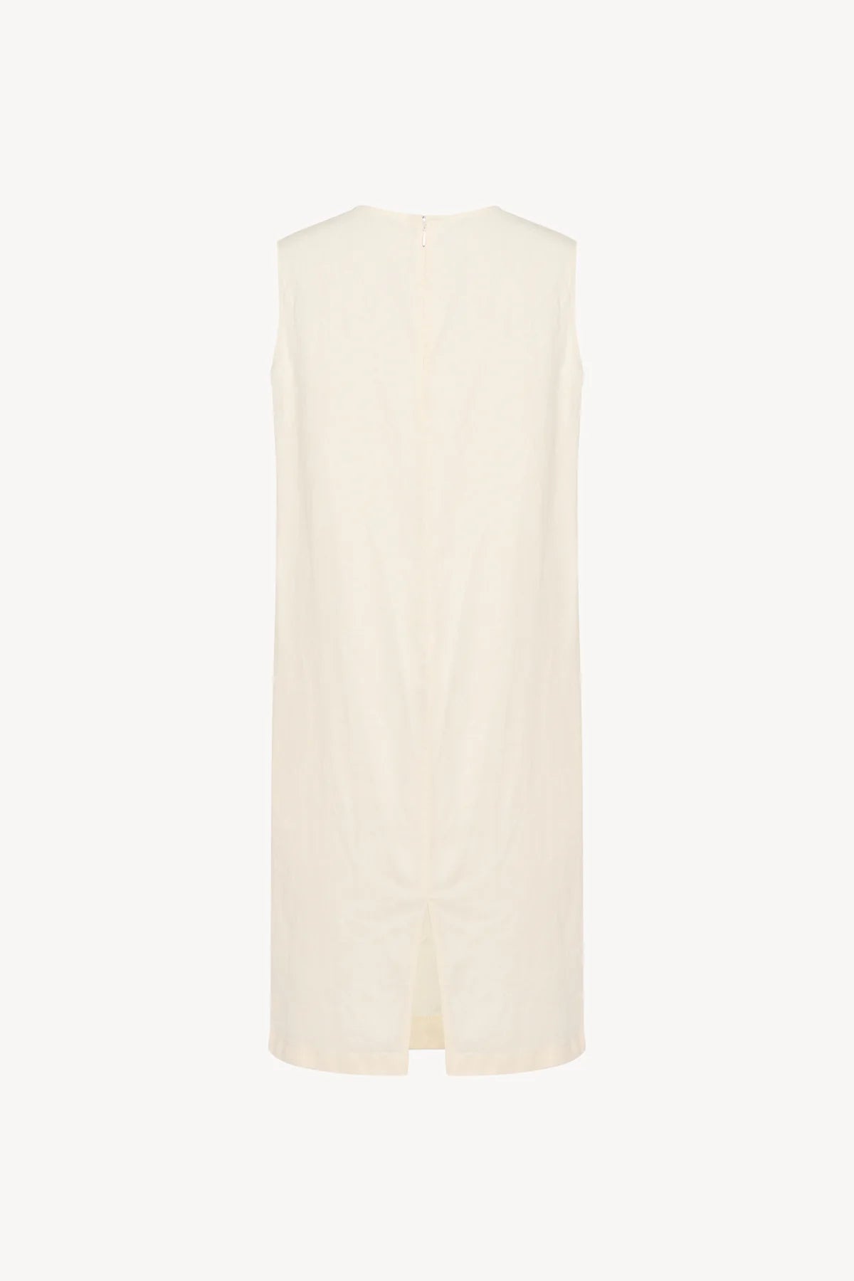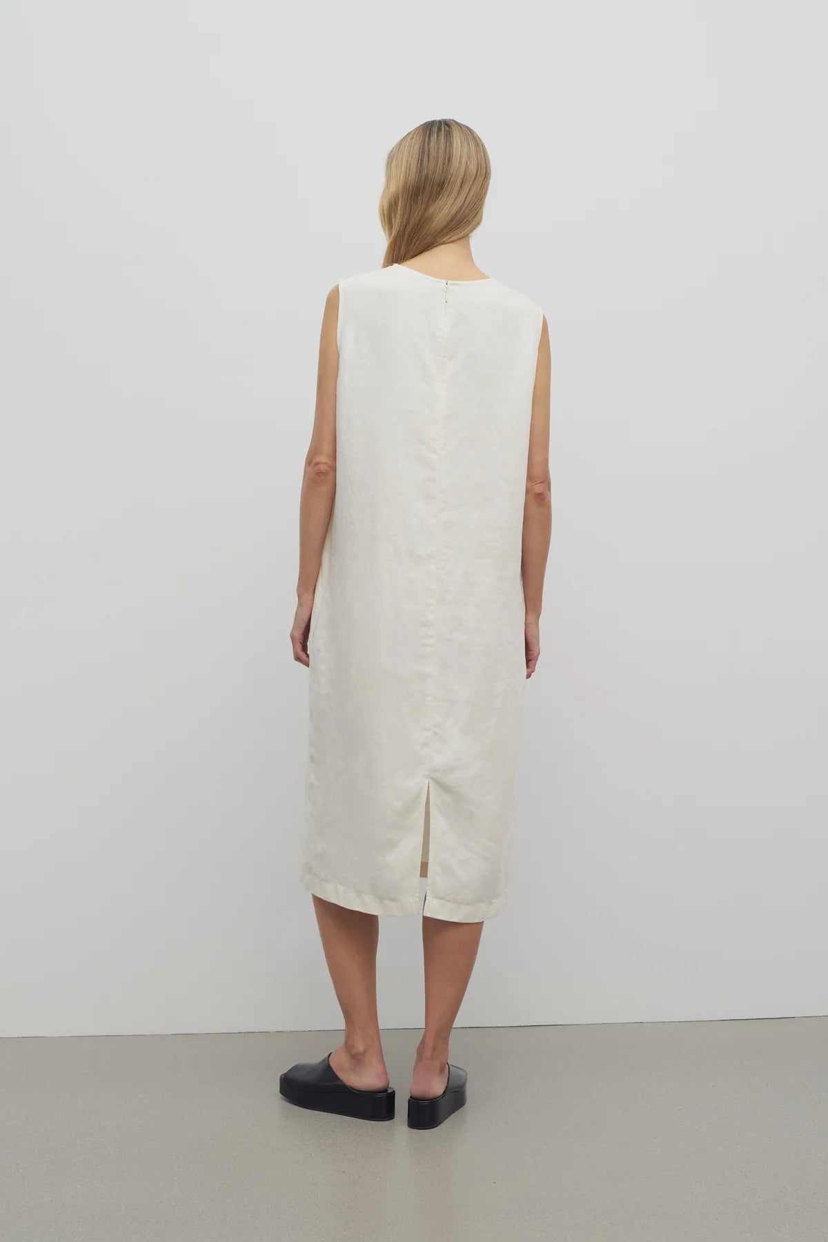 INFO Sleeveless mid-length dress in soft linen denim with rounded neckline and straight fit. |