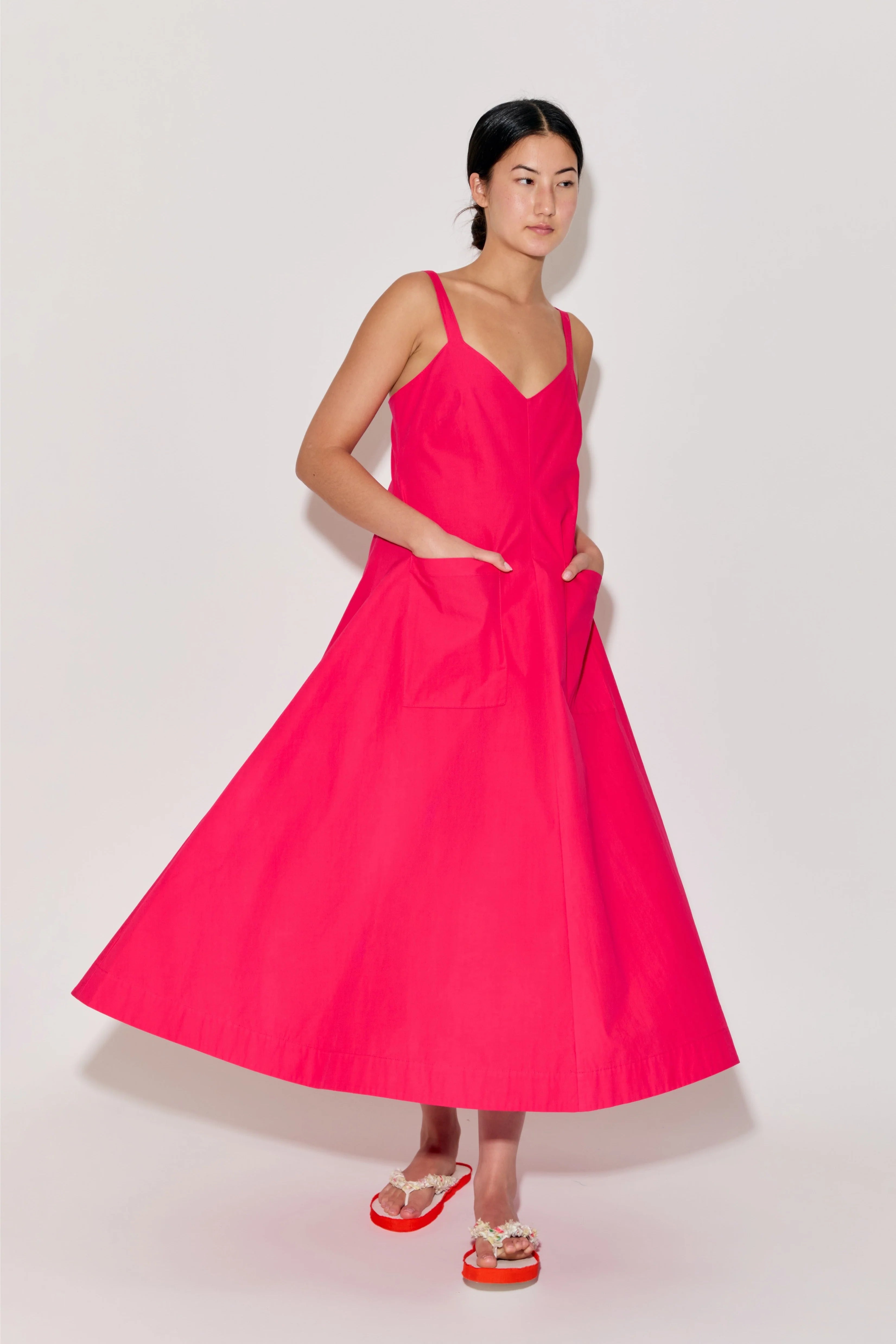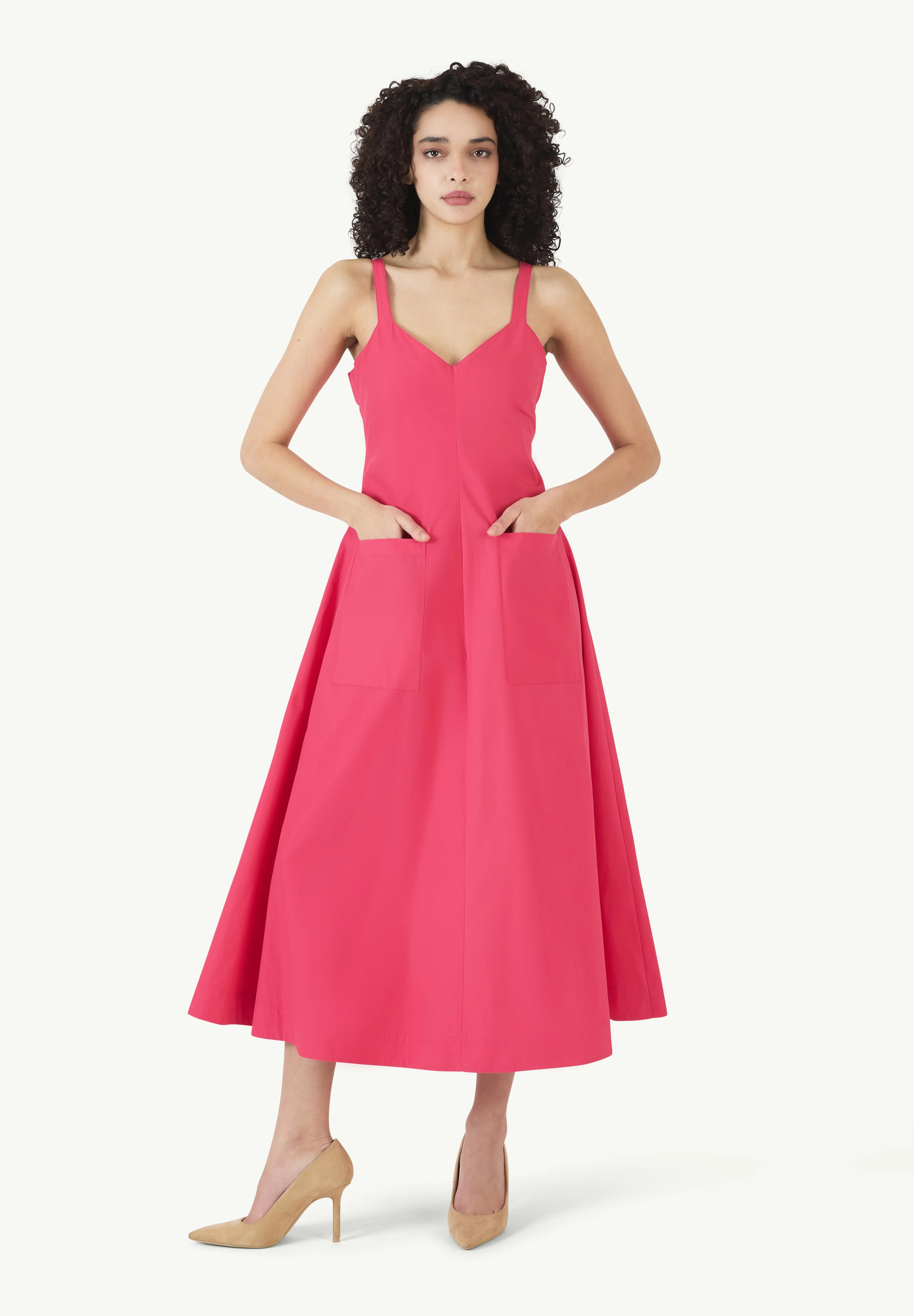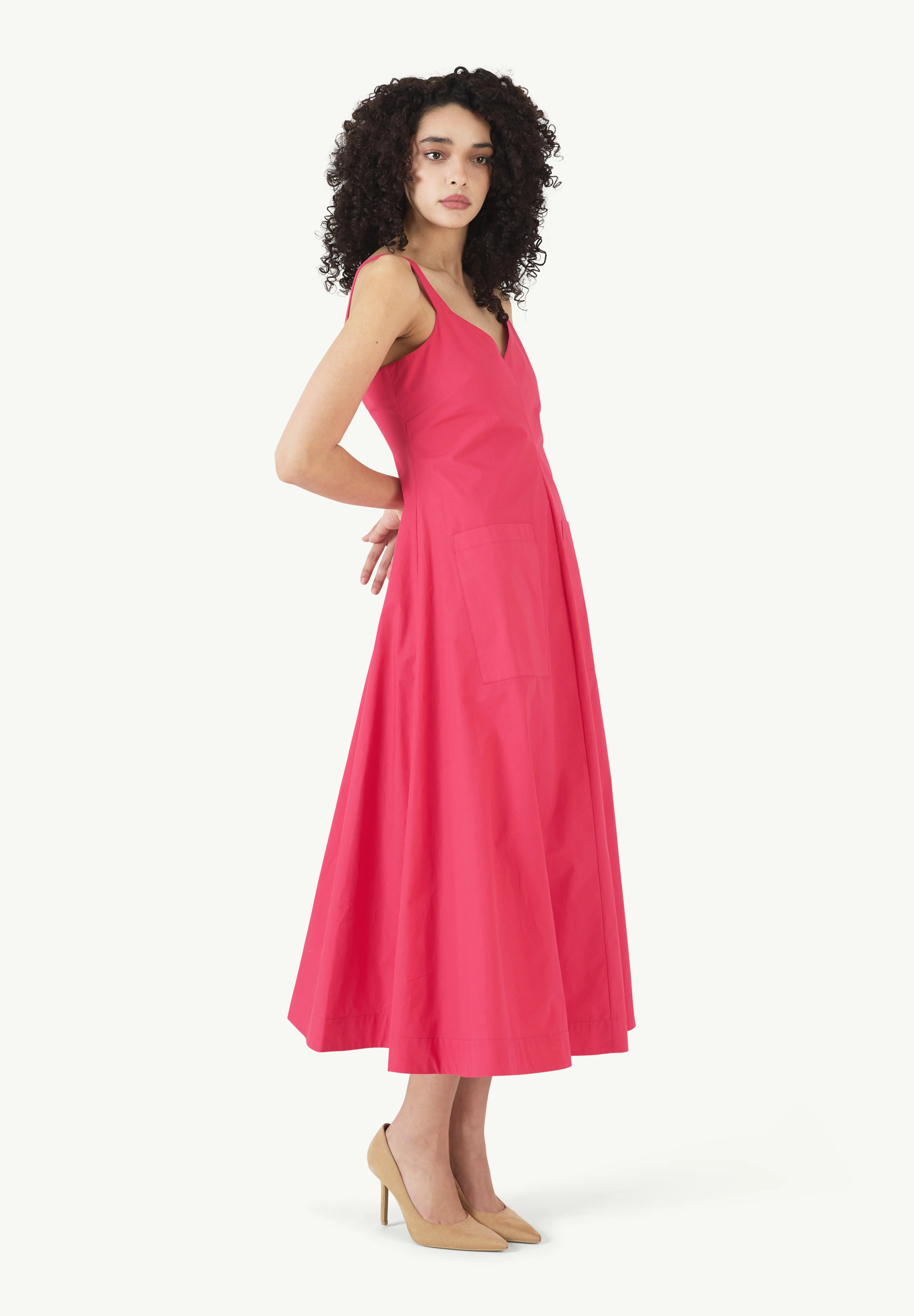 INFO The Pocktail Dress in Cotton Poplin in Magenta is a vibrant, effortlessly chic piece with a flattering A-line silhouette. Its structured yet lightweight fabric makes it perfect for both casual outings and dressed-up occasions. Plus, the pockets add a practical touch! Pair it with statement sandals or heels for a polished look, and accessorize with bold earrings to enhance its playful elegance. |