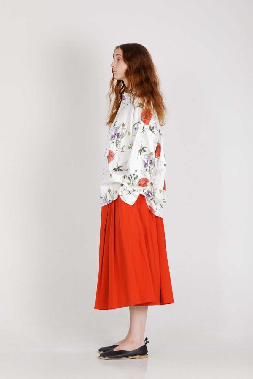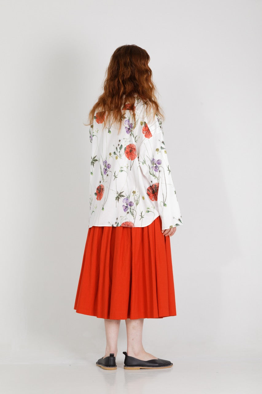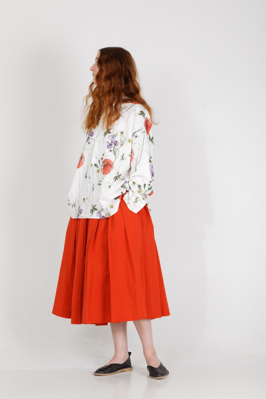 Solange Cotton Poplin Skirt - Red School-uniform-inspired pleated midi skirt.Box pleats and gathers at the waistline, creating a voluminous silhouette. Elasticated waist, adjustable with inside drawstring. Concealed pouch pockets in the side seams. Crisp, silk organza, with a flower print inspired by natural, pressed flowers. Lined with soft, lightweight cotton fabric. Measurements Material : Washed Cotton Poplin Composition : 100% Cotton Country of origin : Made in France |