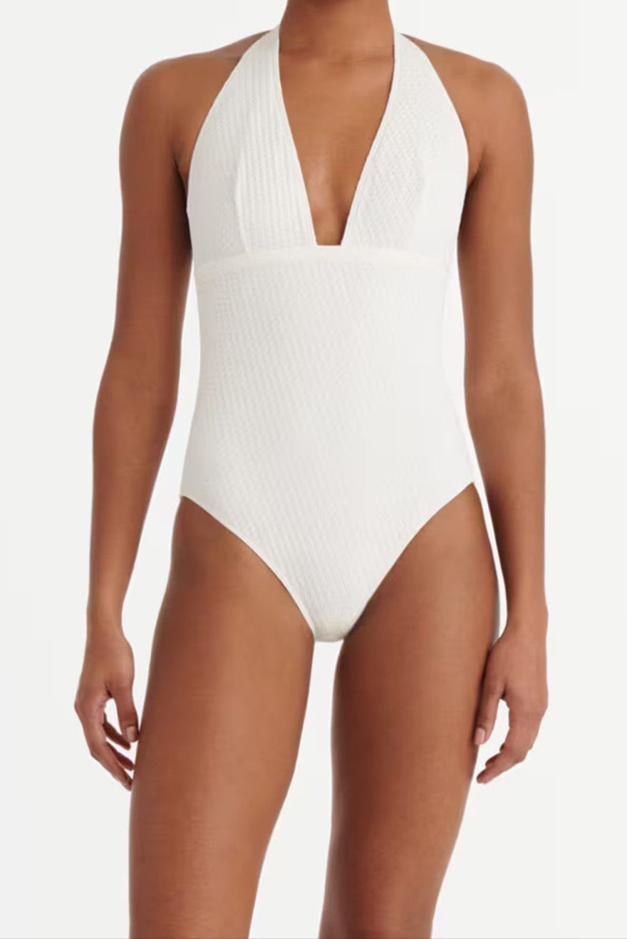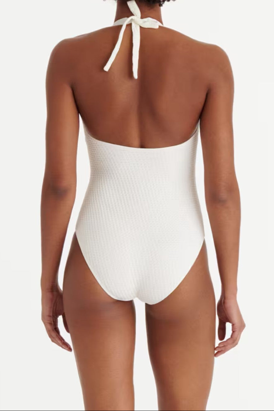 Graphic and feminine, the jacquard Paillette swimsuit features an elegant V-shaped neckline as well as a grosgrain underbust band for a retro feel and extra support.