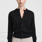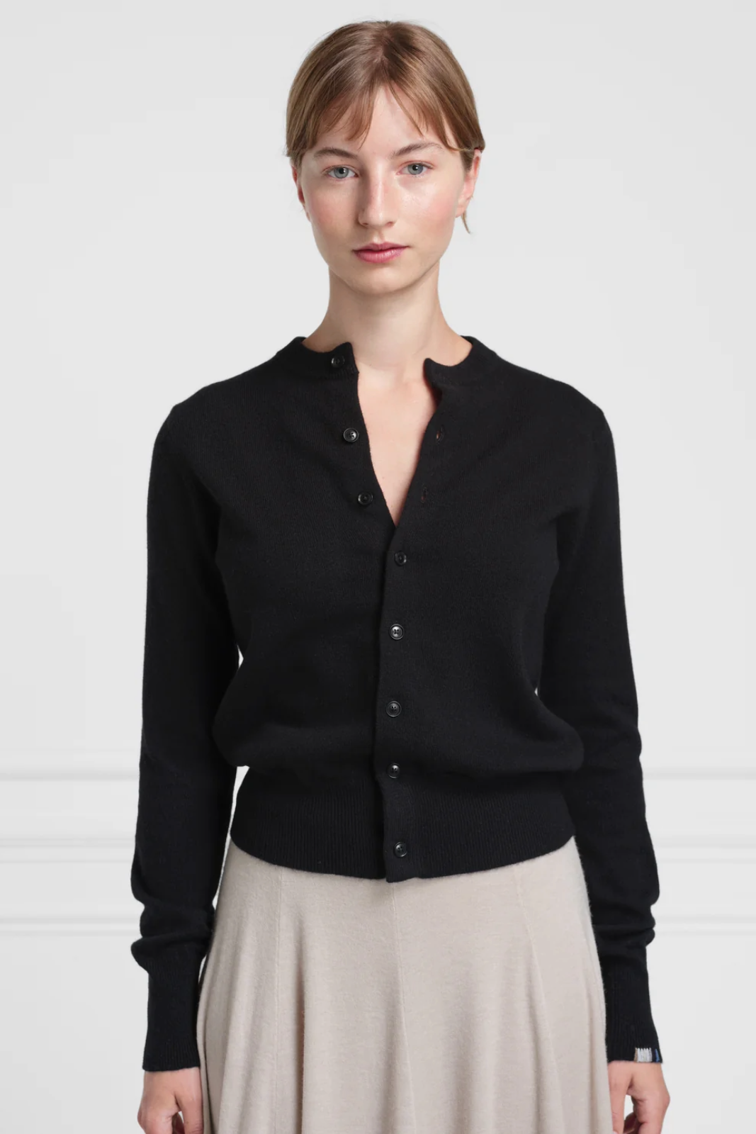 classic cashmere crew-neck cardigan with eight buttons and a petite fit. the buttons are made of highly durable corozo, a completely natural, chemical-free material derived from the seed of a palm tree.