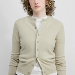 | INFO classic cashmere crew-neck cardigan with eight buttons and a petite fit. the buttons are made of highly durable corozo, a completely natural, chemical-free material derived from the seed of a palm tree. |