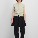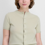 | INFO the flyer is a classic button-down cardigan with a summer twist, featuring short sleeves and ribbed waistband details. this crewneck cardigan comes in a lightweight cashmere knit and with 8 corozo buttons. its petite fit is similar to the little 2 cardigan.  |