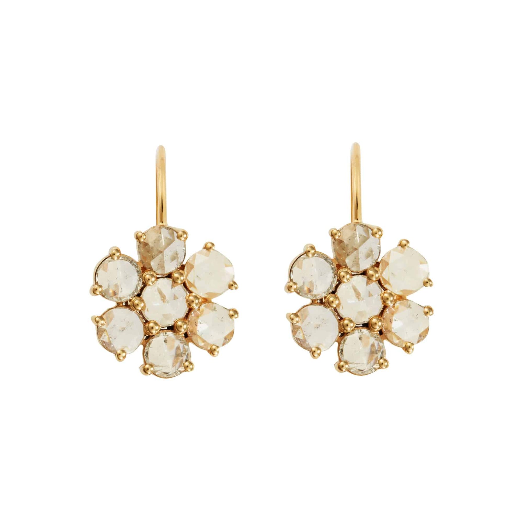 Handcrafted from 18k yellow gold, these delicate Daisy bloom earrings are adorned with Light champagne Rose cut diamonds