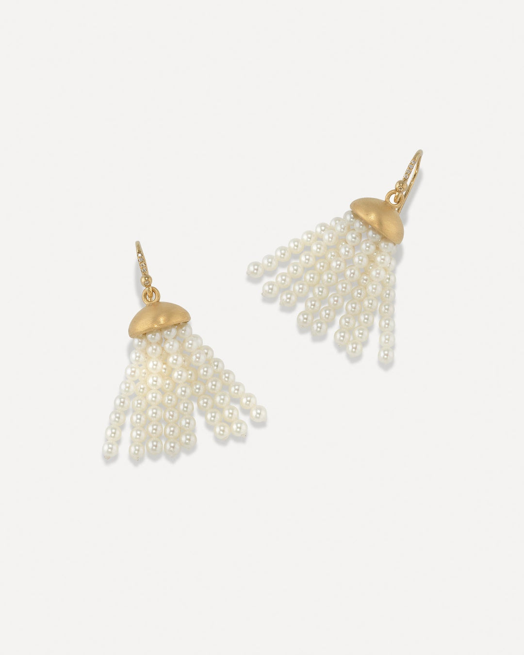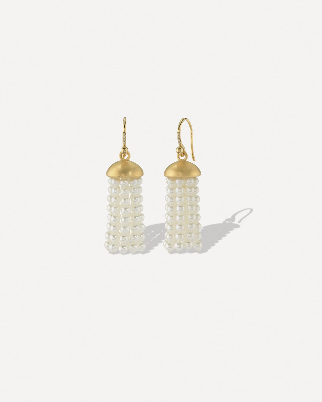 18K Yellow Gold Short Tassel Earrings from Irene Neuwirth with Akoya Pearl Strands on Diamond Pavé Earwire (0.03cts)