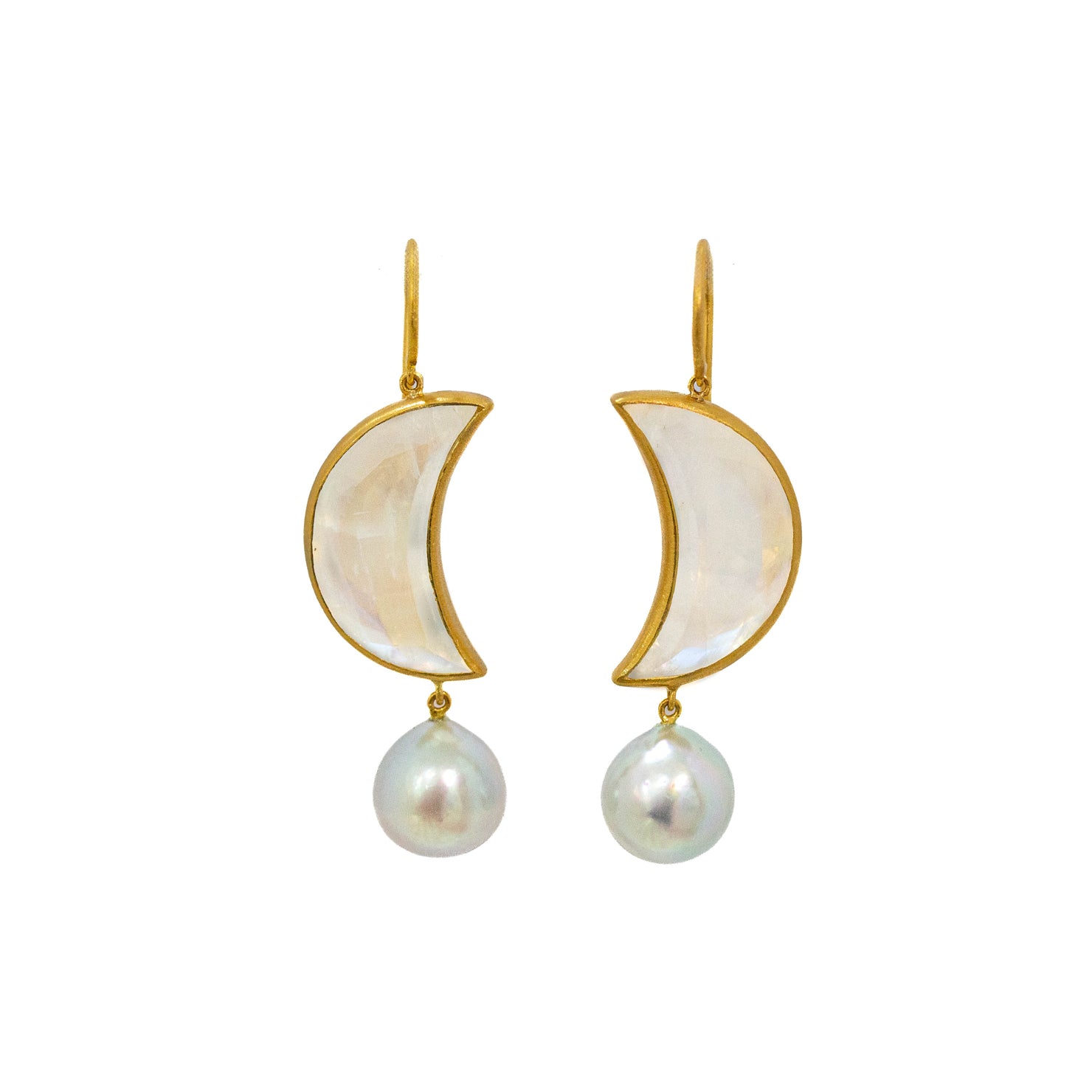 22K Yellow Gold Rainbow Moonstone and Pearl Moonlight Earrings |