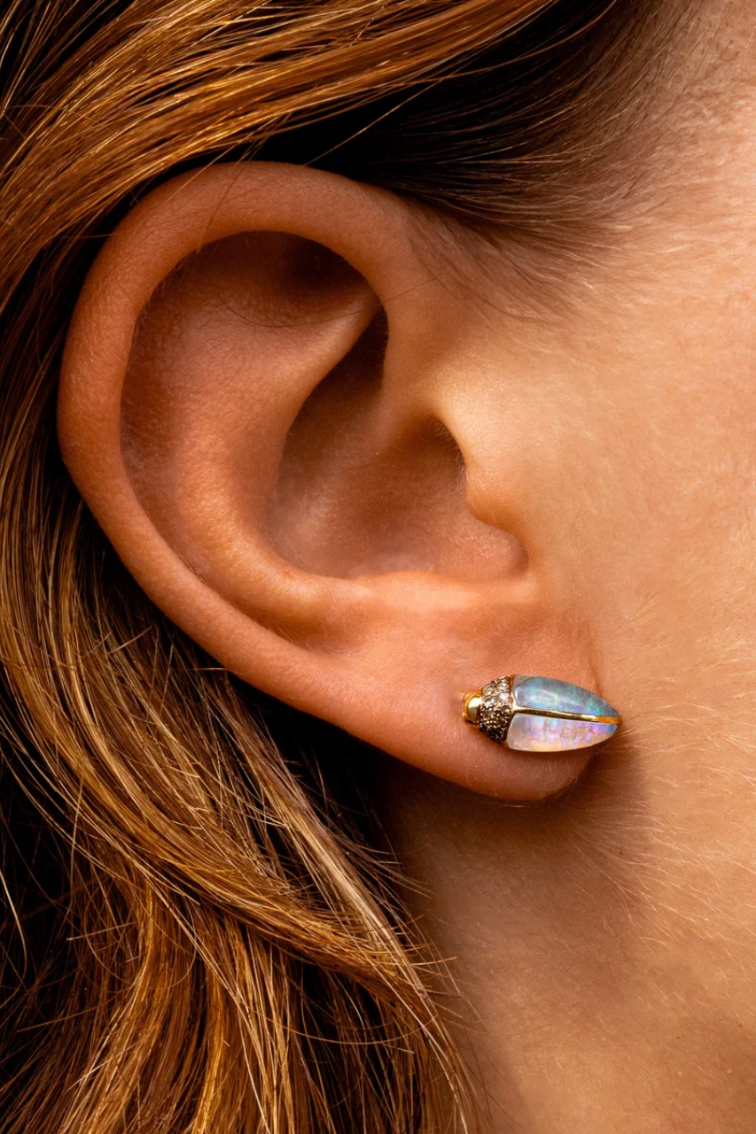This elegant mini scarab stud is meticulously crafted in 18K yellow gold and 18K pure white gold, showcasing a captivating blend of luxurious materials. The stud features a brilliant white opal and white quartz, radiating an enchanting play of light and color. Accented with sparkling brown diamonds, this earring exudes an elegant yet mystical allure. Perfect for wearing alone or as a part of a curated ear stack, this piece is a refined addition to any jewellery collection.