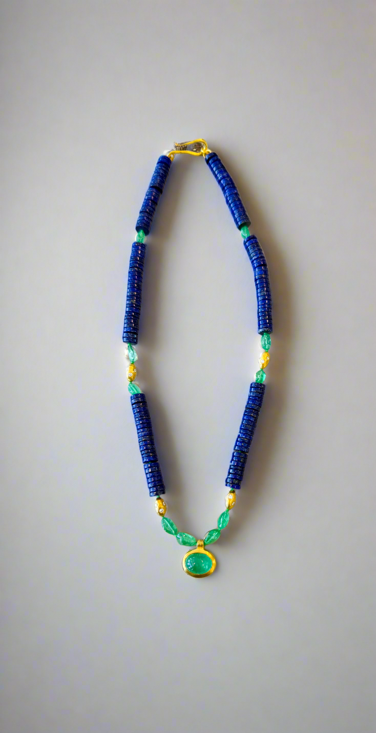 18" Lapis Heshi Necklace with Emerald Cabachon Pendant and Emerald, 22K Yellow Gold and Diamond Football Nuggets