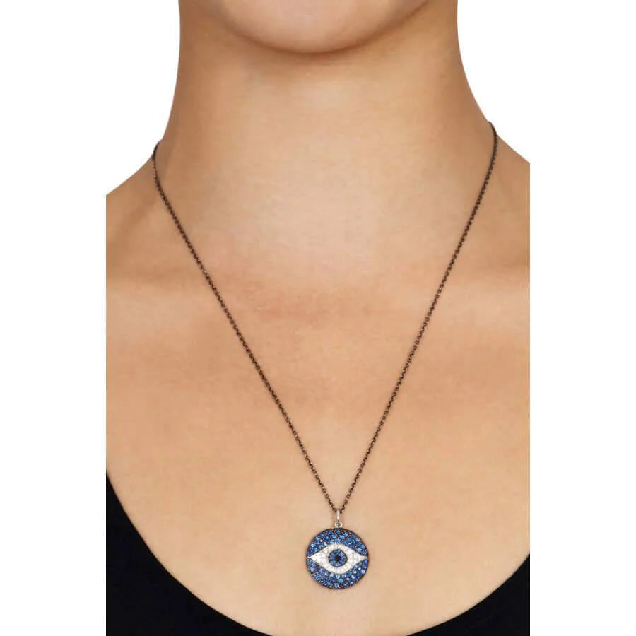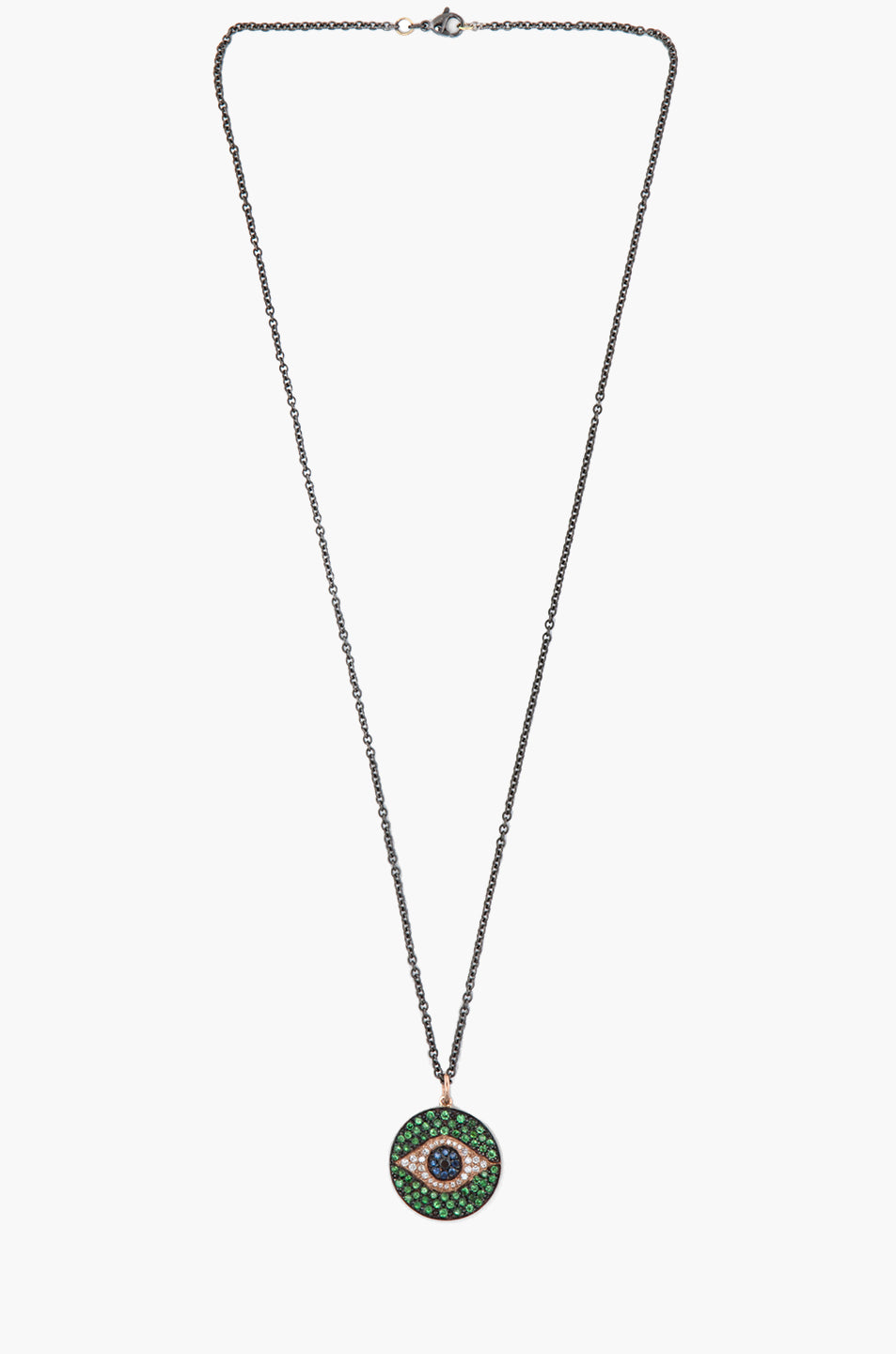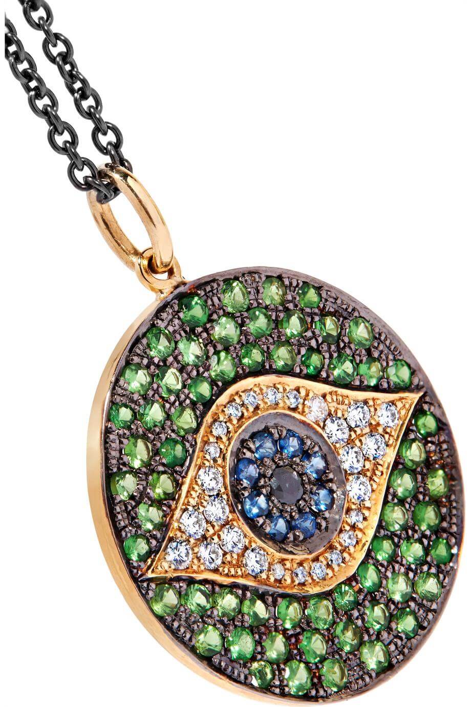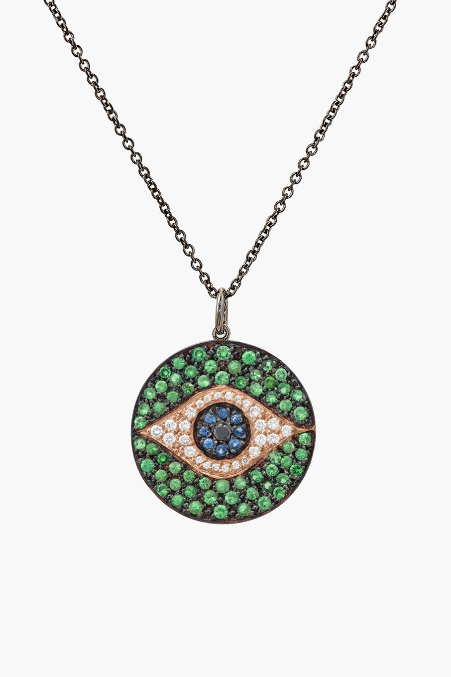 Ileana Makri's iconic Dawn Pendant, Expertly crafted from 18k yellow gold, this timeless piece sparkles with a pavé green Tsavorites, oxidized on the stones to make bring our their vibrant color; white diamond sclera, blue sapphire iris, and a single black diamond pupil center.