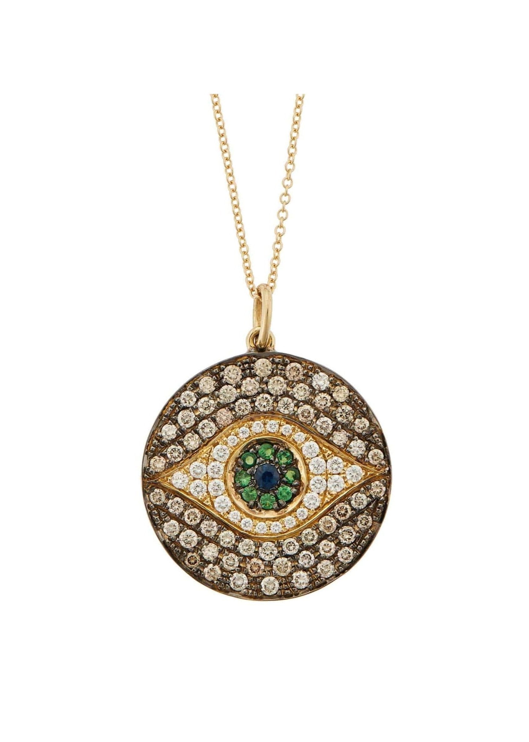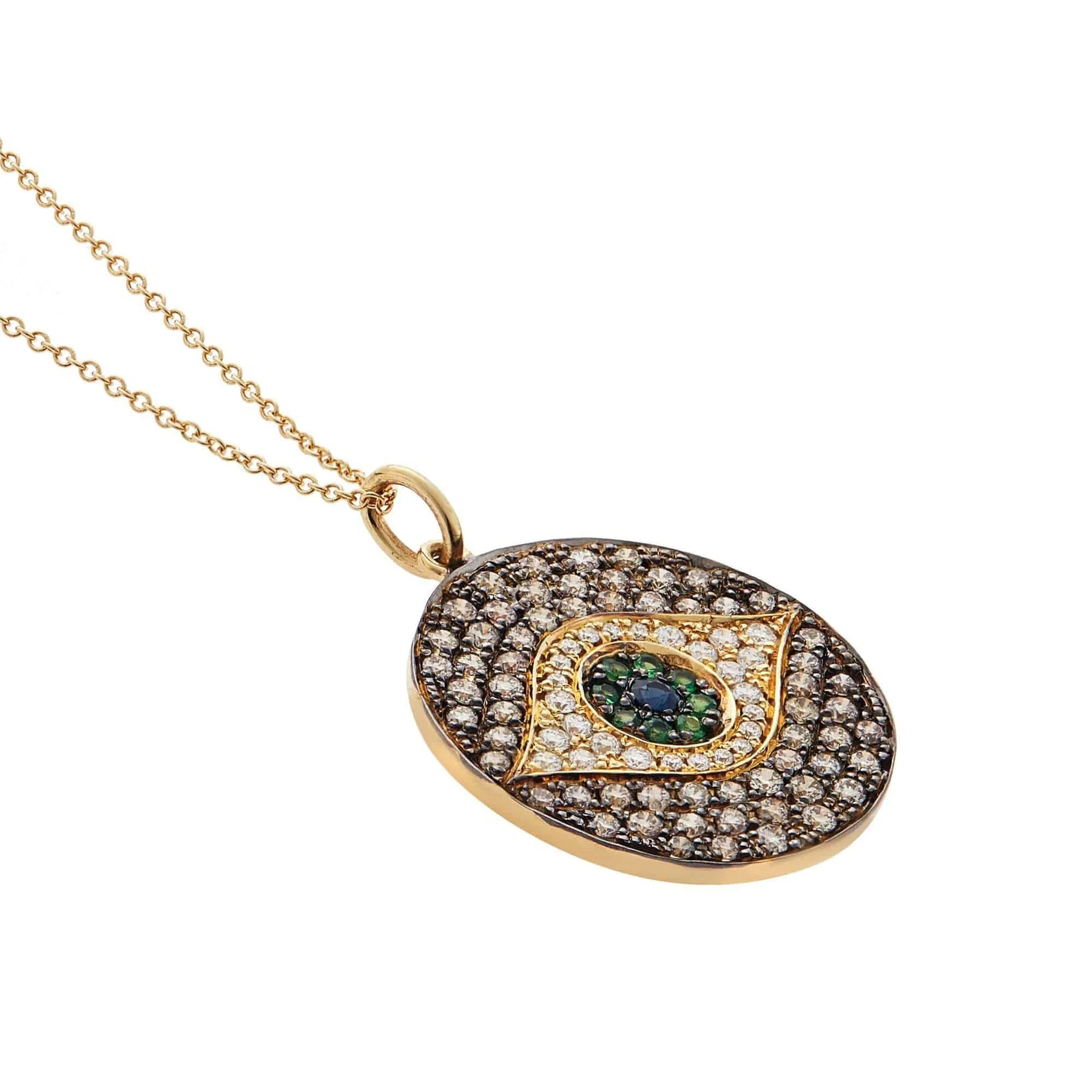 This unique Dawn pendant is handcrafted from polished 18-karat yellow gold and features a luxurious combination of pavé white and champagne diamonds, a center blue sapphire and green tsavorites that are oxidised on the stones to bring out their vibrant colors. A perfect blend of opulence and elegance, this stunning pendant is sure to make a statement.